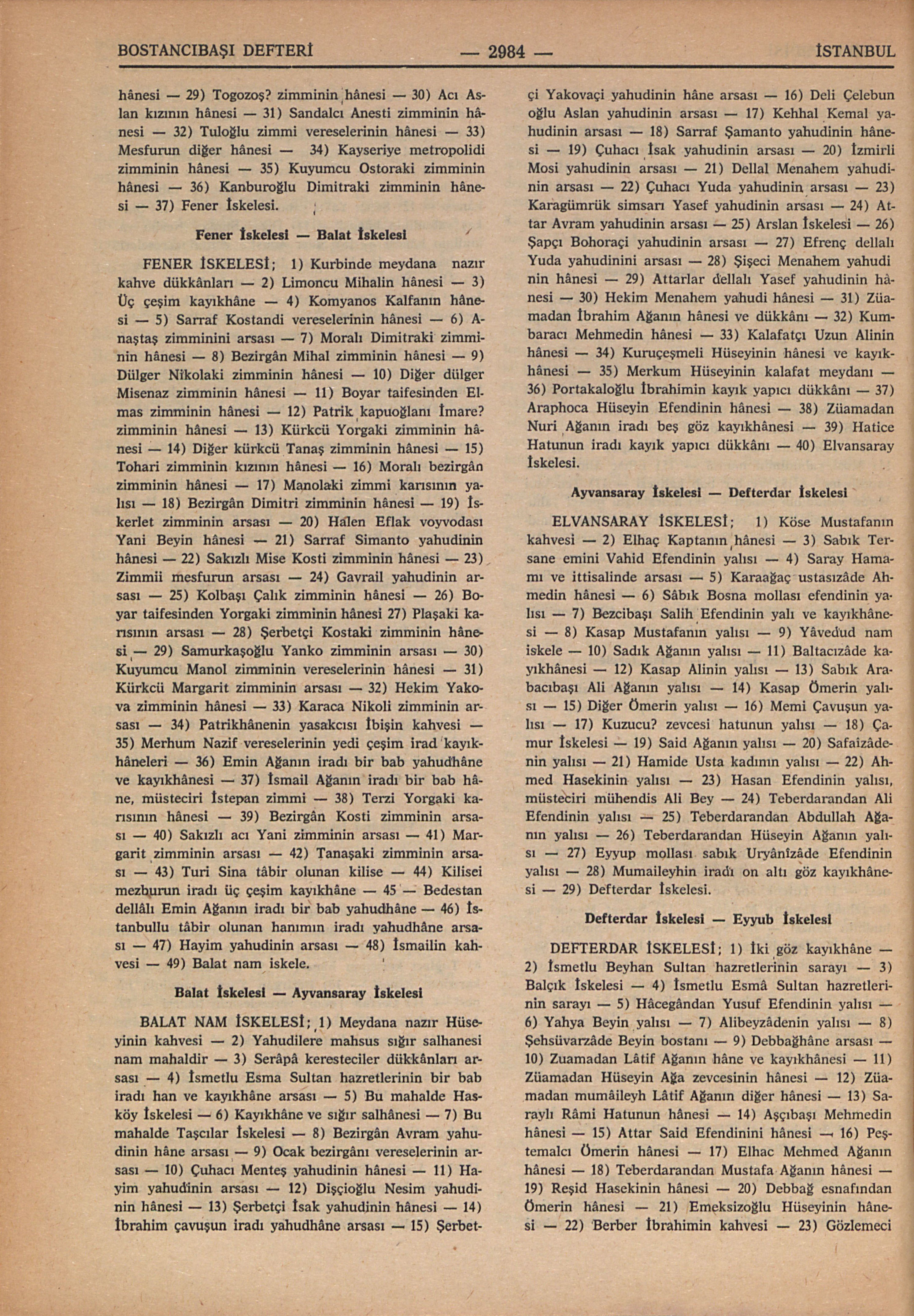 FENER İSKELESİ; 1) Kurbinde meydana nazır kahve dükkânları – 2) Limoncu Mihalin hânesi – 3) Üç çeşim kayıkhâne – 4) Komyanos Kalfanın hânesi – 5) Sarraf Kostandi vereselerinin hânesi – 6) Anaştaş zimminini arsası – 7) Moralı Dimitraki zimminin hânesi – 8) Bezirgân Mihal zimminin hânesi – 9) Dülger Nikolaki zimminin hânesi – 10) Diğer dülger Misenaz zimminin hânesi – 11) Boyar taifesinden Elmas zimminin hânesi – 12) Patrik kapuoğlanı İmare? zimminin hânesi – 13) Kürkcü Yorgaki zimminin hânesi – 14) Diğer kürkcü Tanaş zimminin hânesi – 15) Tohari zimminin kızının hânesi – 16) Moralı bezirgân zimminin hânesi – 17) Manolaki zimmi karısının yalısı – 18) Bezirgân Dimitri zimminin hânesi – 19) İskerlet zimminin arsası – 20) Halen Eflak voyvodası Yani Beyin hânesi – 21) Sarraf Simanto yahudinin hânesi – 22) Sakızlı Mise Kosti zimminin hânesi – 23) Zimmii mesfurun arsası – 24) Gavrail yahudinin arsası – 25) Kolbaşı Çalık zimminin hânesi – 26) Boyar taifesinden Yorgaki zimminin hânesi 27) Plaşaki karısının arsası – 28) Şerbetçi Kostaki zimminin hânesi 29) Samurkaşoğlu Yanko zimminin arsası – 30) Kuyumcu Manol zimminin vereselerinin hânesi – 31) Kürkcü Margarit zimminin arsası – 32) Hekim Yakova zimminin hânesi – 33) Karaca Nikoli zimminin arsası – 34) Patrikhânenin yasakcısı İbişin kahvesi – 35) Merhum Nazif vereselerinin yedi çeşim irad kayıkhâneleri – 36) Emin Ağanın iradı bir bab yahudhâne ve kayıkhânesi – 37) İsmail Ağanın iradı bir bab hâne, müsteciri İstepan zimmi – 38) Terzi Yorgaki karısının hânesi – 39) Bezirgân Kosti zimminin arsası – 40) Sakızlı acı Yani zimminin arsası – 41) Margarit zimminin arsası – 42) Tanaşaki zimminin arsası – 43) Turi Sina tâbir olunan kilise – 44) Kilisei mezburun iradı üç çeşim kayıkhâne – 45 – Bedestan dellâlı Emin Ağanın iradı bir bab yahudhâne – 46) İstanbullu tâbir olunan hanımın iradı yahudhâne arsası – 47) Hayim yahudinin arsası – 48) İsmailin kahvesi – 49) Balat nam iskele.