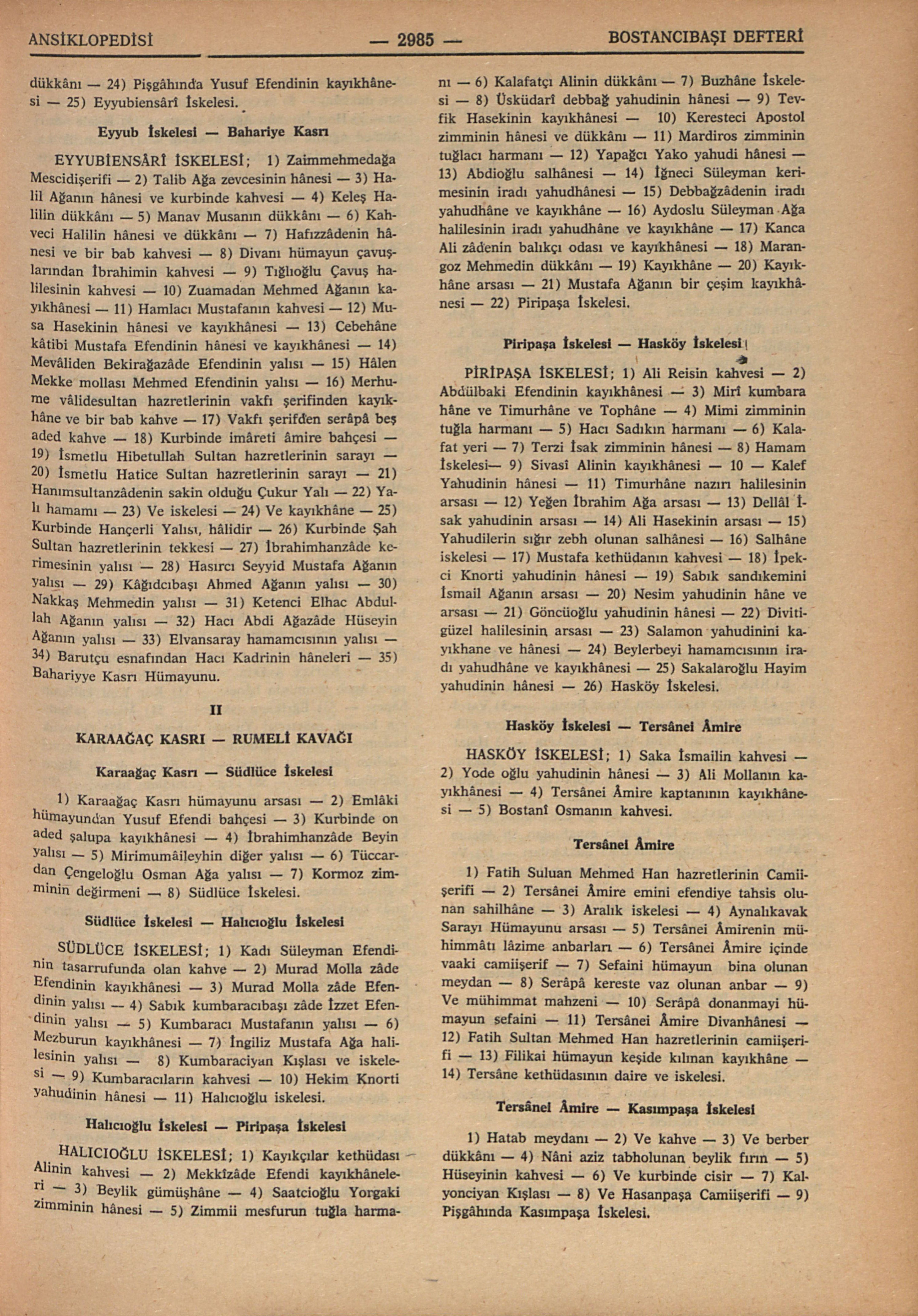 EYYUBİENSÂRÎ İSKELESİ; 1) Zaimmehmedağa Mescidişerifi – 2) Talib Ağa zevcesinin hânesi – 3) Halil Ağanın hânesi ve kurbinde kahvesi – 4) Keleş Halilin dükkânı – 5) Manav Musanın dükkânı – 6) Kahveci Halilin hânesi ve dükkânı – 7) Hafızzâdenin hânesi ve bir bab kahvesi – 8) Divanı hümayun çavuşlarından İbrahimin kahvesi – 9) Tığlıoğlu Çavuş halilesinin kahvesi – 10) Zuamadan Mehmed Ağanın kayıkhânesi – 11) Hamlacı Mustafanın kahvesi – 12) Musa Hasekinin hânesi ve kayıkhânesi – 13) Cebehâne kâtibi Mustafa Efendinin hânesi ve kayıkhânesi – 14) Mevâliden Bekirağazâde Efendinin yalısı – 15) Hâlen Mekke mollası Mehmed Efendinin yalısı – 16) Merhume vâlidesultan hazretlerinin vakfı şerifinden kayıkhâne ve bir bab kahve – 17) Vakfı şerifden serâpâ beş aded kahve – 18) Kurbinde imâreti âmire bahçesi – 19) İsmetlu Hibetullah Sultan hazretlerinin sarayı – 20) İsmetlu Hatice Sultan Hazretlerinin sarayı – 21) Hanımsultanzâdenin sakin olduğu Çukur Yalı – 22) Yalı hamamı – 23) Ve iskelesi – 24) Ve kayıkhâne – 25) Kurbinde Hançerli Yalısı, hâlidir – 26) Kurbinde Şah Sultan hazretlerinin tekkesi – 27) İbrahimhanzâde kerimesinin yalısı – 28) Hasırcı Seyyid Mustafa Ağanın yalısı – 29) Kâğıdcıbaşı Ahmed Ağanın yalısı – 30) Nakkaş Mehmedin yalısı – 31) Ketenci Elhac Abdullah Ağanın yalısı – 32) Hacı Abdi Ağazâde Hüseyin Ağanın yalısı – 33) Elvansaray hamamcısının yalısı – 34) Barutçu esnafından Hacı Kadrinin hâneleri – 35) Bahariyye Kasrı Hümayunu.