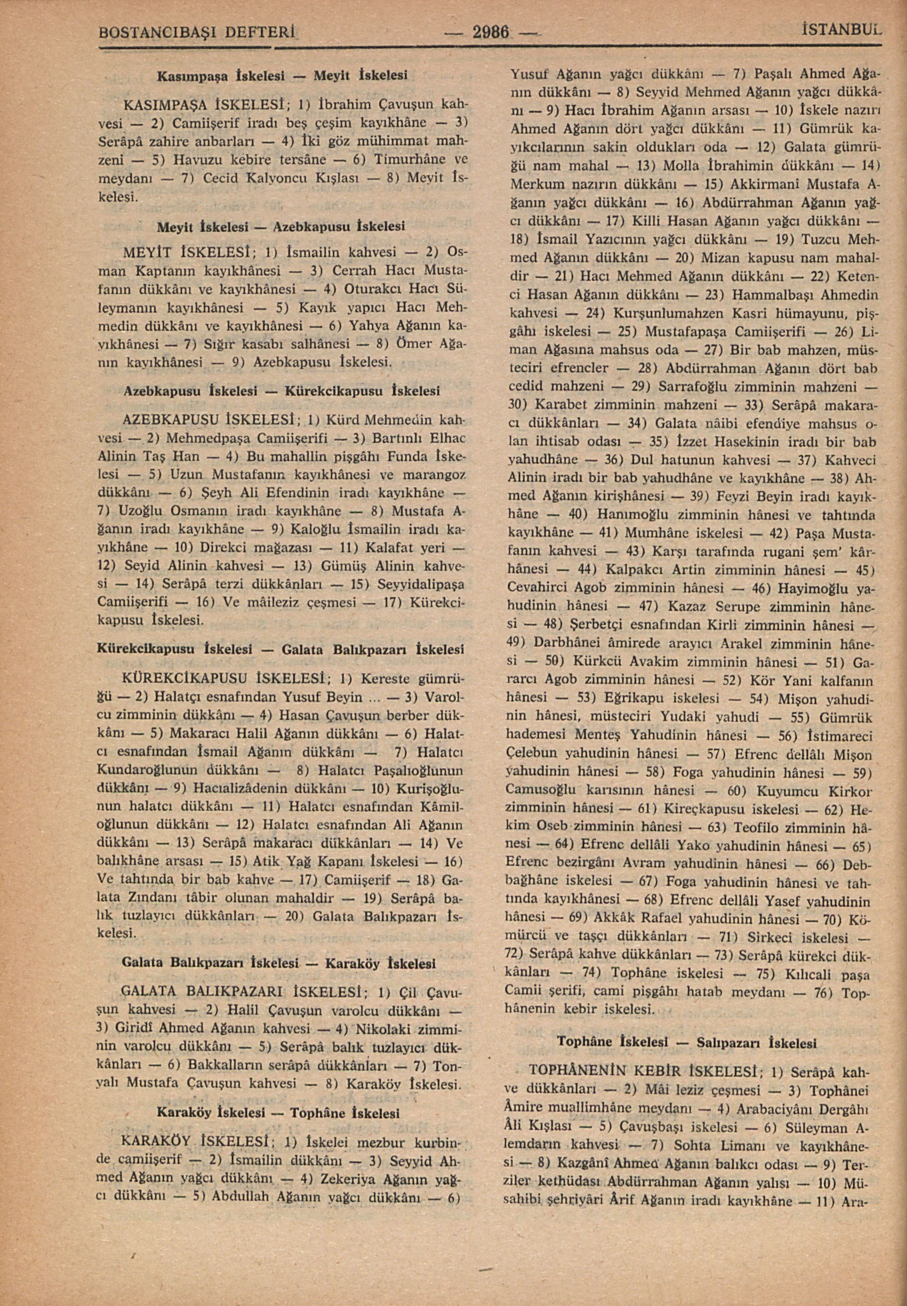 KARAKÖY İSKELESİ; 1) İskelei mezbur kurbinde camiişerif – 2) İsmailin dükkânı – 3) Seyyid Ahmed Ağanın yağcı dükkânı – 4) Zekeriya Ağanın yağcı dükkânı – 5) Abdullah Ağanın yağcı dükkânı – 6) Yusuf Ağanın yağcı dükkânı – 7) Paşalı Ahmed Ağanın dükkânı – 8) Seyyid Mehmed Ağanın yağcı dükkânı – 9) Hacı İbrahim Ağanın arsası – 10) İskele nazırı Ahmed Ağanın dört yağcı dükkânı – 11) Gümrük kayıkcılarının sakin oldukları oda – 12) Galata gümrüğü nam mahal – 13) Molla İbrahimin dükkânı – 14) Merkum nazırın dükkânı – 15) Akkirmanî Mustafa Ağanın yağcı dükkânı – 16) Abdürrahman Ağanın yağcı dükkânı – 17) Killi Hasan Ağanın yağcı dükkânı – 18) İsmail Yazıcının yağcı dükkânı – 19) Tuzcu Mehmed Ağanın dükkânı – 20) Mizan kapusu nam mahaldir – 21) Hacı Mehmed Ağanın dükkânı – 22) Ketenci Hasan Ağanın dükkânı – 23) Hammalbaşı Ahmedin kahvesi – 24) Kurşunlumahzen Kasri hümayunu, pişgâhı iskelesi – 25) Mustafapaşa Camiişerifi – 26) Liman Ağasına mahsus oda – 27) Bir bab mahzen, müsteciri efrencler – 28) Abdürrahman Ağanın dört bab cedid mahzeni – 29) Sarrafoğlu zimminin mahzeni – 30) Karabet zimminin mahzeni – 33) Serâpâ makaracı dükkânları – 34) Galata nâibi efendiye mahsus olan ihtisab odası – 35) İzzet Hasekinin iradı bir bab yahudhâne – 36) Dul hatunun kahvesi – 37) Kahveci Alinin iradı bir bab yahudhâne ve kayıkhâne – 38) Ahmed Ağanın kirişhânesi – 39) Feyzi Beyin iradı kayıkhâne – 40) Hanımoğlu zimminin hânesi ve tahtında kayıkhâne – 41) Mumhâne iskelesi – 42) Paşa Mustafanın kahvesi – 43) Karşı tarafında rugani şem’ kârhânesi – 44) Kalpakcı Artin zimminin hânesi – 45) Cevahirci Agob zimminin hânesi – 46) Hayimoğlu yahudinin hânesi – 47) Kazaz Serupe zimminin hânesi – 48) Şerbetçi esnafından Kirli zimminin hânesi – 49) Darbhânei âmirede arayıcı Arakel zimminin hânesi 50) Kürkcü Avakim zimminin hânesi – 51) Gararcı Agob zimminin hânesi – 52) Kör Yani kalfanın hânesi – 53) Eğrikapu iskelesi – 54) Mişon yahudinin hânesi, müsteciri Yudaki yahudi – 55) Gümrük hademesi Menteş Yahudinin hânesi – 56) İstimareci Çelebun yahudinin hânesi – 57) Efrenc dellâlı Mişon yahudinin hânesi – 58) Foga yahudinin hânesi – 59) Camusoğlu karısının hânesi – 60) Kuyumcu Kirkor zimminin hânesi – 61) Kireçkapusu iskelesi – 62) Hekim Oseb zimminin hânesi – 63) Teofilo zimminin hânesi – 64) Efrenc dellâli Yako yahudinin hânesi – 65) Efrenc bezirgânı Avram yahudinin hânesi – 66) Debbağhâne iskelesi – 67) Foga yahudinin hânesi ve tahtında kayıkhânesi – 68) Efrenc dellâli Yasef yahudinin hânesi – 69) Akkâk Rafael yahudinin hanesi – 70) Kömürcü ve taşçı dükkânları – 71) Sirkeci iskelesi – 72) Serâpâ kahve dükkânları – 73) Serâpâ kürekci dükkânları – 74) Tophâne iskelesi – 75) Kılıcali paşa Camii şerifi, cami pişgâhı hatab meydanı – 76) Tophânenin kebir iskelesi.
