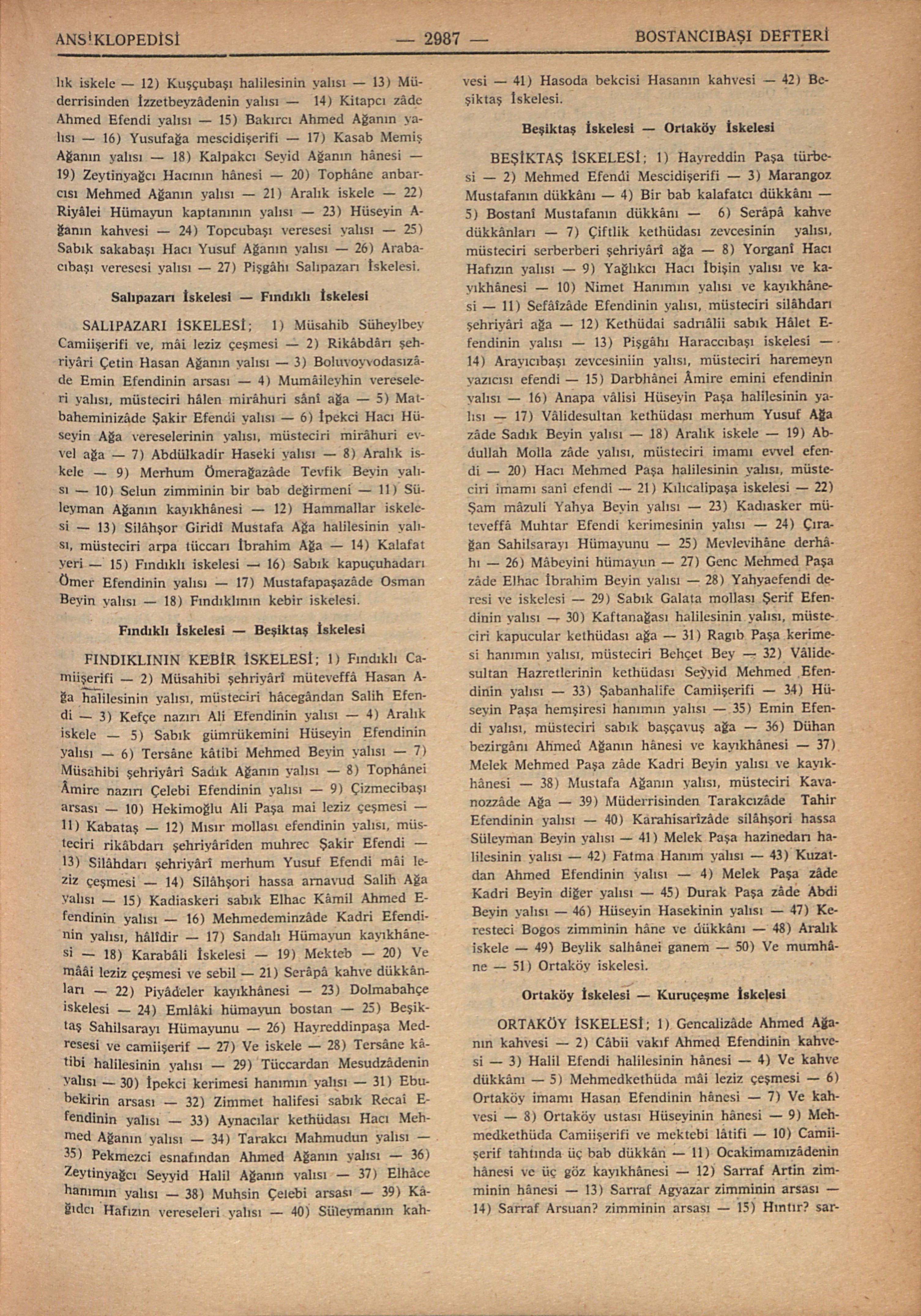 ORTAKÖY İSKELESİ; 1) Gencalizâde Ahmed Ağanın kahvesi – 2) Câbii vakıf Ahmed Efendinin kahvesi – 3) Halil Efendi halilesinin hânesi – 4) Ve kahve dükkânı – 5) Mehmedkethüda mâi leziz çeşmesi – 6) Ortaköy imamı Hasan Efendinin hânesi – 7) Ve kahvesi – 8) Ortaköy ustası Hüseyinin hânesi – 9) Mehmedkethüda Camiişerifi ve mektebi lâtifi – 10) Camiişerif tahtında üç bab dükkân – 11) Ocakimamızâdenin hânesi ve üç göz kayıkhânesi – 12) Sarraf Artin zimminin hânesi – 13) Sarraf Agyazar zimminin arsası – 14) Sarraf Arsuan? zimminin arsası – 15) Hıntır? sarrafın hânesi – 16) Sarraf Agob zimminin hânesi – 17) Sarraf Ohanes zimminin hânesi – 18) Sarrafoğlu Ohanes zimminin hânesi – 19) Sarraf Dakes oğlu zimminin hânesi – 20) Sarraf Papasoğlu Canik zimminin hânesi – 21) Koyun iskelesi – 22) Sarraf Şamanto yahudinin hânesi – 23) Sarraf Kamanti yahudinin hânesi – 24) Darbhâneci Yorgaki zimminin hânesi ve kayıkhânesi – 25) Sarraf Agobcan zimminin hânesi ve kayıkhânesi – 26) Zimmii mesfurun diğer hânesi – 27) Sarraf Uzun Yako yahudinin hânesi – 28) Dülbendci Karabet vereselerinin hânesi – 29) Morevî Ahmed Paşa halilesinin yalısı – 30) Ortaköy Bostanciyan Ocağı – 31) İsmetlûû Hatice Sultan hazretlerinin Neşâtâbâd sarayı âlîleri – 32) Defterdar İbrahim Efendi Camii şerifi ve mâi leziz çeşmesi – 33) Sabık silâhdarı şehriyârî Emin Ağanın yalısı – 34) Çavuşlaremini Tahsin Efendinin yalısı – 35) Müderrisinden Yenişehirli Mustafa Paşa zâde Şefik Beyin yalısı – 36) İsmetlu Hibetullah Sultan hazretlerinin sarayı âlîleri – 37) Ekmekcioğlu Deresi nam mahaldir – 38) İsmetlu Esmâ Sultan hazretlerinin Tırnakcı Yalısı – 39) Kaptanpaşa divan efendisi Emin Efendinin arsası – 40) Enderunu hümayun pazarbaşısı Mustafa Beyin arsası – 41) Yahya Paşa zâde Ali Beyin yalısı – 42) Hekimbaşı Ârif Efendi kerimesinin arsası – 43) Kaadiasker mütevaffâ Âtâ efendi zâde Molla Efendi arsası – 44) İsmetlu Beyhan Sultan hazretlerine intikal eden yalı arsası – 45) Haraccıbaşı Çavuşzâde Emin Efendi yalısı – 46) Tırnakcızâde İbrahim Paşa zâde Mehmed Beyin yalısı – 47) Dergâhıâlî kapucubaşılarından Abdullah Paşa zâde Mehmed Beyin yalısı – 48) Boyar Anaştaş zimminin hânesi – 49) Karaca Boyar zimminin hânesi – 50) Aralık iskele – 51) Karaca Boyarın iki çeşim kayıkhânesi – 52) Dülbendci esnafından Serkis zimminin hânesi – 53) Şabcı Andriyas zimminin hânesi – 54) Avram yahudinin hânesi ve tahtında kahvesi – 55) Kuruçeşme iskelesi.