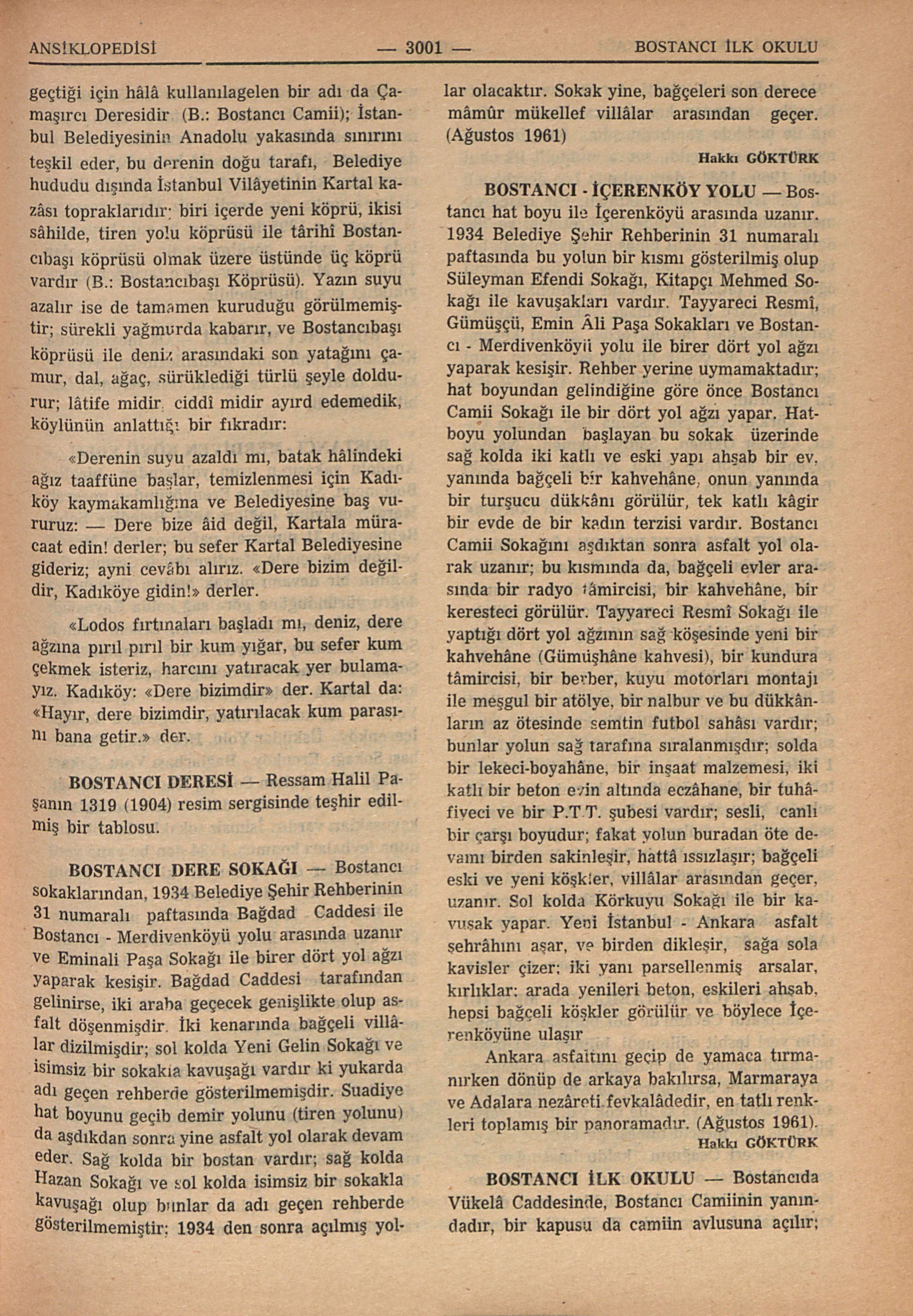 Kayışdağı eteklerinden çıkar, İçerenköyünün doğu kenarından geçerek Bostancıda Marmaraya dökülür; Onyedinci asır başlarından bu yana Çamaşırcıbaşı Kuloğlu Mustafa Beyin vakıf arâzisinden geçtiği için hâlâ kullanılagelen bir adı da Çamaşırcı Deresidir (B.: Bostancı Camii); İstanbul Belediyesinin Anadolu yakasında sınırını teşkil eder, bu derenin doğu tarafı, Belediye hududu dışında İstanbul Vilâyetinin Kartal kazâsı topraklarıdır; biri içerde yeni köprü, ikisi sâhilde, tiren yolu köprüsü ile târihî Bostancıbaşı köprüsü olmak üzere üstünde üç köprü vardır (B.: Bostancıbaşı Köprüsü). Yazın suyu azalır ise de tamamen kuruduğu görülmemiştir; sürekli yağmurda kabarır, ve Bostancıbaşı köprüsü ile deniz arasındaki son yatağını çamur, dal, ağaç, sürüklediği türlü şeyle doldurur; lâtife midir, ciddî midir ayırd edemedik, köylünün anlattığı bir fıkradır: “Derenin suyu azaldı mı, batak hâlindeki ağız taaffüne başlar, temizlenmesi için Kadıköy kaymakamlığına ve Belediyesine baş vururuz: — Dere bize âid değil, Kartala müracaat edin! derler; bu sefer Kartal Belediyesine gideriz; ayni cevâbı alırız. “Dere bizim değildir, Kadıköye gidin!” derler. “Lodos fırtınaları başladı mı, deniz, dere ağzına pırıl pırıl bir kum yığar, bu sefer kum çekmek isteriz, harcını yatıracak yer bulamayız. Kadıköy: “D...
