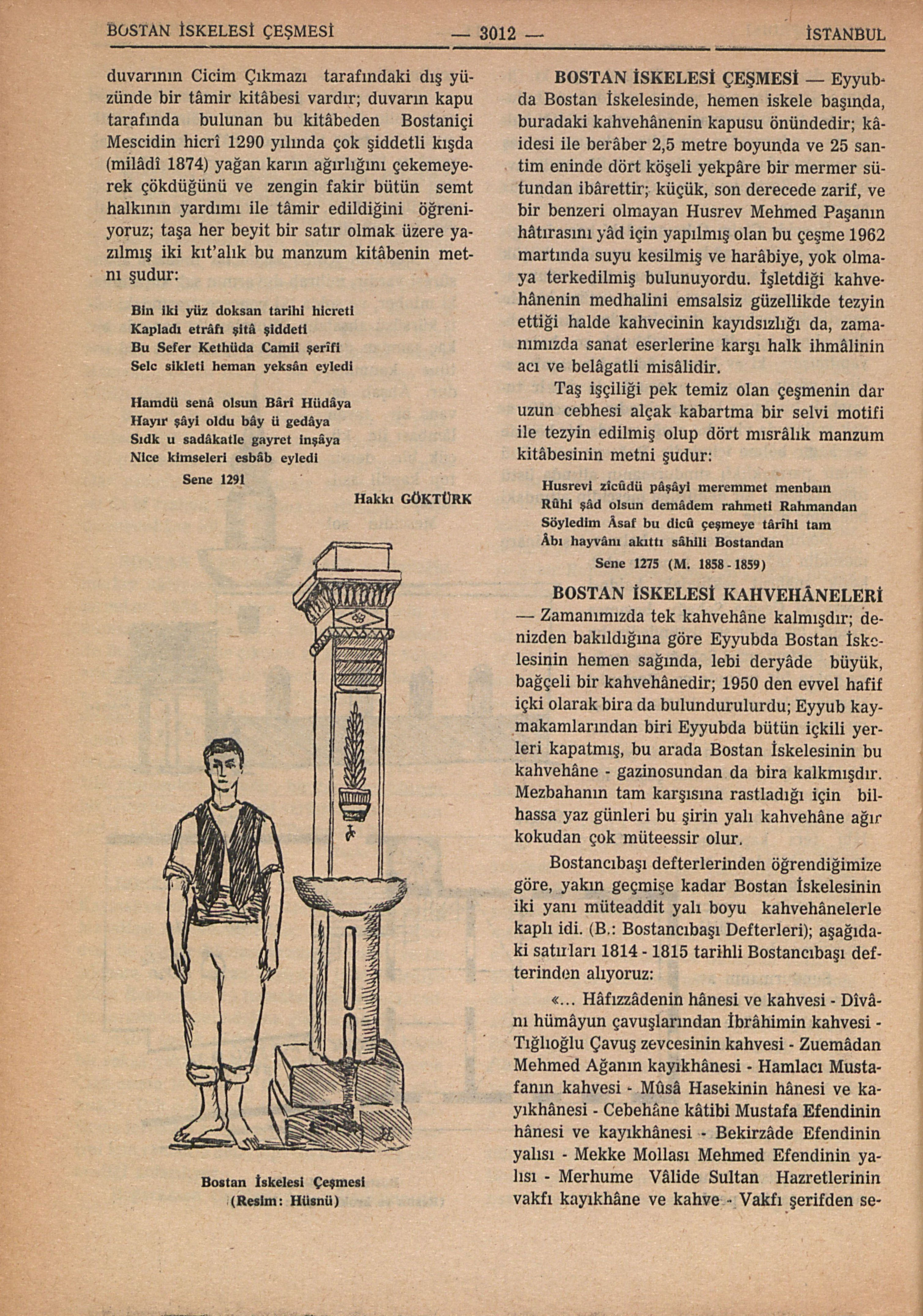Eyyubda Bostan İskelesinde, hemen iskele başında, buradaki kahvehânenin kapusu önündedir; kâidesi ile berâber 2,5 metre boyunda ve 25 santim eninde dört köşeli yekpâre bir mermer sütundan ibârettir; küçük, son derecede zarif, ve bir benzeri olmayan Husrev Mehmed Paşanın hâtırasını yâd için yapılmış olan bu çeşme 1962 martında suyu kesilmiş ve harâbiye, yok olmaya terkedilmiş bulunuyordu. İşletdiği kahvehânenin medhalini emsalsiz güzellikde tezyin ettiği halde kahvecinin kayıdsızlığı da, zamanımızda sanat eserlerine karşı halk ihmâlinin acı ve belâgatli misâlidir.