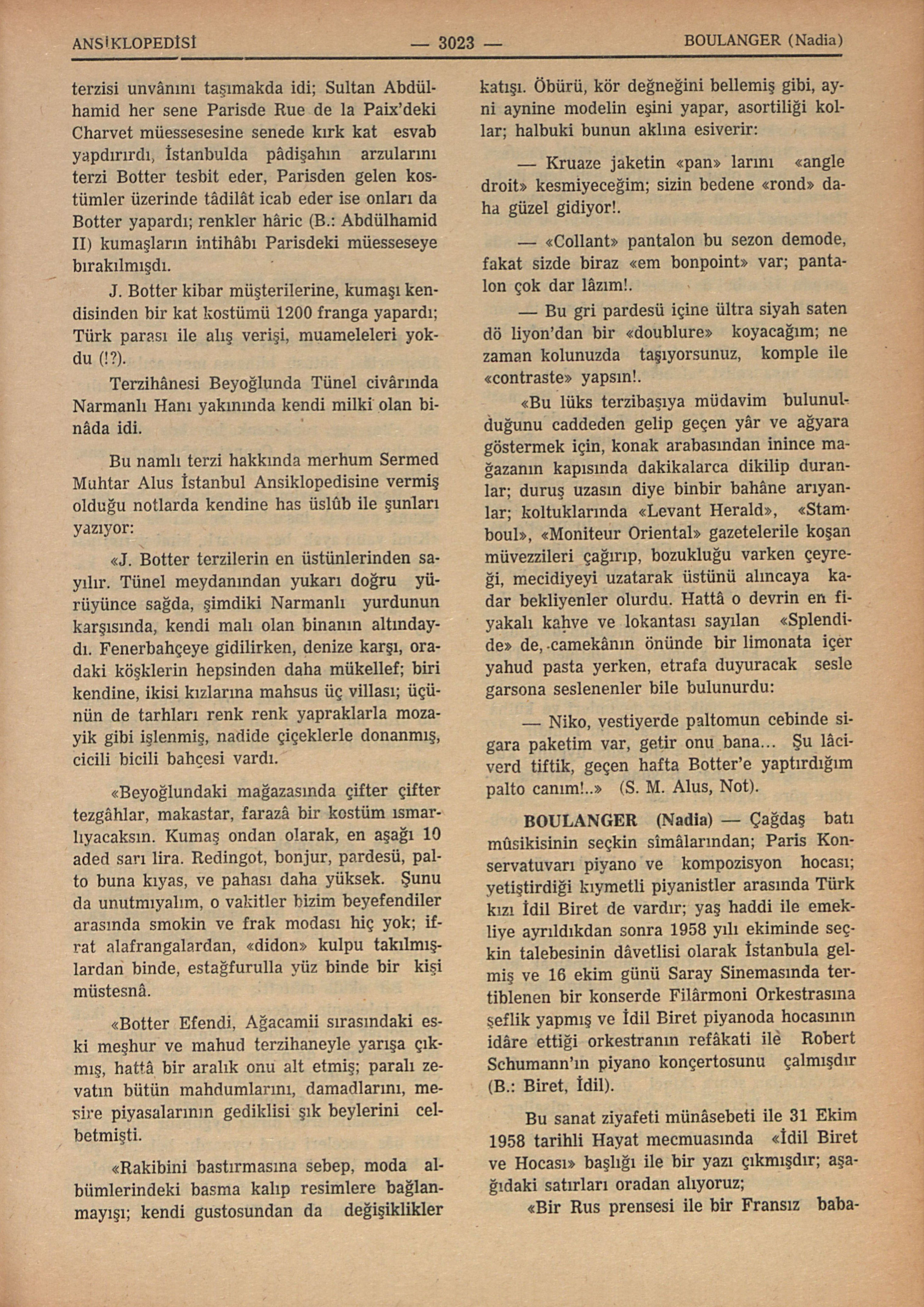 Geçen asrın ikinci yarısında İstanbulun namlı bir terzisi, Hollanda tâbiiyetinde olup İkinci Sultan Abdülhamidin terzisi unvânını taşımakda idi; Sultan Abdülhamid her sene Parisde Rue de la Paix’deki Charvet müessesesine senede kırk kat esvab yapdırırdı, İstanbulda pâdişahın arzularını terzi Botter tesbit eder, Parisden gelen kostümler üzerinde tâdilât icat eder ise onları da Botter yapardı; renkler hâric (B.: Abdülhamid II) kumaşların intihâbı Parisdeki müesseseye bırakılmışdı. J. Botter kibar müşterilerine, kumaşı kendisinden bir kat kostümü 1200 franga yapardı; Türk parası ile alış verişi, muameleleri yokdu (!?). Terzihânesi Beyoğlunda Tünel civârında Narmanlı Hanı yakınında kendi milki olan binâda idi. Bu namlı terzi hakkında merhum Sermed Muhtar Alus İstanbul Ansiklopedisine vermiş olduğu notlarda kendine has üslûb ile şunları yazıyor: “J. Botter terzilerin en üstünlerinden sayılır. Tünel meydanından yukarı doğru yürüyünce sağda, şimdiki Narmanlı yurdunun karşısında, kendi malı olan binanın altındaydı. Fenerbahçeye gidilirken, denize karşı, oradaki köşklerin hepsinden daha mükellef; biri kendine, ikisi kızlarına mahsus üç villası; üçünün de tarhları renk renk yapraklarla mozayik gibi işlenmiş, nadide çiçeklerle donanmış, cicili bicili bahçesi vardı. “Beyoğlundaki mağaza...