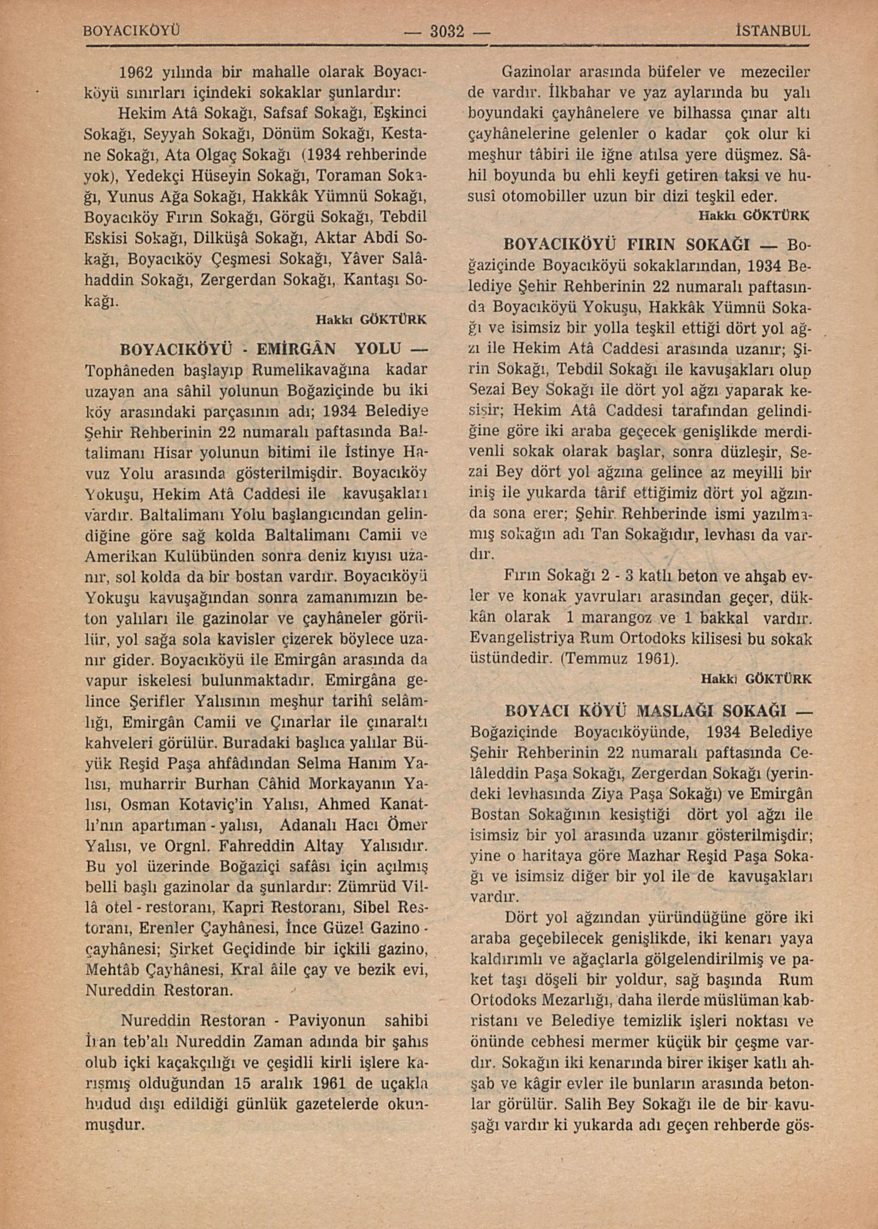 Boğaziçinde Boyacıköyü sokaklarından, 1934 Belediye Şehir Rehberinin 22 numaralı paftasında Boyacıköyü Yokuşu, Hakkâk Yümnü Sokağı ve isimsiz bir yolla teşkil ettiği dört yol ağzı ile Hekim Atâ Caddesi arasında uzanır; Şirin Sokağı, Tebdil Sokağı ile kavuşakları olup Sezai Bey Sokağı ile dört yol ağzı yaparak kesişir; Hekim Atâ Caddesi tarafından gelindiğine göre iki araba geçecek genişlikde merdivenli sokak olarak başlar, sonra düzleşir, Sezai Bey dört yol ağzına gelince az meyilli bir iniş ile yukarda târif ettiğimiz dört yol ağzında sona erer; Şehir Rehberinde ismi yazılmamış sokağın adı Tan Sokağıdır, levhası da vardır.