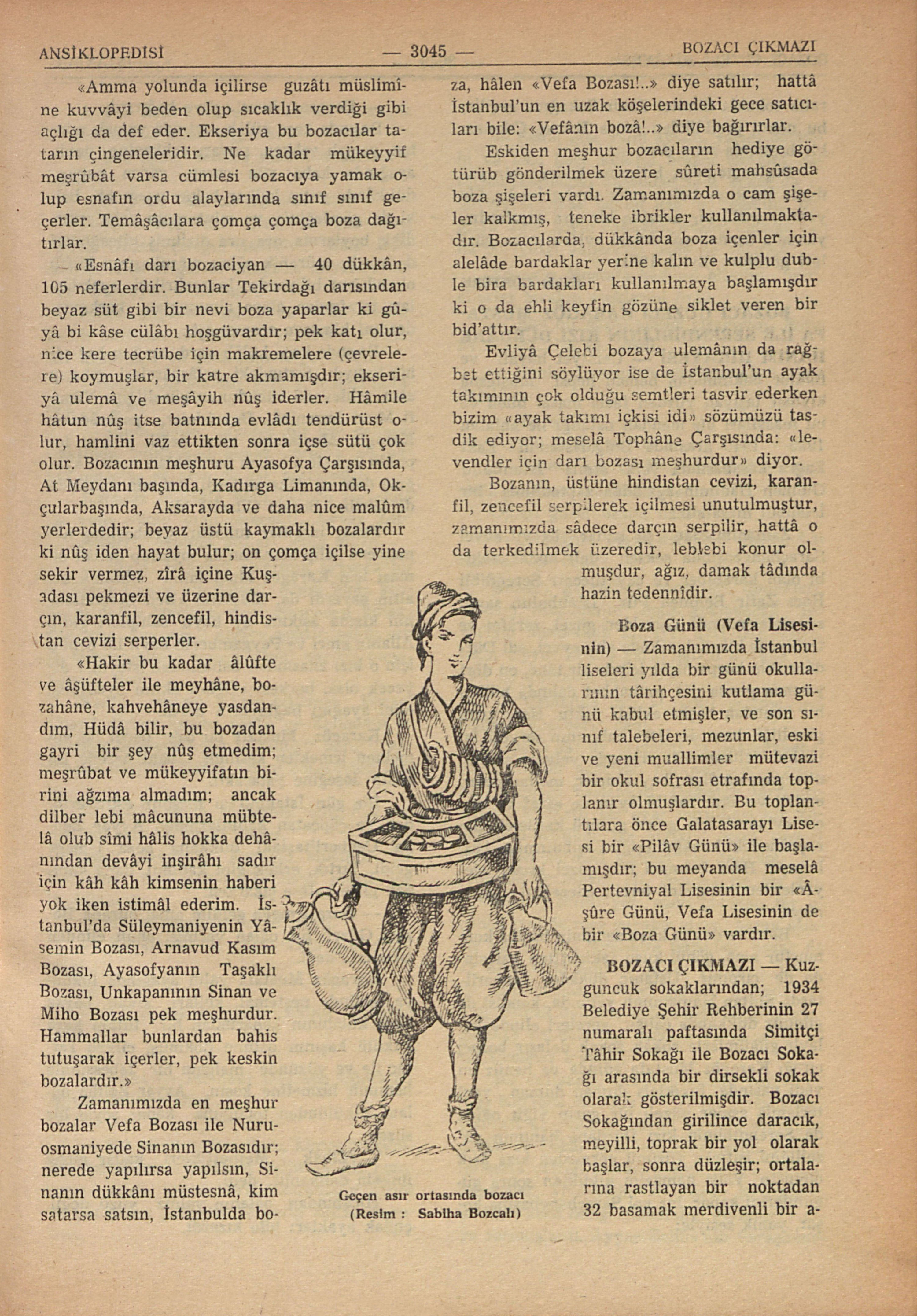 Zamanımızda en meşhur bozalar Vefa Bozası ile Nuruosmaniyede Sinanın Bozasıdır; nerede yapılırsa yapılsın, Sinanın dükkânı müstesnâ, kim satarsa satsın, İstanbulda boza, hâlen «Vefâ Bozası!..» diye satılır; hattâ İstanbul’un en uzak köşelerindeki gece satıcıları bile: «Vefânın boza!..» diye bağırırlar.