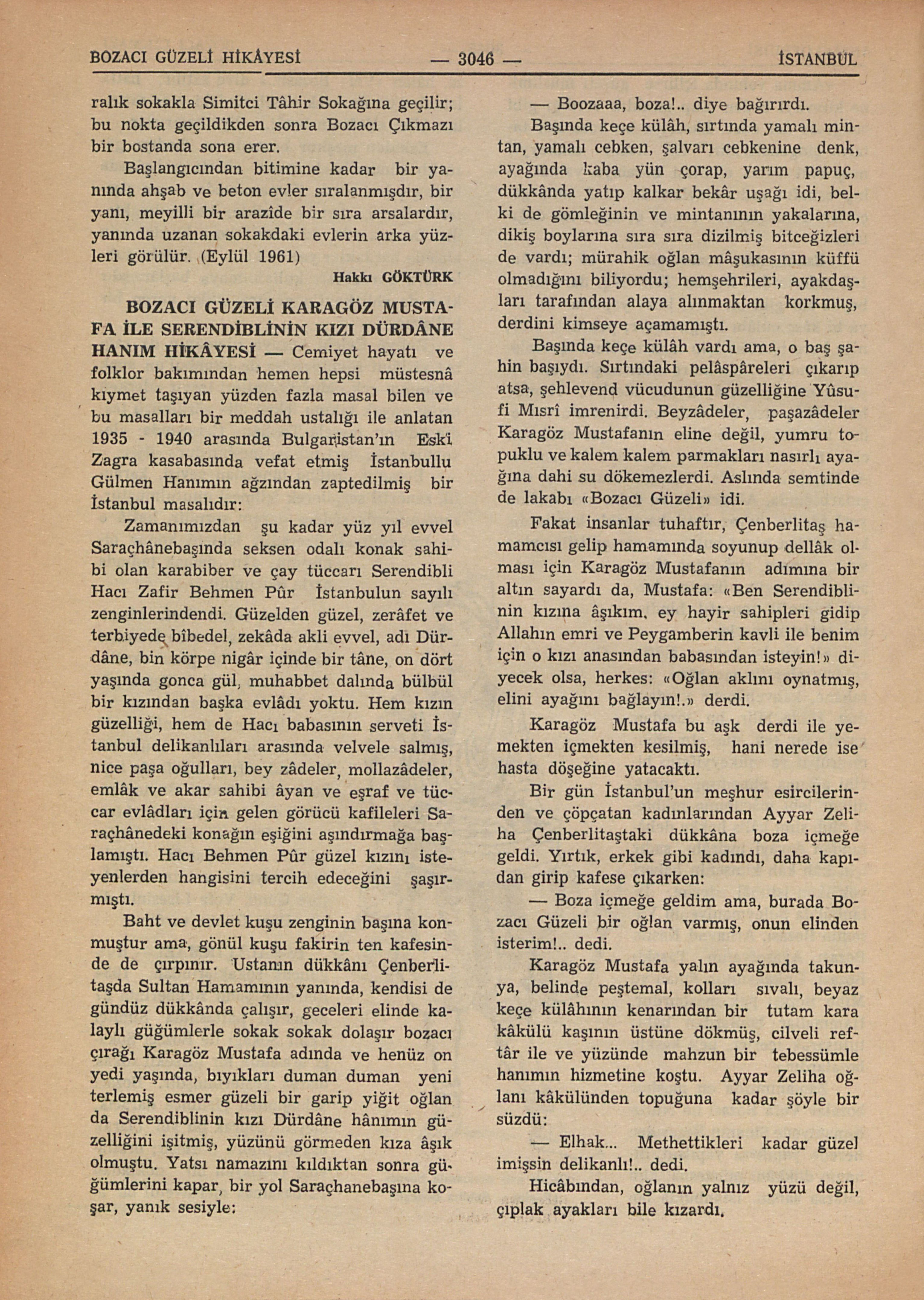 Cemiyet hayatı ve folklor bakımından hemen hepsi müstesnâ kıymet taşıyan yüzden fazla masal bilen ve bu masalları bir meddah ustalığı ile anlatan 1935 - 1940 arasında Bulgaristan’ın Eski Zagra kasabasında vefat etmiş İstanbullu Gülmen Hanımın ağzından zaptedilmiş bir İstanbul masalıdır: