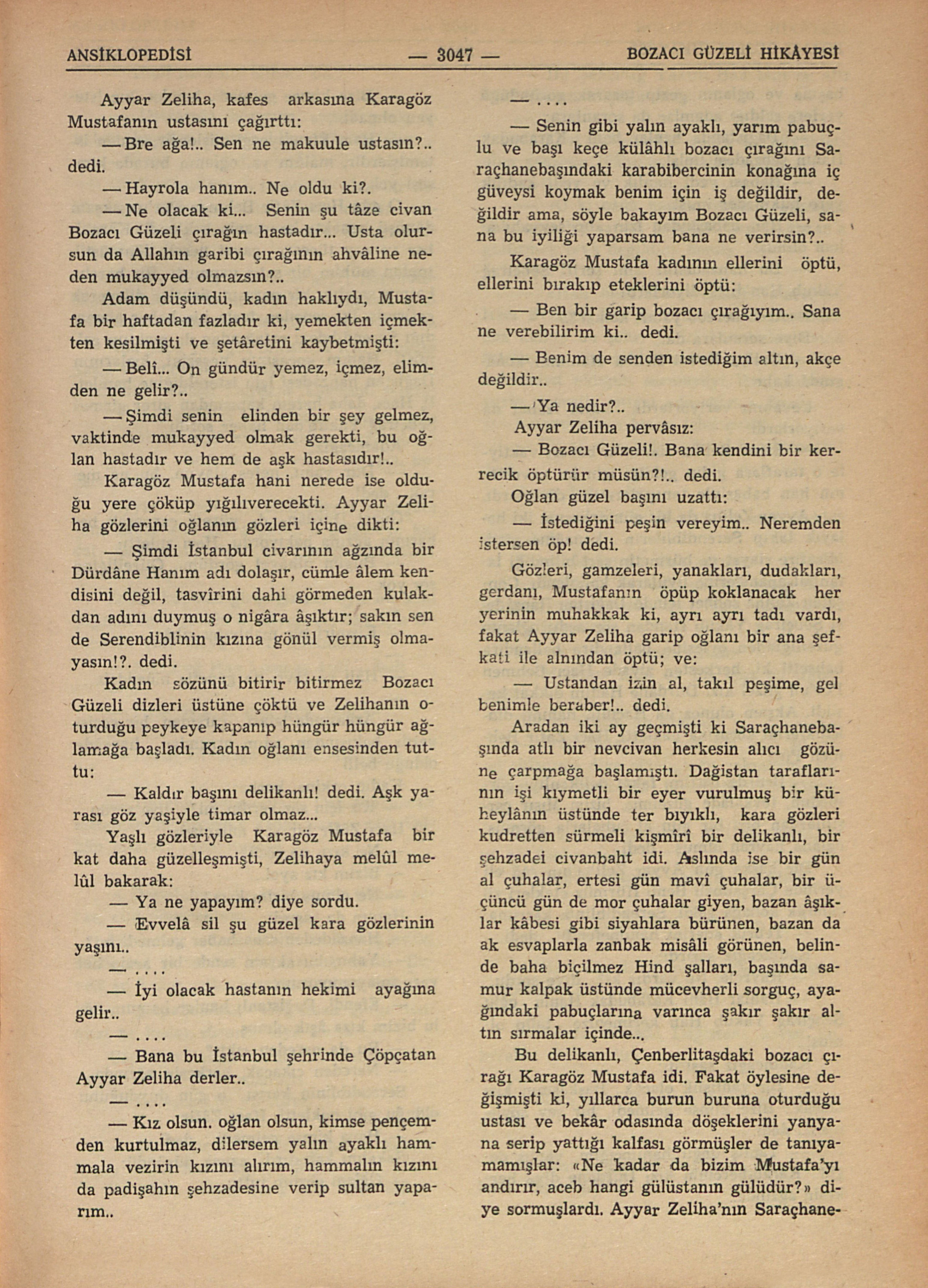 Bu delikanlı, Çenberlitaşdaki bozacı çırağı Karagöz Mustafa idi. Fakat öylesine değişmişti ki, yıllarca burun buruna oturduğu ustası ve bekâr odasında döşeklerini yanyana serip yattığı kalfası görmüşler de tanıyamamışlar: «Ne kadar da bizim Mustafa’yı andırır, aceb hangi gülüstanın gülüdür?» diye sormuşlardı. Ayyar Zeliha’nın Saraçhanebaşına ve oğlanın gezip tozarak göründüğü yerlere saldığı adamlar da soranlara: