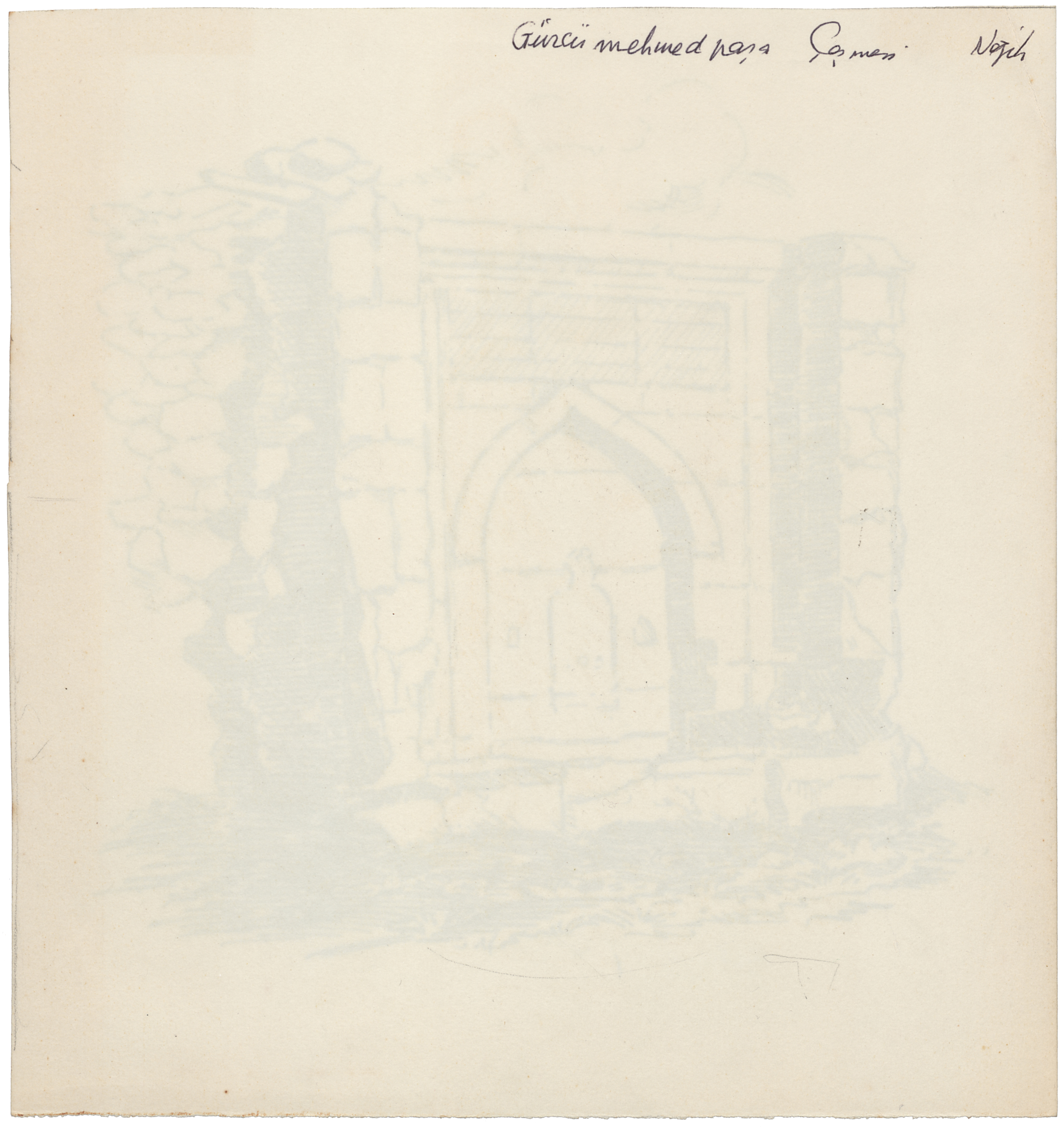 Kâğıt üzerine kurşun kalem ve mürekkep, imzasız. Desen çalışmasının arkasında "Gürcü Mehmed Paşa Çeşmesi Nezih" yazmaktadır.