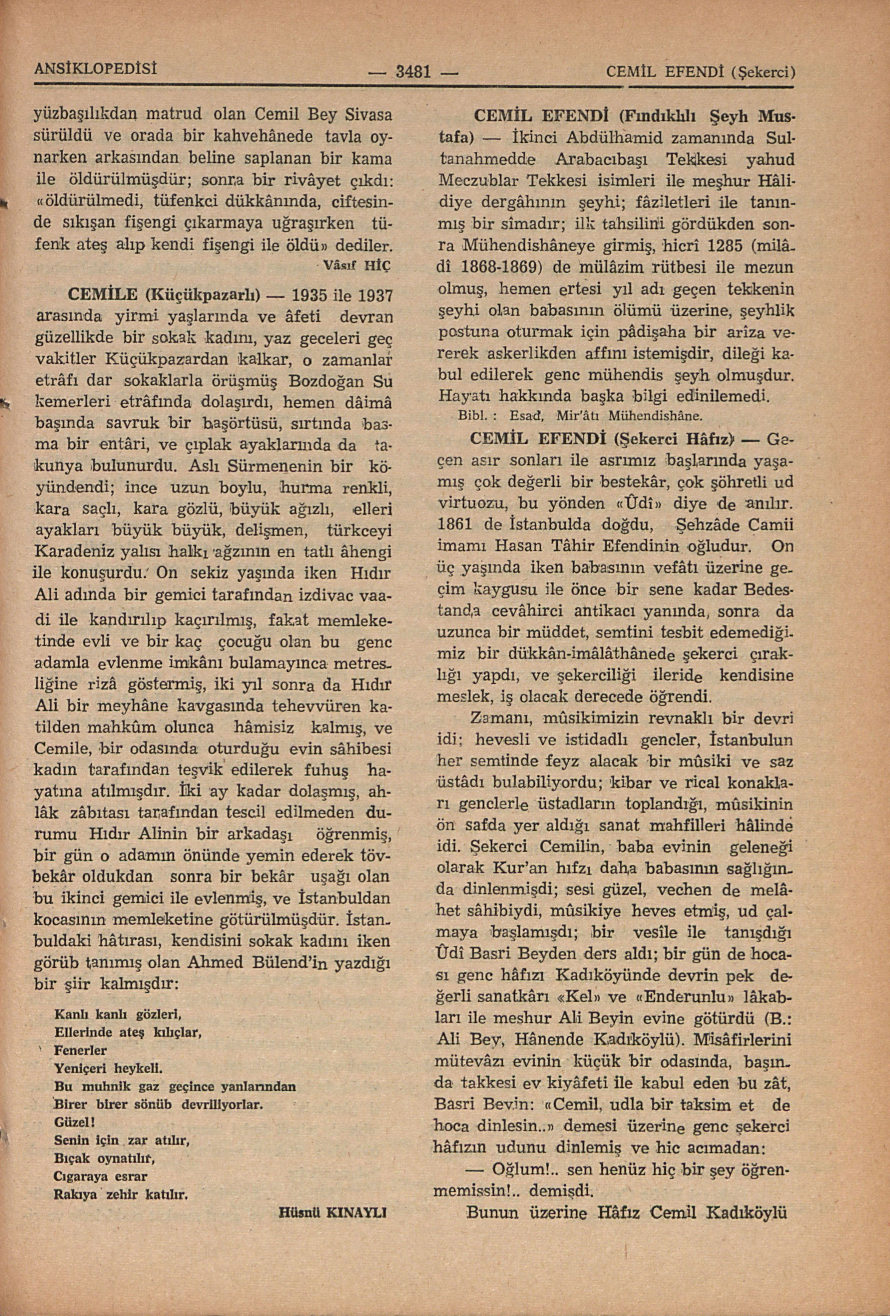 1935 ile 1937 arasında yirmi yaşlarında ve âfeti devran güzellikde bir sokak kadını, yaz geceleri geç vakitler Küçükpazardan kalkar, o zamanlar etrâfı dar sokaklarla örüşmüş Bozdoğan Su kemerleri etrâfında dolaşırdı, hemen dâimâ başında savruk bir başörtüsü, sırtında basma bir entâri, ve çıplak ayaklarında da takunya bulunurdu. Aslı Sürmenenin bir köyündendi; ince uzun boylu, hurma renkli, kara saçlı, kara gözlü, büyük ağızlı, elleri ayakları büyük büyük, delişmen, türkceyi Karadeniz yalısı halkı ağzının en tatlı âhengi ile konuşurdu. On sekiz yaşında iken Hıdır Ali adında bir gemici tarafından izdivac vaadi ile kandırılıp kaçırılmış, fakat memleketinde evli ve bir kaç çocuğu olan bu genc adamla evlenme imkânı bulamayınca metresliğine rizâ göstermiş, iki yıl sonra da Hıdır Ali bir meyhâne kavgasında tehevvüren katilden mahkûm olunca hâmisiz kalmış, ve Cemile, bir odasında oturduğu evin sâhibesi kadın tarafından teşvik edilerek fuhuş hayatına atılmışdır. İki ay kadar dolaşmış, ahlâk zâbıtası tarafından tescil edilmeden durumu Hıdır Ali’nin arkadaşı öğrenmiş, bir gün o adamın önünde yemin ederek tövbekâr olduktan sonra bir bekâr uşağı olan bu ikinci gemici ile evlenmiş, ve İstanbuldan kocasının memleketine götürülmüşdür. İstanbuldaki hâtırası, kendisini sokak kadını iken görüb tanımış olan Ahmed Bülend’in yazdığı bir şiir kalmışdır: