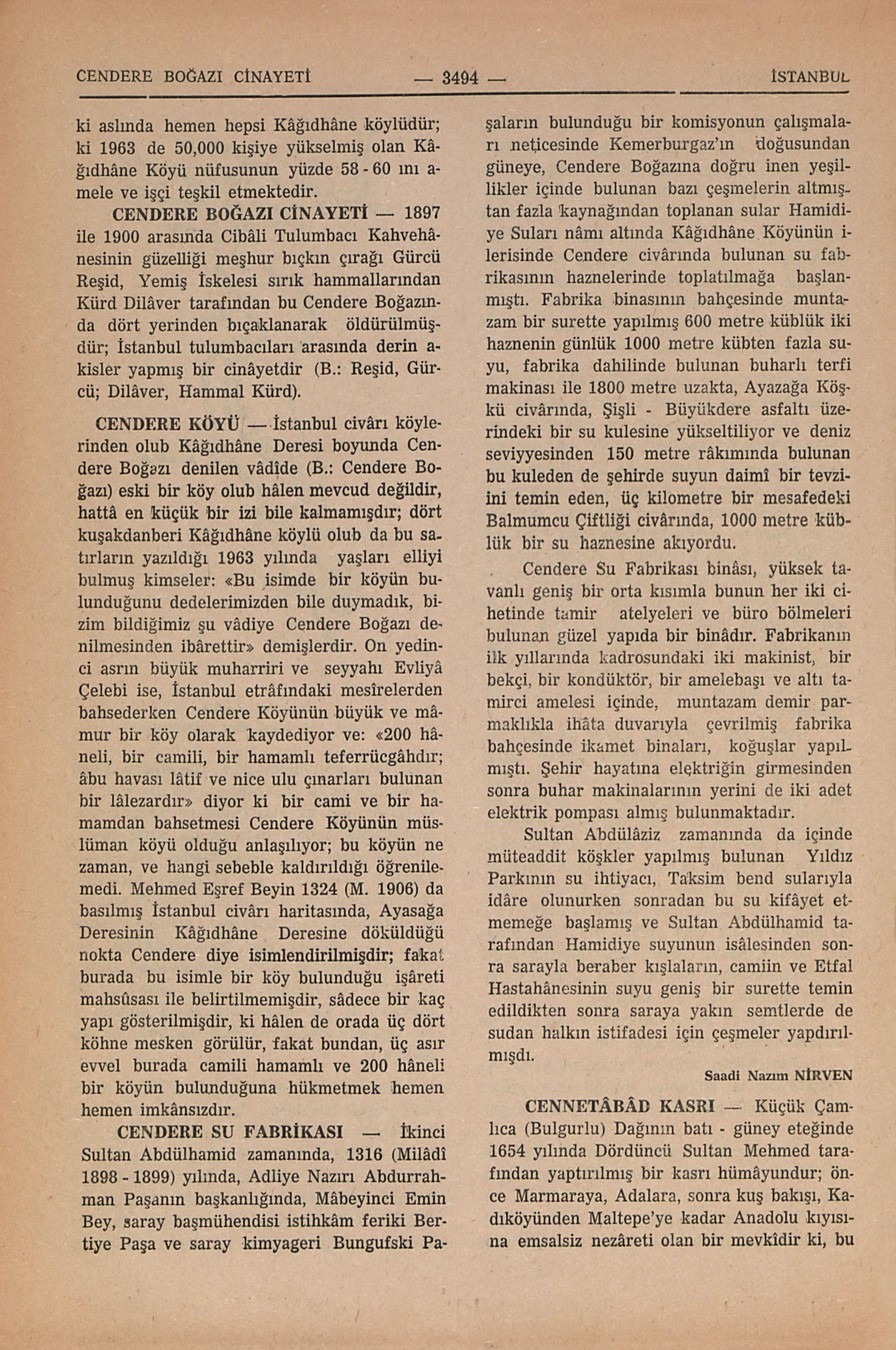 1897 ile 1900 arasında Cibâli Tulumbacı Kahvehânesinin güzelliği meşhur bıçkın çırağı Gürcü Reşid, Yemiş İskelesi sırık hammallarından Kürd Dilâver tarafından bu Cendere Boğazında dört yerinden bıçaklanarak öldürülmüşdür; İstanbul tulumbacıları arasında derin akisler yapmış bir cinâyetdir (B.: Reşid, Gürcü; Dilâver, Hammal Kürd)