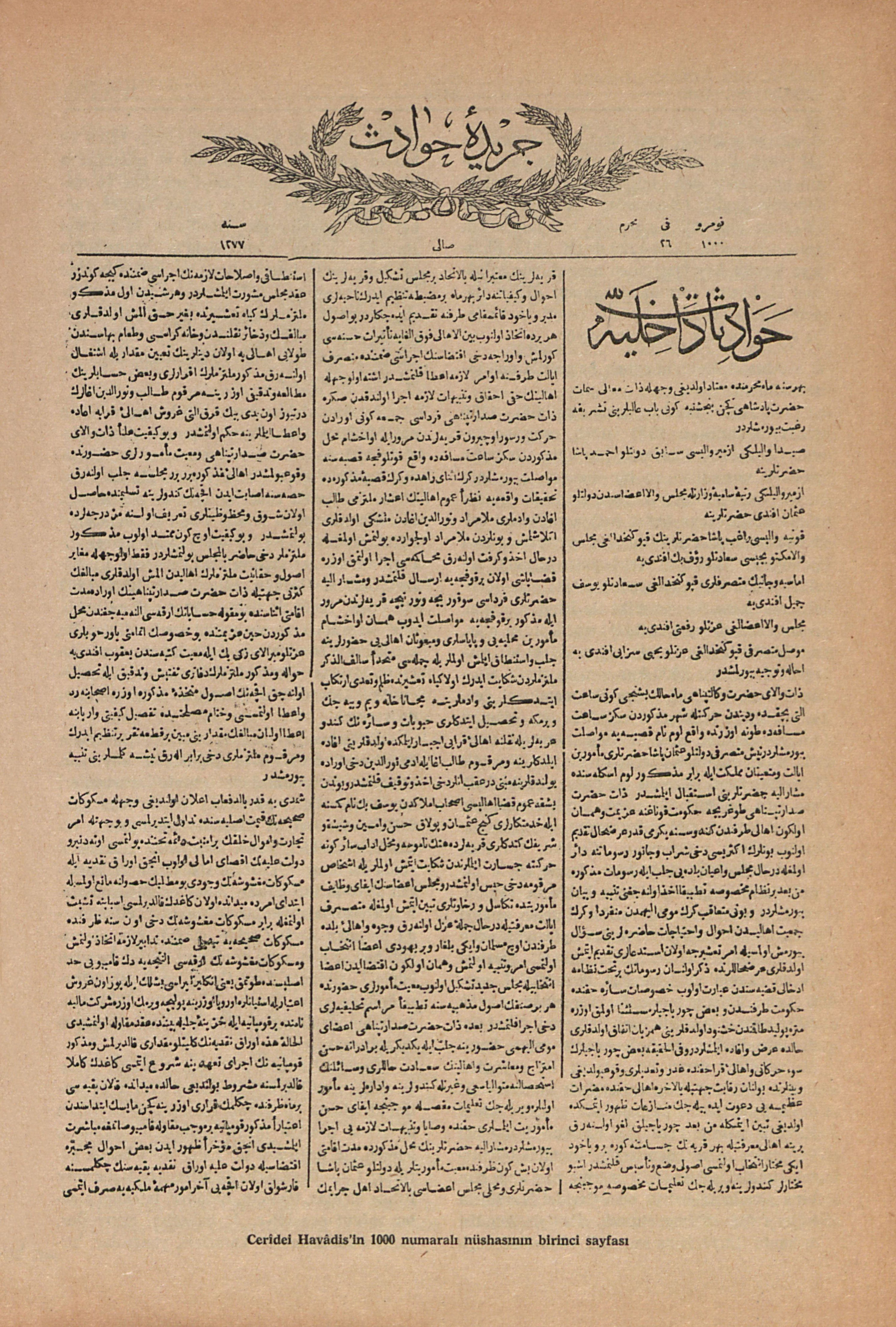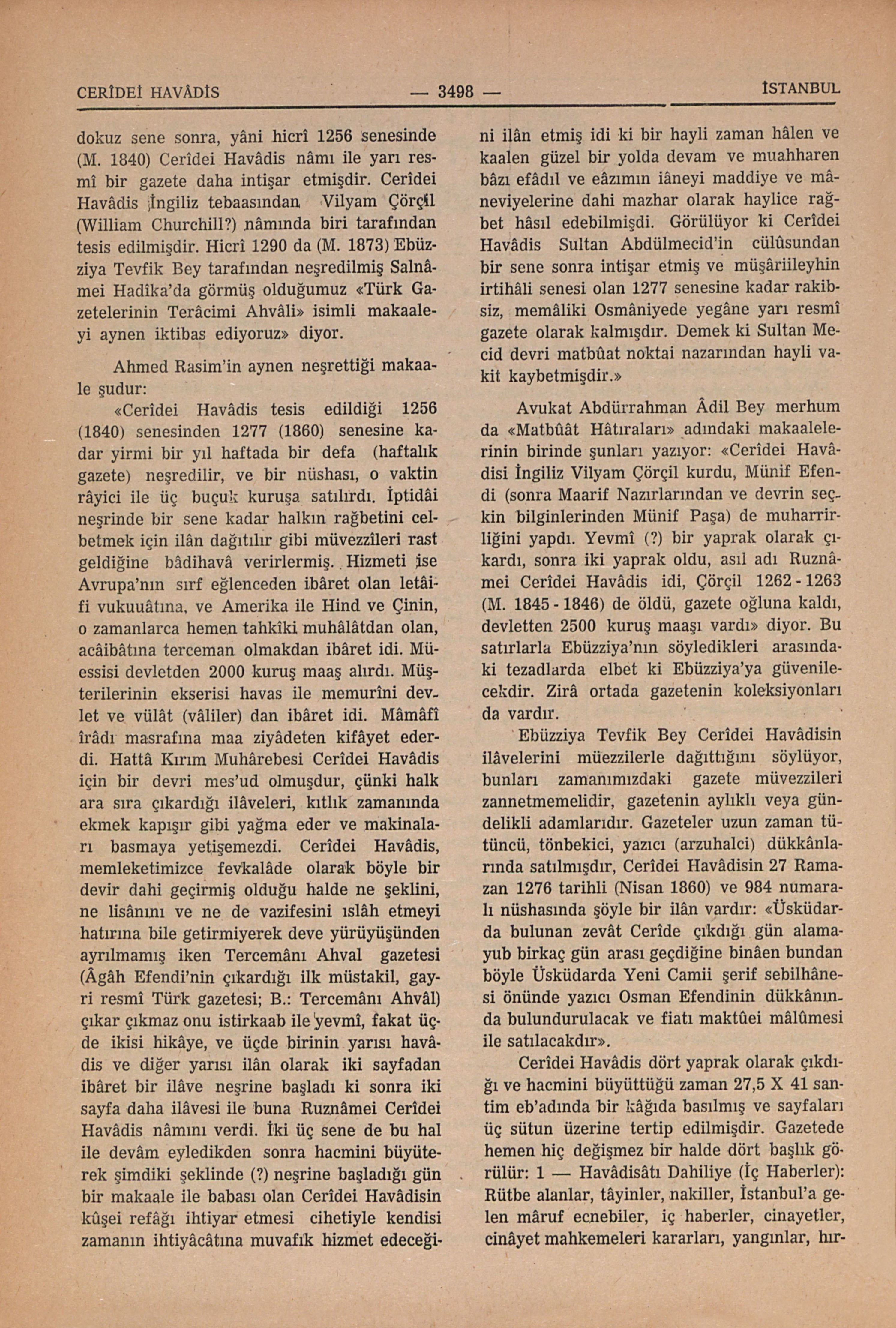 Devlet eliyle çıkarılmış ilk Türk gazetesi “Takvîm Vekaayi” den sonra devlet yardımı gören şahsî teşebbüs ile çıkmış yarı resmî ikinci Türk gazetesi. İstanbul Ansiklopedisinde bu gazetenin tarihcesinin tesbitini, bu sahâda en sağlam bilgiye sahib, geniş tetkiklerde bulunmuş muharrir Cemal Kutay’dan recâ etmiş, ve sayın C. Kutay da 1963 yılı Şubat ayında vâki bu recâmızı kabul etmiş, bu maddeyi gereği gibi yazacağını vaad etmişdi. Fakat biz bu şehir kütüğünde kalem arkadaşlarımıza kıymetlerine bahâ biçilmez yardımları karşılığı en küçük bir telif hakkı ödeyemediğimiz için, recâmızı iki defa tekîden bildirdikden sonra, fazlaca ısrar edemedik. Sayın C. Kutay’ın yazısı bu satırların matbaaya tevdiği gereken zamana kadar elimize geçmediği için, biz de sayın yazara güvenerek Cerîdei Havâdis koleksiyonları üzerinde bizzat meşgul olamadığımızdan, aşağıdaki satırları kaydetmekle iktifâ zaruretinden kaldık. Ahmed Rasim “İstibdaddan Hâkimiyeti Milliyeye” adlı eserinin ikinci kitabında: “Hicrî 1247 senesi cemâziyelûlâsının beşinci günü (Ekim 1831) intişar eden Takvîmi Vekaayî’den dokuz sene sonra, yâni hicrî 1256 senesinde (M. 1840) Cerîdei Havâdis nâmı ile yarı resmî bir gazete daha intişar etmişdir. Cerîdei Havâdis İngiliz tebaasından Vilyam Çörçil (William Churchill?) nâmında biri taraf...