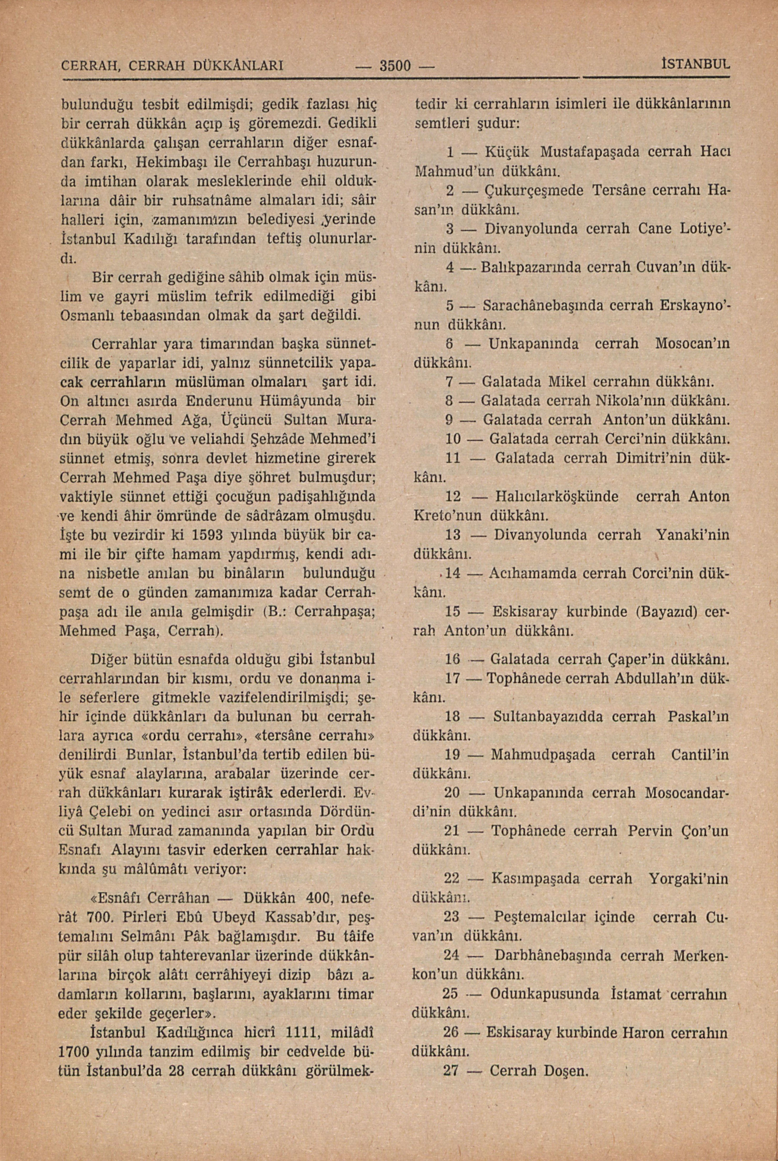İstanbul Kadılığınca hicrî 1111, milâdî 1700 yılında tanzim edilmiş bir cedvelde bütün İstanbul’da 28 cerrah dükkânı görülmektedir ki cerrahların isimleri ile dükkânlarının semtleri şudur: