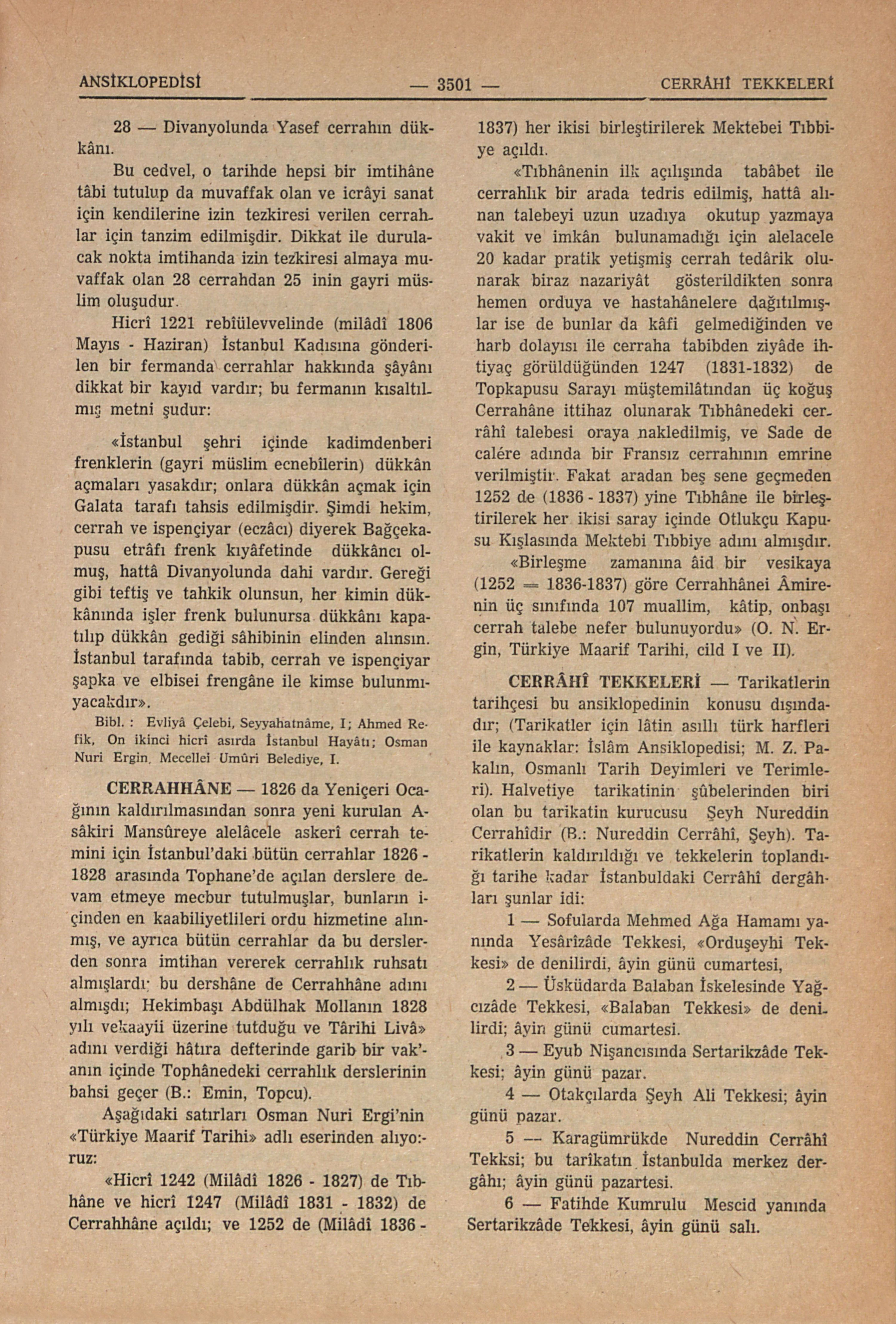 Tarikatlerin tarihçesi bu ansiklopedinin konusu dışındadır; (Tarikatler için lâtin asıllı türk harfleri ile kaynaklar: İslâm Ansiklopedisi; M. Z. Pakalın, Osmanlı Tarih Deyimleri ve Terimleri). Halvetiye tarikatinin şûbelerinden biri olan bu tarikatin kurucusu Şeyh Nureddin Cerrahîdir (B.: Nureddin Cerrâhi, Şeyh). Tarikatlerin kaldırıldığı ve tekkelerin toplandığı tarihe kadar İstanbuldaki Cerrâhî dergâhları şunlar idi: 1 — Sofularda Mehmed Ağa Hamamı yanında Yesârîzâde Tekkesi, “Orduşeyhi Tekkesi” de denilirdi, âyin günü cumartesi, 2 — Üsküdarda Balaban İskelesinde Yağcızâde Tekkesi, “Balaban Tekkesi” de denilirdi; âyin günü cumartesi. 3 — Eyub Nişancısında Sertarikzâde Tekkesi, âyin günü pazar. 4 — Otakçılarda Şeyh Ali Tekkesi; âyin günü pazar. 5 — Karagümrükde Nureddin Cerrâhî Tekksi; bu tarîkatın İstanbulda merkez dergâhı; âyin günü pazartesi. 6 — Fatihde Kumrulu Mescid yanında Sertarikzâde Tekkesi, âyin günü salı. 7 — Edirnekapusunda Acıçeşmede Halil Nizâmeddin Tekkesi; âyin günü çarşamba. 8 — Silivrikapusunda Karagöz Tekkesi; âyin günü çarşamba. 9 — Bağçekapusunda Yıldız Dede Tekkesi; âyin günü çarşamba. 10 — Otlukcu Yokuşunda İplikçi Tekkesi; âyin günü perşenbe. 11 — Nûriosmâniyede Çaylâkzâde Tekkesi; âyin günü perşembe. 12 — Eyyubde Tameşvar Takkesi; âyin günü perşenb...
