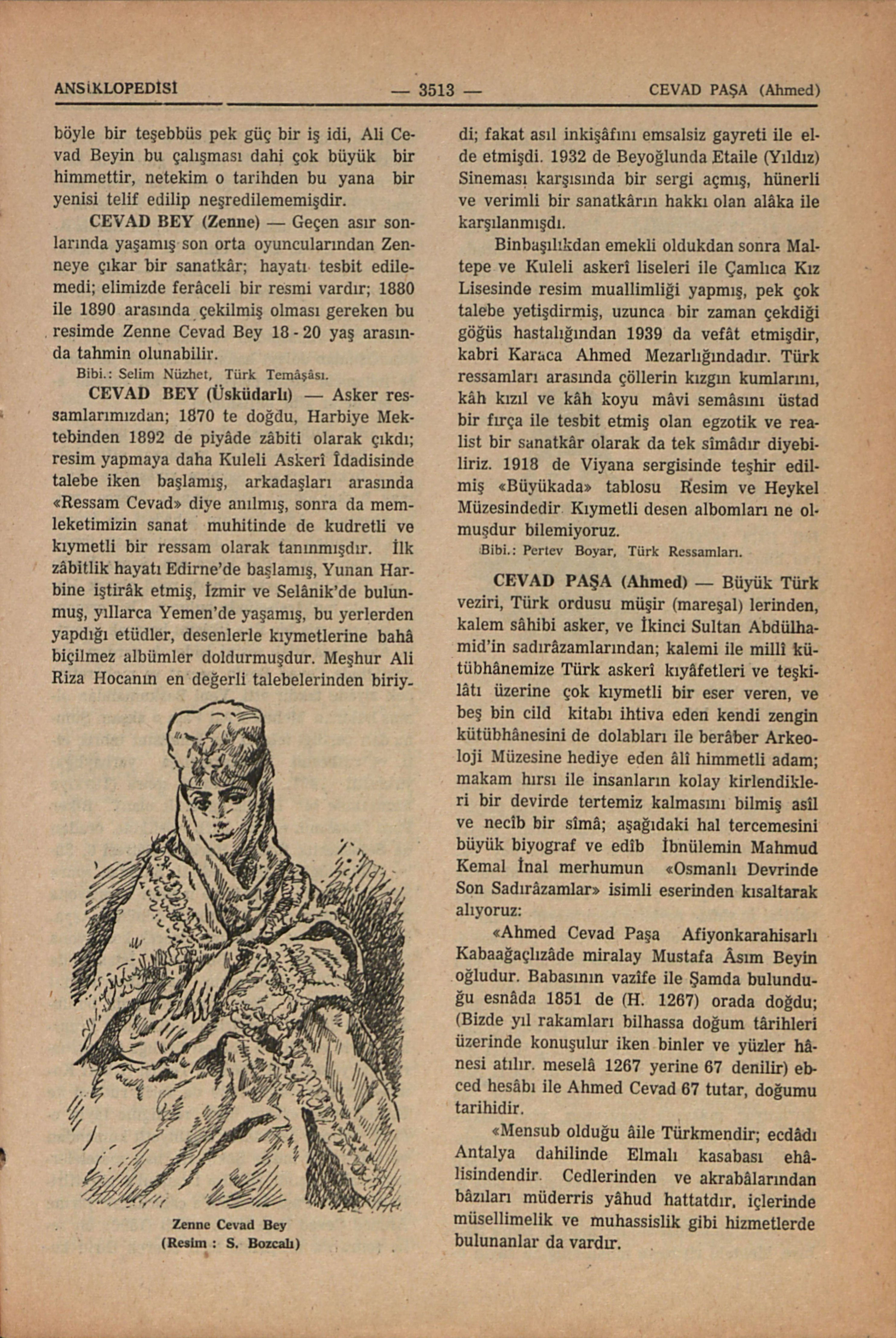 Geçen asır sonlarında yaşamış son orta oyuncularından Zenneye çıkar bir sanatkâr; hayatı tesbit edilemedi; elimizde ferâceli bir resmi vardır; 1880 ile 1890 arasında çekilmiş olması gereken bu resimde Zenne Cevad Bey 18-20 yaş arasında tahmin olunabilir.