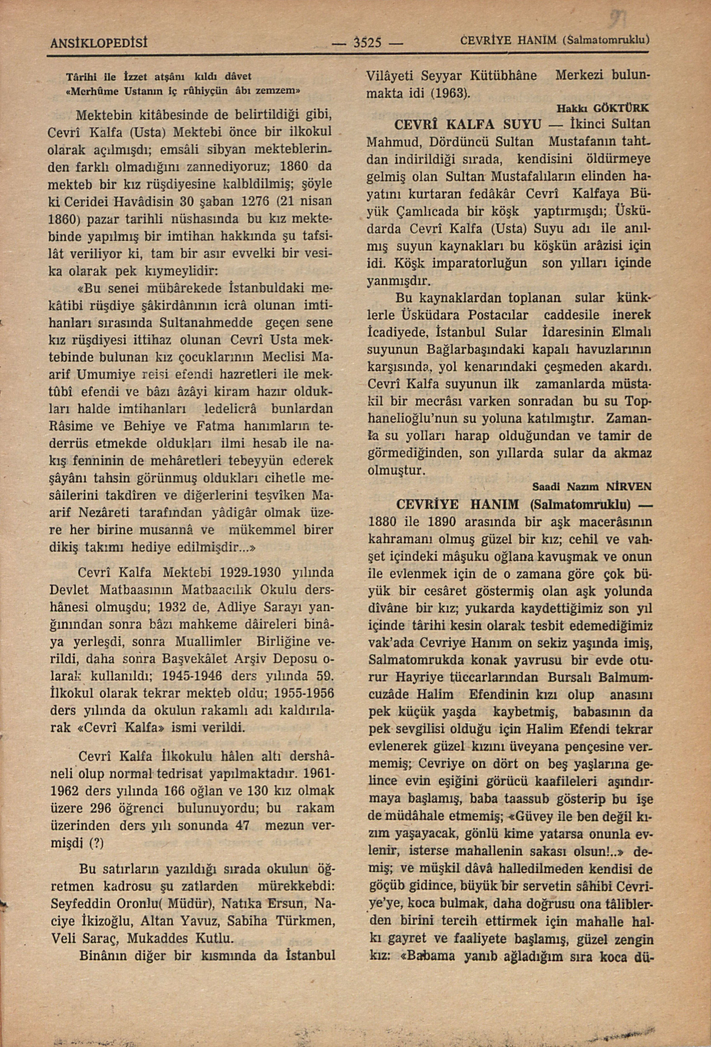 İkinci Sultan Mahmud, Dördüncü Sultan Mustafanın tahtdan indirildiği sırada, kendisini öldürmeye gelmiş olan Sultan Mustafalıların elinden hayatını kurtaran fedâkâr Cevrî Kalfaya Büyük Çamlıcada bir köşk yaptırmışdı; Üsküdarda Cevri Kalfa (Usta) Suyu adı ile anılmış suyun kaynakları bu köşkün arâzisi için idi. Köşk imparatorluğun son yılları içinde yanmışdır. Bu kaynaklardan toplanan sular künklerle Üsküdar Postacılar caddesile inerek İcadiyede, İstanbul Sular İdaresinin Elmalı suyunun Bağlarbaşındaki kapalı havuzlarının karşısında, yol kenarındaki çeşmeden akardı. Cevrî Kalfa suyunun ilk zamanlarda müstakil bir mecrâsı varken sonradan bu su Tophanelioğlu’nun su yoluna katılmıştır. Zamana su yolları harap olduğundan ve tamir de görmediğinden, son yıllarda sular da akmaz olmuştur. Sadi Nazım NİRVEN