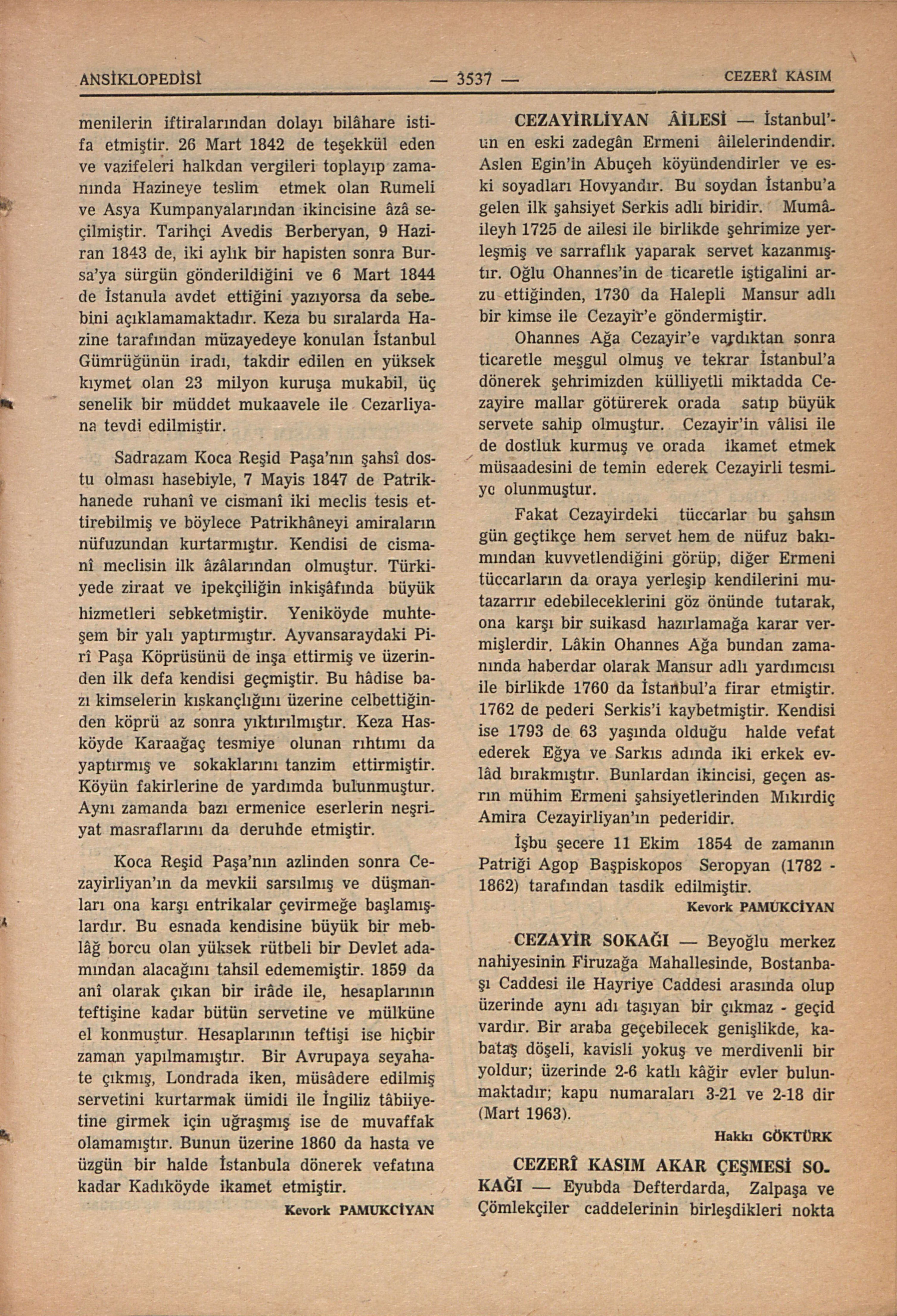 İstanbul’un en eski zadegân Ermeni âilelerindendir. Aslen Egin’in Abuçeh köyündendirler ve eski soyadları Hovyandır. Bu soydan İstanbul’a gelen ilk şahsiyet Serkiz adlı biridir. Mumâileyh 1725 de ailesi ile birlikte şehrimize yerleşmiş ve sarraflık yaparak servet kazanmıştır. Oğlu Ohannes’in de ticaretle iştigalini arzu ettiğinden, 1730 de Halepli Mansur adlı bir kimse ile Cezayir’e göndermiştir. Ohannes Ağa Cezayir’e vardıktan sonra ticaretle meşgul olmuş ve tekrar İstanbul’a dönerek şehrimizden külliyetli miktadda Cezayire mallar götürerek orada satıp büyük servete sahip olmuştur. Cezayir’in vâlisi ile de dostluk kurmuş ve orada ikamet etmek müsaadesini de temin ederek Cezayirli tesmiye olunmuştur. Fakat Cezayirdeki tüccarlar bu şahsın gün geçtikçe hem servet hem de nüfuz bakımından kuvvetlendiğini görüp, diğer Ermeni tüccarların da oraya yerleşip kendilerini mutazarrır edebileceklerini göz önünde tutarak, ona karşı bir suikasd hazırlamağa karar vermişlerdir. Lâkin Ohannes Ağa bundan zamanında haberdar olarak Mansur adlı yardımcısı ile birlikde 1760 da İstanbul’a firar etmiştir. 1762 de 63 yaşında olduğu halde vefat ederek Eğya ve Sarkıs adında iki erkek evlâd bırakmıştır. Bunlardan ikincisi, geçen asrın mühim Ermeni şahsiyetlerinden Mıkırdiç Amira Cezayirliyan’ın pederidir. ...