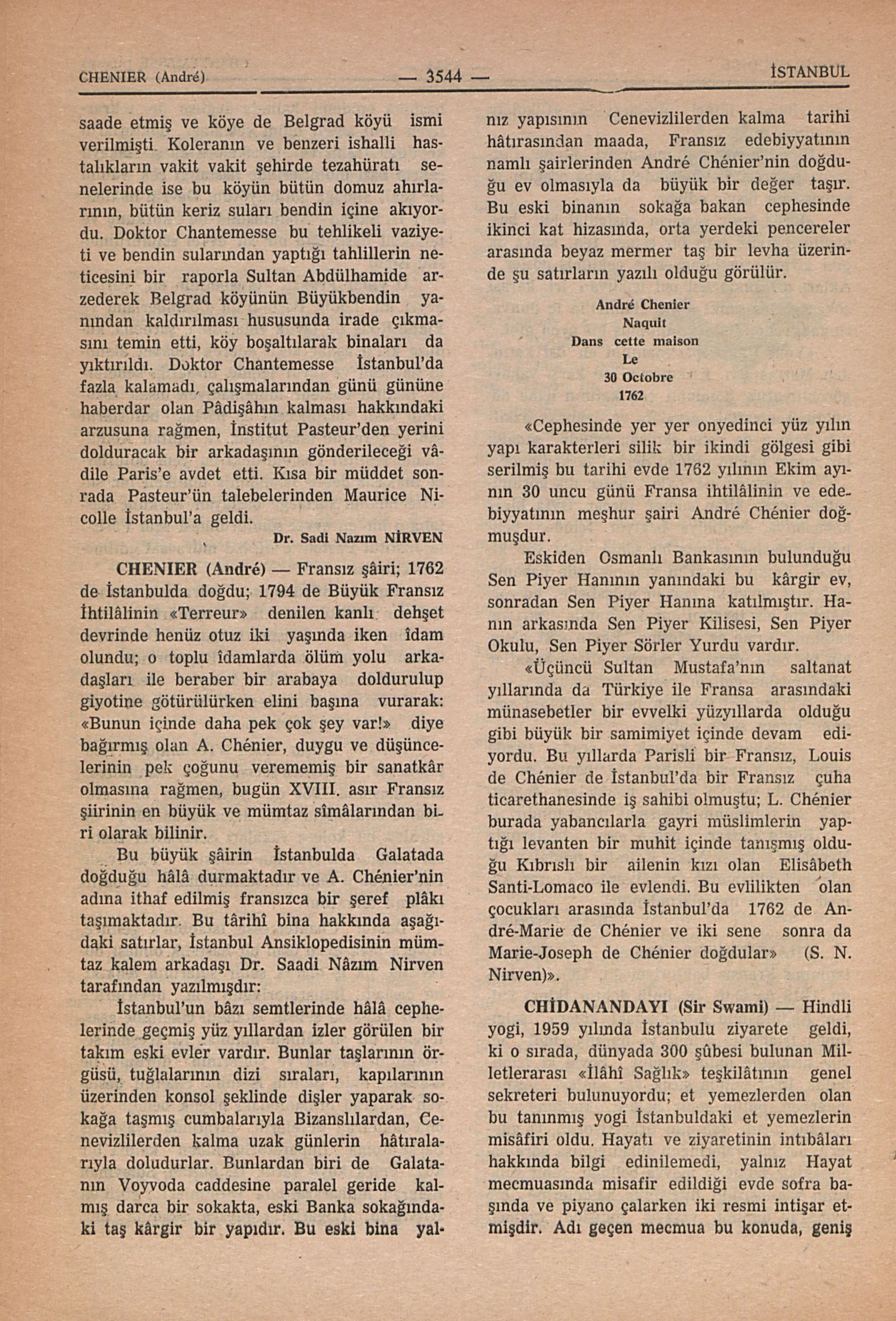Fransız şâiri; 1762 de İstanbulda doğdu; 1794 de Büyük Fransız İhtilâlinin “Terreur” denilen kanlı dehşet devrinde henüz otuz iki yaşında iken îdam olundu; o toplu îdamlarda ölüm yolu arkadaşları ile beraber bir arabaya doldurulup giyotine götürülürken elini başına vurarak: “Bunun içinde daha pek çok şey var!” diye bağırmış olan A. Chénier, duygu ve düşüncelerinin pek çoğunu verememiş bir sanatkâr olmasına rağmen, bugün XVIII. Asır Fransız şiirinin en büyük ve mümtaz sîmâlarından biri olarak bilinir. Bu büyük şâirin İstanbulda Galatada doğduğu hâlâ durmaktadır ve A. Chénier’nin adına ithaf edilmiş fransızca bir şeref plâkı taşımaktadır. Bu târihî bina hakkında aşağıdaki satırlar, İstanbul Ansiklopedisinin mümtaz kalem arkadaşı Dr. Saadi Nâzım Nirven tarafından yazılmışdır: İstanbul’un bâzı semtlerinde hâlâ cephelerinde geçmiş yüz yıllardan izler görülen bir takım eski evler vardır. Bunlar taşlarının örgüsü, tuğlalarının dizi sıraları, kapılarının üzerinden konsol şeklinde dişler yaparak sokağa taşmış cumbalarıyla Bizanslılardan, Cenevizlilerden kalma uzak günlerin hâtıralarıyla doludurlar. Bunlardan biri de Galatanın Voyvoda caddesine paralel geride kalmış darca bir sokakta, eski Banka sokağındaki taş kârgir bir yapıdır. Bu eski bina yalnız yapısının Cenevizlilerden kalma tarihi ...
