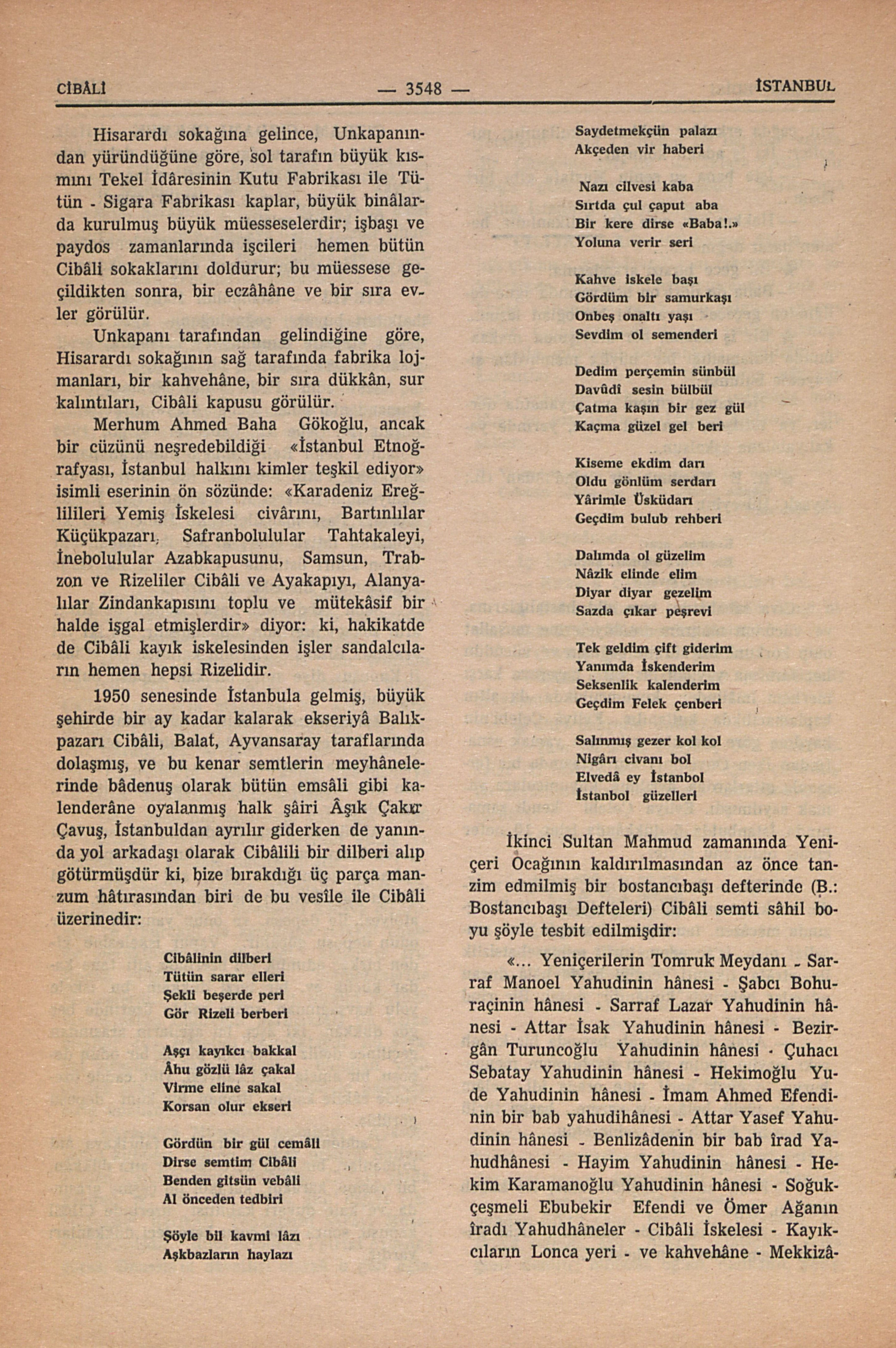 İstanbulun Halic kıyısında, halkının büyük çoğunluğunu ayak takımı teşkil etmekle tanınmış ve kalabalık, kesif iskân bölgesi olagelmiş bir semti. Semt adını, Fatih Sultan Mehmed devri kumandanlarından Cebe Ali’ye nisbetle almışdır (B.: Cebe Ali; Cemeciler Ocağı); 1934 Belediye Şehir Rehberinin 8 numaralı paftasına göre Fâtih Kazâsının (ilçesinin) merkez nâhiyesinin Haraccı Kara Mehmed ve Küçük Mustafa Paşa mahallelerinin Halic yalısı kısımlarını ihtivâ eder; ki bu iki mahallenin hemen sınırı üstünde Cibâli adı ile Halic vapurlarının bir iskelesi vardır. Semt, Abdülezel Paşa Caddesi ile Hisar ardı sokağı üzerinde toplanmışdır; bu iki yol arasında Bizans surlarının kalıntısı ile “Cibâli Kapusu” diye anılır bir kale kapusu bulunmaktadır. Zamanımızda Cibâliye hüviyetini veren, Tekel İdaresinin burada kurulmuş olan Tütün - Sigara Fabrikası ile bu büyük müessesesinin müştemilâtı ve büyük fabrikanın işçileri ameleleridir. Abdülezel Paşa Caddesinin bu semtden geçen kısmı bir çarşı boyudur; Unkapanı tarafından gelindiğine göre, sağ kolda Tekel Tütün Fabrikasının bıçkınhanesi, garajı, bir atölyesi ile deposu, ve onun yanında da bir odun deposu görülür. Vapur iskelesine giden birkaç adımlık yol üzerinde altı tane kadar küçük ev, bir terzi dükkânı, bu iskele yolu kavşağından sonra cadde üzerinde beş göz dükkân, iki aşcı, bu aşcıların arasından geçilince deniz kenarında büyük bir odun deposu, bir amele - işçi kahvesi, yine cadde üzerinde sâhile kadar uzanan bir kum deposu görülür. Caddenin sol kenarında fabrikaya âid lojmanlar, birkaçı keresteci bir sıra dükkân, bir çeşme, karakol, karakol ile çeşme arasında ve kale duvarı kalıntısı üzerinde Cibâli kapusu, sonra yine çoğu keresteci dükkânları vardır. Hisarardı sokağına gelince, Unkapanından yüründüğüne göre, kol tarafın büyük kısmını Tekel İdâresinin Kutu Fabrikası ile Tütün - Sigara Fabrikası kaplar ,büyük binâlarda kurulmuş büyük müesselerdir; işbaşı ve paydos zamanlarında işçileri hemen bütün Cibâli sokaklarını doldurur; bu müessese geçildikten sonra, bir eczâhâne ve bir sıra evler görülür. Unkapanı tarafından gelindiğine göre, Hisarardı sokağının sağ tarafında fabrika lojmanları, bir kahvehâne, bir sıra dükkân, sur kalıntıları, Cibâli kapusu görülür. Merhum Ahmed Baha Gökoğlu, ancak bir cüzünü neşredebildiği “İstanbul Etnoğrafyası, İstanbul halkını kimler teşkil ediyor” isimli eserinin ön sözünde: “Karadeniz Ereğlileri Yemiş İskelesi civârını, Bartınlılar Küçükpazarı, Safranbolulular Tahtakaleyi, İnebolulular Azabkapusunu, Samsun, Trabzon ve Rizeliler Cibâli ve Ayakapıyı, Alanyalılar Zindankapısınını toplu ve mütekâsif bir halde işgal etmişlerdir” diyor: ki, hakikatde de Cibâli kayık iskelesinden işler sandalcıların hemen hepsi Rizelidir. 1950 senesinde İstanbula gelmiş büyük şehirde bir ay kadar kalarak ekseriyâ Balıkpazarı Cibâli, Balat, Ayvansaray taraflarında dolaşmış, ve bu kenar semtlerin meyhânelerinde bâdenuş olarak bütün emsâli gibi kalenderâne oyalanmış halk şâiri Âşık Çakır Çavuş, İstanbuldan ayrılır giderken de yanında yol arkadaşı olarak Cibâlili bir dilberi alıp götürmüşdür ki, bize bırakdığı üç parça manzum hâtırasından biri de bu vesîle ile Cibâli üzerinedir: Cibâlinin dilberi Tütün sarar elleri Şekil beşerde peri Gör Rizeli berberi Aşçı kayıkcı bakkal Âhu gözlü lâz çakal Virme eline sakal Korsan olur ekseri Gördün bir gül cemâli Dirse semtin Cibâli Benden gitsün vebâli Al önceden tedbiri Şöyle bil kavmi lâzı Aşkbazların haylazı Saydetmekçün palazı Akçeden vir haberi Nazı cilvesi kaba Sırtda çul çaput aba Bir kere dirse “Baba!.” Yoluna verir seri Kahve iskele başı Gördüm bir samurkaşı Onbeş onaltı yaşı Sevdim ol semenderi Dedim perçemin sünbül Davûdî sesin bülbül Çatma kaşın bir gez gül Kaçma güzel gel beri Kiseme ekdim darı Oldu gönlüm serdarı Yârimle Üsküdarı Gecdim bulub rehberi Dalımda ol güzelim Nâzik elinde elim Diyar diyar gezelim Sazda çıkar peşrevi Tek geldim çift giderim Yanımda İskenderim Seksenlik kalenderim Gecdim Felek çenberi Salınmış gezer kol kol Nigârı civanı bol Elvedâ ey İstanbol İstanbol güzelleri İkinci Sultan Mahmud zamanında Yeniçeri Ocağının kaldırılmasından az önce tanzim edmilmiş bir bostancıbaşı defterinde (B.: Bostancıbaşı Defterleri) Cibâli semti sâhil boyu şöyle tesbit edilmişdir: “... Yeniçerilerin Tomruk Meydanı - Sarraf Manoel Yahudinin hânesi - Şabcı Bohuraçinin hânesi - Sarraf Lazar Yahudinin hânesi - Attar İsak Yahudinin hânesi - Bezirgân Turuncoğlu Yahudinin hânesi - Çuhacı Sebatay Yahudinin hânesi - Hekimoğlu Yude Yahudinin hânesi - İmam Ahmed Efendinin bir bab yahudihânesi - Attar Yasef Yahudinin hânesi - Benlizâdenin bir bab îrad Yahudhânesi - Hayim Yahudinin hânesi - Hekim Karamanoğlu Yahudinin hânesi - Soğukçeşmeli Ebubekir Efendi ve Ömer Ağanın îradı Yahudhâneler - Cibâli İskelesi - Kayıkcıların Lonca yeri - ve kahvehâne - Mekkizâdenin îradı bir bab yahudhane - ve üç aded kahvehânesi - Hacı Mehmedin îrâdı bir bab yahudhâne - Üsküdarlı Ayşe Hanımın keresteci dükkânları - Efrenc hekimin hânesi - Terzi Manol zimminin hânesi - Saatcioğlu Yorgaki Zimmimin hânesi - Çuhacı Yorgu oğlunun hânesi ve kayıkhânesi - Şabcı dâmâdı Knorte Yahudinin hânesi - Şabcı Yako Yahudinin hânesi - Simkeş Yahudinin hânesi - Şalcı Apostol Zimminin hânesi - Kuyumcu Dimitri oğlunun hânesi - İpekci Dimitri Zimminin hânesi...”. 1826 dan az evvel tanzim edilmiş bu kıymetli vesikada aydın olarak görülüyor ki, zamanımızdan bir buçuk asır e