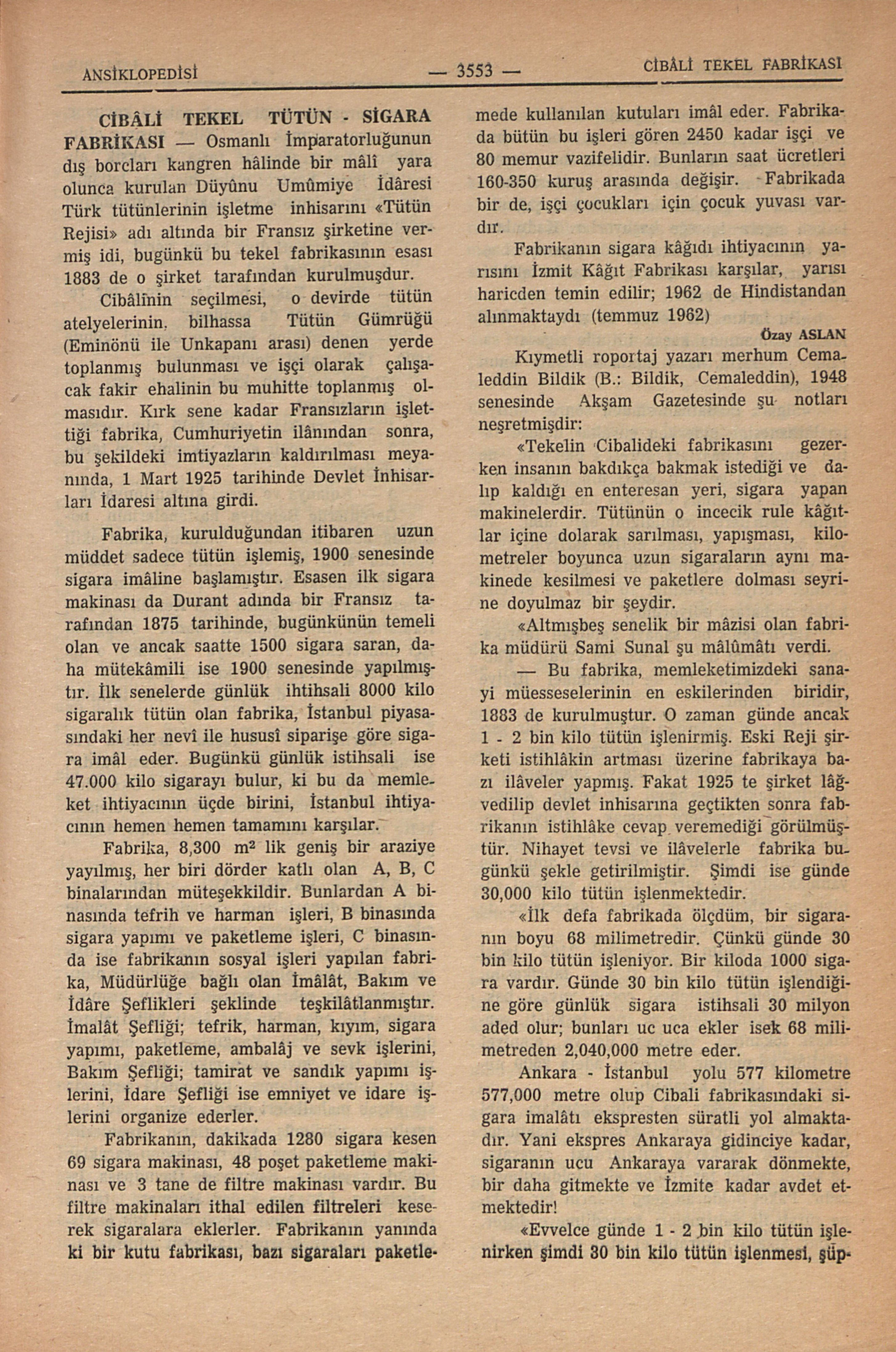 Osmanlı İmparatorluğunun dış borcları kangren hâlinde bir mâli yara olunca kurulan Düyûnu Umûmiye İdâresi Türk tütünlerinin işletme inhisarını “Tütün Rejisi” adı altında bir Fransız şirketine vermiş idi, bugünkü bu tekel fabrikasının esası 1883 de o şirket tarafından kurulmuşdur. Cibâlinin seçilmesi, o devirde tütün atelyelerinin, bilhassa Tütün Gümrüğü (Eminönü ile Unkapanı arası) denen yerde toplanmış bulunması ve işçi olarak çalışacak fakir ehalinin bu muhitte toplanmış olmasıdır. Kırk sene kadar Fransızların işlettiği fabrika, Cumhuriyetin ilânından sonra, bu şekildeki imtiyazların kaldırılması meyanında, 1 Mart 1925 tarihinde Devlet İnhisarları İdaresi altına girdi. Fabrika, kurulduğundan itibaren uzun müddet sadece tütün işlemiş, 1900 senesinde sigara imâline başlamıştır. Esasen ilk sigara makinası da Durant adında bir Fransız tarafından 1875 tarihinde, bugünkünün temeli olan ve ancak saatte 1500 sigara saran, daha mütekâmili ise 1900 senesinde yapılmıştır. İlk senelerde günlük ihtihsali 8000 kilo sigaralık tütün olan fabrika, İstanbul piyasasındaki her nevi ile hususî siparişe göre sigara imâl eder. Bugünkü günlük istihsali ise 47.000 kilo sigarayı bulur, ki bu da memleket ihtiyacının üçde birini, İstanbul ihtiyacının hemen hemen tamamını karşılar. Fabrika, 8.300 m2 lik geniş bir araziye yayılmış, her biri dörder katlı olan A, B, C binalarından müşekkildir. Bunlarda A binasında tefrih ve harman işleri, B binasında sigara yapımı ve paketleme işleri, C binasında ise fabrikanın sosyal işleri yapılan fabrika, Müdürlüğe bağlı olan imâlât, Bakım ve İdâre Şeflikleri şeklinde teşkilâtlanmıştır. İmâlat Şefliği, tefrik, harman, kıyım, sigara yapımı, paketleme, ambalâj ve sevk işlerini, Bakım Şefliği; tamirat ve sandık yapımı işlerini, İdare Şefliği ise emniyet ve idare işlerini organize ederler. Fabrikanın, dakikada 1280 sigara kesen 69 sigara makinası, 48 poşet paketleme makinası ve 3 tane de filtre makinası vardır. Bu filtre makinaları ithal edilen filtreleri keserek sigaralar eklerler. Fabrikanın yanında ki bir kutu fabrikası, bazı sigaraları paketlemede kullanılan kutuları imâl eder. Fabrikada bütün bu işleri göre 2450 kadar işçi ve 80 memur vazifelidir. Bunların saat ücretleri 160-350 kuruş arasında değişir. Fabrikada bir de, işçi çocukları için çocuk yuvası vardır. Fabrikanın sigara kâğıdı ihtiyacının yarısını İzmit Kâğıt Fabrikası karşılar, yarısı haricden temin edilir; 1962 de Hindistandan alınmaktaydı (temmuz 1962) Özay ASLAN Kıymetli roportaj yazarı merhum Cemaleddin Bildik (B.: Bildik, Cemaleddin), 1948 senesinde Akşam Gazetesinde şu notları neşretmişdir: “Tekelin Cibalideki fabrikasını gezerken insanın bakdıkça bakmak istediği ve dalıp kaldığı en enterasan yeri, sigara yapan makinelerdir. Tütünün o incecik rule kâğıtlar içine dolarak sarılması, yapışması, kilometreler boyunca uzun sigaraların aynı makinede kesilmesi ve paketlere dolması seyrine doyulmaz bir şeydir. “Altmışbeş senelik bir mâzisi olan fabrika müdürü Sami Sunal şu mâlûmâtı verdi. — Bu fabrika, memleketimizdeki sanayi müesseselerinin en eskilerinden biridir, 1883 de kurulmuştur. O zaman günde ancak 1-2 bin kilo tütün işlenirmiş. Eski Reji şirketi istihlâkin artması üzerine fabrikaya bazı ilâveler yapmış. Fakat 1925 te şirket lâğvedilip devlet inhisarına geçtikten sonra fabrikanın istihlâke cevap veremediği görülmüştür. Nihayet tevsi ve ilâvelerle fabrika bugünkü şekle getirilmiştir. Şimdi ise günde 30,000 kilo tütün işlenmektedir. “İlk defa fabrikada ölçdüm, bir sigaranın boyu 68 milimetredir. Çünkü günde 30 bin kilo tütün işleniyor. Bir kiloda 1000 sigara vardır. Günde 30 bin kilo tütün tütün işlendiğine göre günlük sigara istihsali 30 milyon aded olur; bunları uc uca ekler isek 68 milyon metreden 2.040,000 metre eder. Ankara - İstanbul yolu 577 kilometre 577,000 metre olup Cibâli fabrikasındaki sigara imalâtı ekspresten süratli yol almaktadır. Yani ekspres Ankaraya gidinceye kadar, sigaranın ucu Ankaraya vararak dönmekte, bir daha gitmekte ve İzmite kadar avdet etmektedir! “Evvelce günde 1-2 bin kilo tütün işlenirken şimdi 30 bin kilo tütün işlenmesi, şüphesiz, sigara içenlerin çoğaldığını ifade eder. Bıyığını burup, evlenmeden ve kendi başına buyruk olmadan sigara içmek son derece ayıptı. Kadınlardan ise gençler daha ortaokul çağındalarken sigara içmeğe başlıyorlar. Kadınlarımız da daha genc kızlıklarında sigaraya başlıyorlar. Bu arada sigarayı bir moda telâkkisile içenler de vardır. “Bu farkın bir sebebi de şudur ki Reji idaresi zamanında kaçak tütünle sigara saranlar da vardı, hazır sigara sarfiyatı onun için azdı. “Sigara imalâthanesinden sonra enfiye imalâthanesine giderken çuvallar dolusu tütün yaprağı damarları görerek bunların ne işe yaradığını sordum, enfiyenin, puroluk tütünlerden çıkarılmış bu kuru damarların toz haline getirilerek yapıldığını öğrendim; ve yine öğrendim ki bizde, enfiye sarfiyatı ayda 3-4 yüz kilo etrafında imiş; sigara sarfiyatı artmış, enfiye tiryakiliği 10-15 yıl evvelki halini muhafaza ediyormuş. Hayli geniş bir sahayı kaplıyan fabrikada, kutu kısmı hariç, 2162 işçi vardır. Fabrikanın 16 kişilik bir de mükemmel itfaiye teşkilâtı vardır. İtfâiyeye işçilerden de 20 kişilik bir yardımcı ekip verilmişdir. Fabrikanın her tarafı elektrikli düğmelerle itfaiye salonuna bağlı bulunmakta, herhangi bir yerde yangın olunca bu düğmelere basmak, itfaiyeyi çağırmak için kâfi gelmektedir. Hattâ o düğmelere basılınca müdiriyet odasındaki ampul de yanmaktadır. Bu suretle yangın, sani