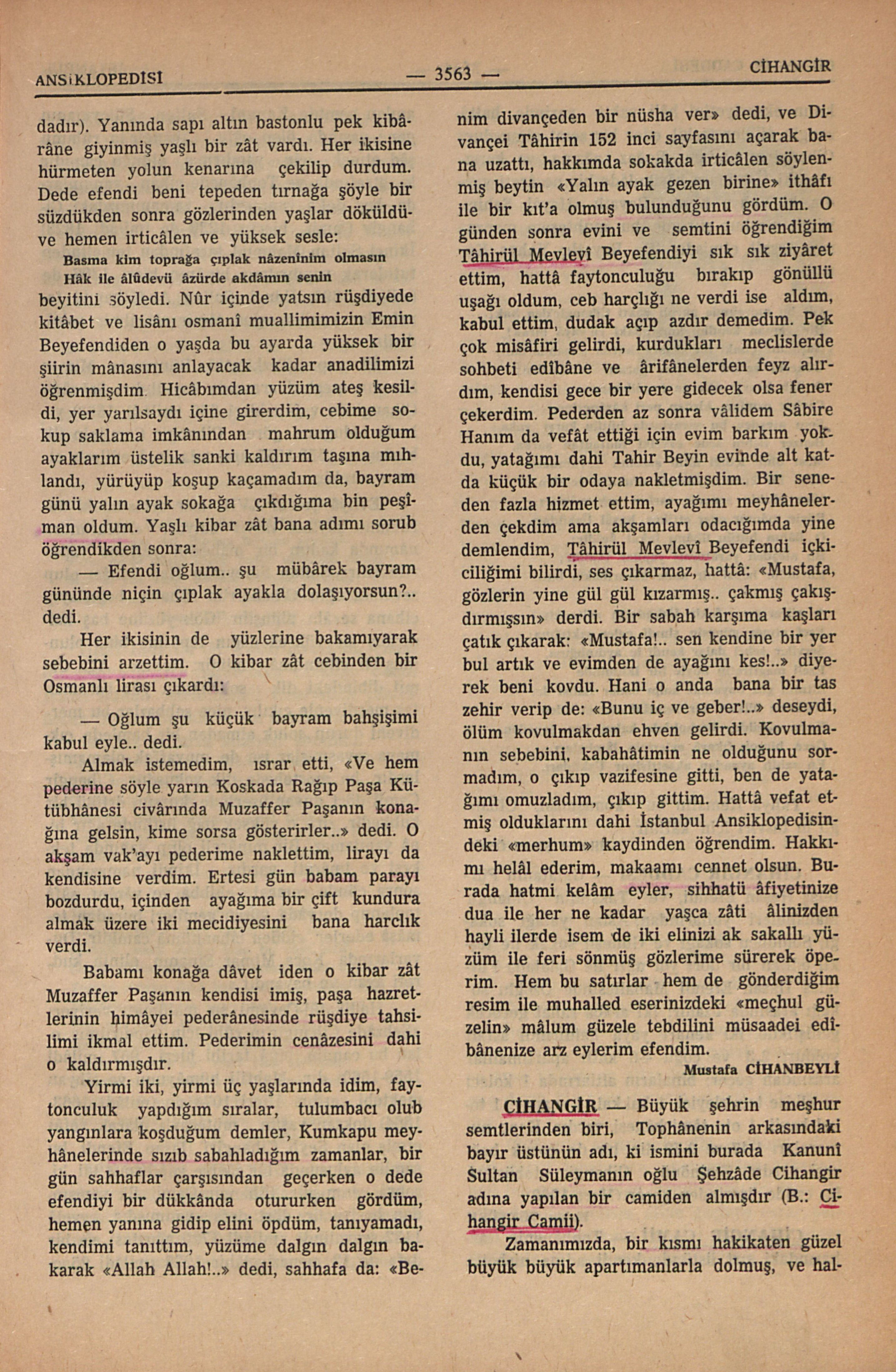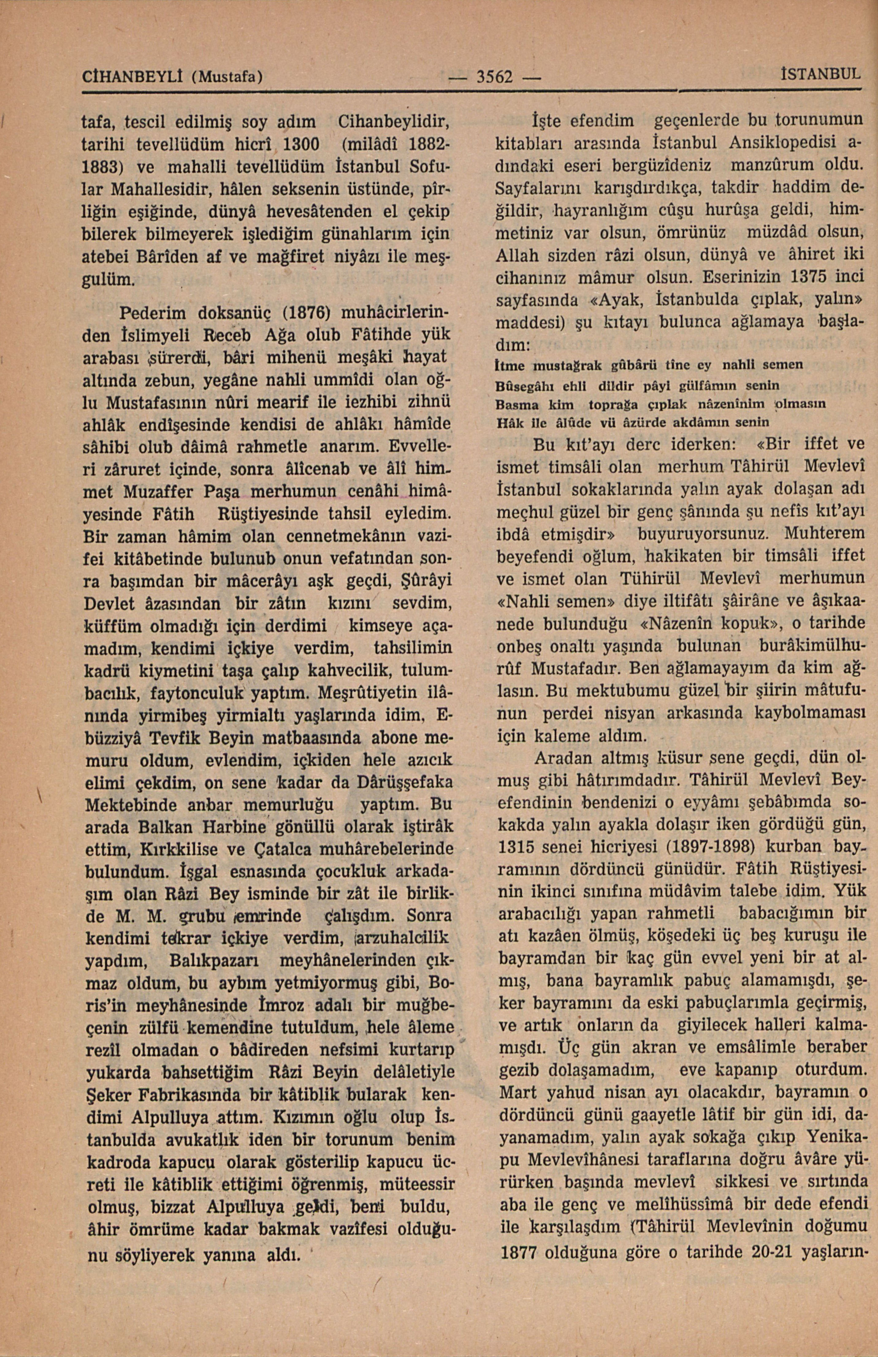 İsmim Mustafa, tescil edilmiş soy adım Cihanbeylidir, tarihi tevelüdüm hicrî 1300 (milâdî 1882-1883) ve mahalli tevellüdüm İstanbul Sofular Mahallesidir, hâlen seksenin üstünde, pîrliğin eşiğinde, dünyâ hevesâtenden el çekip bilerek bilmeyerek işlediğim günahlarım için atebei Bârîden af ve mağfiret niyâzı ile meşgulüm. Pederim doksanüç (1876) muhâcirlerinden İslimyeli Receb Ağa olub Fâtihde yük arabası sürerdi, bâri mihenü meşâki hayat altında zebun, yegâne nahli ummîdi olan oğlu Mustafasının nûri mearif ile iezhibi zihnü ahlâk endîşesinde kendisi de ahlâkı hâmîde sâhibi olub dâimâ rahmetle anarım. Evvelli zâruret içinde, sonra âlîcenab ve âlî himmet Muzaffer Paşa merhumun cenâhi himâyesinde Fâtih Rüştiyesinde tahsil eyledim. Bir zaman hâmim olan cennetmekânın vazifei kitâbetinde bulunub onun vefatından sonra başımdan bir mâcerâyı aşk geçdi, Şûrâyi Devlet âzasından bir zâtın kızını sevdim, küffüm olmadığı için derdimi kimseye açamadım, kendimi içkiye verdim, tahsilimin kadrü kiymetini taşa çalıp kahvecilik, tulumbacılık, faytonculuk yaptım. Meşrûtiyetin ilânında yirmibeş yirmialtı yaşlarında idim, Ebüzziyâ Tevfik Beyin matbaasında abone memuru oldum, evlendim, içkiden hele azıcık elimi çekdim, on sene kadar da Dârüşşefaka Mektebinde anbar memurluğu yaptım. Bu arada Balkan Harbine gönüllü olarak iştirâk ettim, Kırkkilise ve Çatalca muhârebelerinde bulundum. İşgal esnasında çocukluk arkadaşım olan Râzi Bey isminde bir zât ile birlikte M. M. Grubu emrinde çalışdım. Sonra kendimi tekrar içkiye verdim, arzuhalcilik yapdım, Balıkpazarı meyhânelerinden çıkmaz oldum, bu aybım yetmiyormuş gibi, Boris’in meyhânesinde İmroz adalı bir muğbeçenin zülfü kemendine tutuldum, hele âleme rezîl olmadan o bâdireden nefsimi kurtarıp yukarda bahsettiğim Râzi Beyin delâletiyle Şeker Fabrikasında bir kâtiblik bularak kendimi Alpulluya attım. Kızımın oğlu olup İstanbulda avukatlık iden bir torunum benim kadroda kapucu olarak gösterilip kapucu ücreti ile kâtiblik ettiğimi öğrenmiş, müteessir olmuş, bizzat Alpulluya geldi, beni buldu, âhir ömrüme kadar bakmak vazîfesi olduğunu söyliyerek yanına aldı. İşte efendim geçenlerde bu torunumun kitabları arasında İstanbul Ansiklopedisi adındaki eseri bergüzîdeniz manzûrum oldu. Sayfalarını karışdırdıkça, takdir haddim değildir, hayranlığım cûşu hurûşa geldi, himmetiniz var olsun, ömrünüz müzdâd olsun, Allah sizden râzi olsun, dünyâ ve âhiret iki cihanınız mâmur olsun. Eserinizin 1375 inci sayfasında “Ayak, İstanbulda çıplak, yalın” maddesi) şu kıtayı bulunca ağlamaya başladım: İtme mustağrak gûbârü tîne ey nahli semen Bûsegâhı ehli dildir pâyi gülfâmın senin Basma kim toprağa çıplak nâzenînim olmasın Hâk ile âlûde vü âzürde akdâmın senin Bu kıt’ayı derc iderken: “Bir iffet ve ismet timsâli olan merhum Tâhirül Mevlevî İstanbul sokaklarında yalın ayak dolaşan adı meçhul güzel bir genç şânında şu nefîs kıt’ayı ibdâ etmişdir” buyuruyorsunuz. Muhtereme beyefendi oğlum, hakikaten bir timsâli iffet ve ismet olan Tühirül Mevlevî merhumun “Nahli semen” diye iltifâtı şâirâne ve âşıkaanede bulunduğu “Nâzenîn kopuk”, o tarihde onbeş onaltı yaşında bulunan burâkimülhurûf Mustafadır. Ben ağlamayayım da kim ağlasın. Bu mektubumu güzel bir şiirin mâtufunun perdei nisyan arkasında kaybolmaması için kaleme aldım. Aradan altmış küsur sene geçdi, dün olmuş gibi hâtırımdadır. Tâhirül Mevlevî Beyefendinin bendenizi o eyyâmı şebâbımda sokakda yalın ayakla dolaşır iken gördüğü gün, 1315 senei hicriyesi (1897-1898) kurban bayramının dördüncü günüdür. Fâtih Rüştiyesinin ikinci sınıfına müdâvim talebe idim. Yük arabacılığı yapan rahmetli babacığımın bir atı kazâen ölmüş, köşedeki üç beş kuruşu ile bayramdan birkaç gün evvel yeni bir at almış, bana bayramlık pabuç alamamışdı, şeker bayamını da eski pabuçlarımla geçirmiş, ve artık onların da giyilecek halleri kalmamışdı. Üç gün akran ve emsâlimle beraber gezib dolaşamadım, eve kapanıp oturdum. Mart yahud nisan ayı olacakdır, bayramın o dördüncü günü gaayetle lâtif bir gün idi, dayanamadım, yalın ayak sokağa çıkıp Yenikapu Mevlevîhânesi taraflarına doğru âvâre yürürken başında mevlevî sikkesi ve sırtında aba ile genç ve melîhüssîmâ bir dede efendi ile karşılaşdım (Tâhirül Mevlevînin doğumu 1877 olduğuna göre o tarihde 20-21 yaşlarındadır). Yanında sapı altın bastonlu pek kibârâne giyinmiş yaşlı bir zât vardı. Her ikisine hürmeten yolun kenarına çekilip durdum. Dede efendi beni tepeden tırnağa şöyle bir süzdükten sonra gözlerinden yaşlar döküldü ve hemen irticâlen ve yüksek sesle: Basma kim toprağa çıplak nâzenînim olmasın Hâk ile âlûdevü âzürde akdâmın senin beyitini söyledi. Nûr içinde yatsın rüşdiyede kitâbet ve lisânı osmanî muallimimizin Emin Beyefendiden o yaşda bu ayarda yüksek bir şiirin mânasını anlayacak kadar anadilimizi öğrenmişdim. Hicâbımdan yüzüm ateş kesildi, yer yarılsaydı içine girerdim, cebime sokup saklama imkânından mahrum olduğum ayaklarım üstelik sanki kaldırım taşına mıhlandı, yürüyüp koşup kaçamadım da, bayram günü yalın ayak sokağa çıkdığıma bin peşîman oldum. Yaşlı kibat zât bana adımı sorub öğrendikten sonra: — Efendi oğlum.. şu mübâbek bayram gününde niçin çıplak ayakla dolaşıyorsun?.. dedi. Her ikisinin de yüzlerine bakamıyarak sebebini arzettim. O kibar zât cebinden bir Osmanlı lirası çıkardı: — Oğlum şu küçük bayram bahşişimi kabul eyle.. dedi. Almak istemedim, ısrar etti, “Ve hem pederine söyle ya