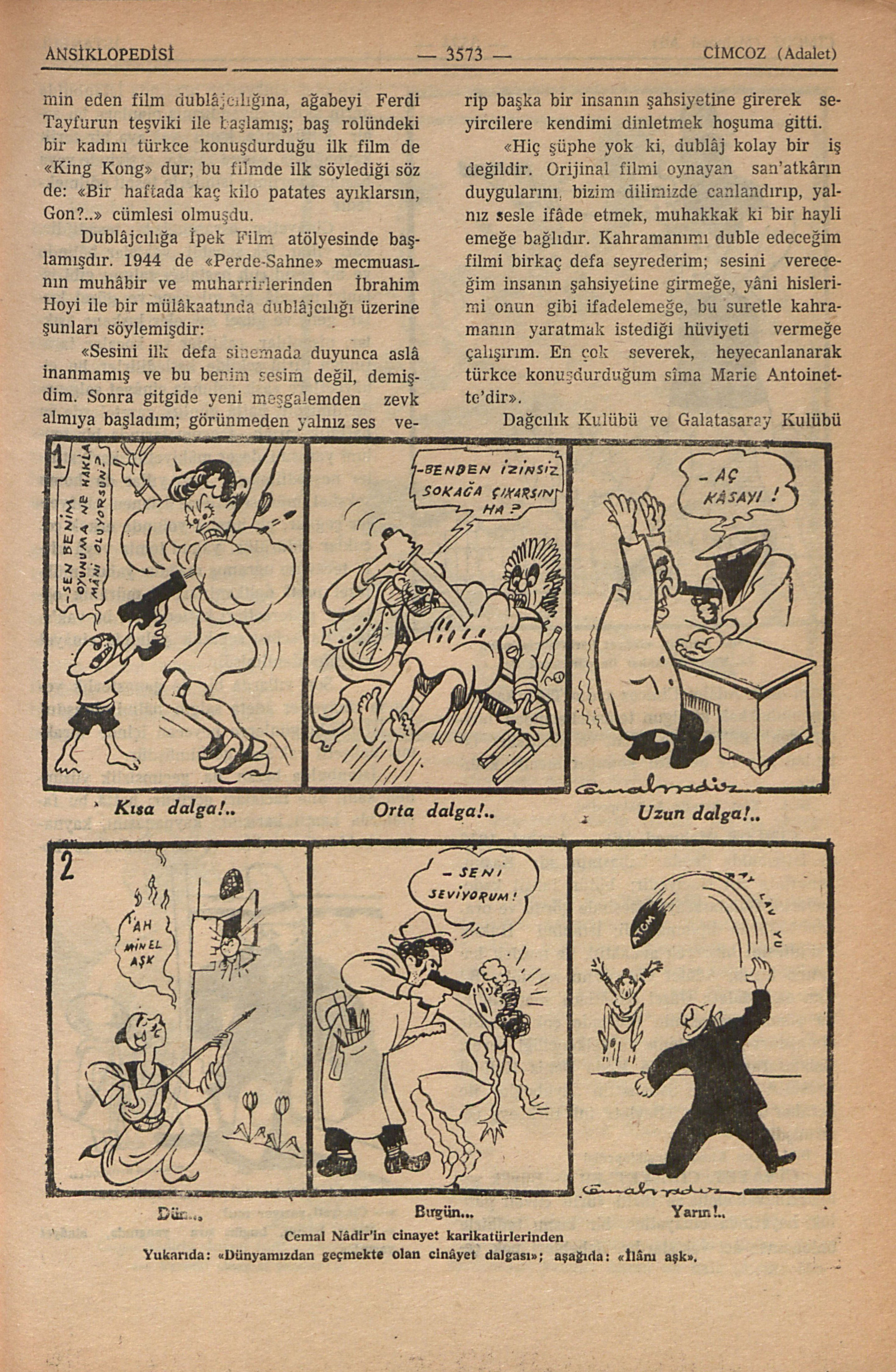 Adâlet Cimcoz kendisine ilk şöhreti temin eden film dublâjcılığına, ağabeyi Ferdi Tayfurun teşviki ile başlamış; baş rolündeki bir kadını türkce konuşdurduğu ilk film de “King Kong” dur; bu filmde ilk söylediği sözde: “Bir haftada kaç kilo patates ayıklarsın Gon?..” cümlesi olmuşdu.