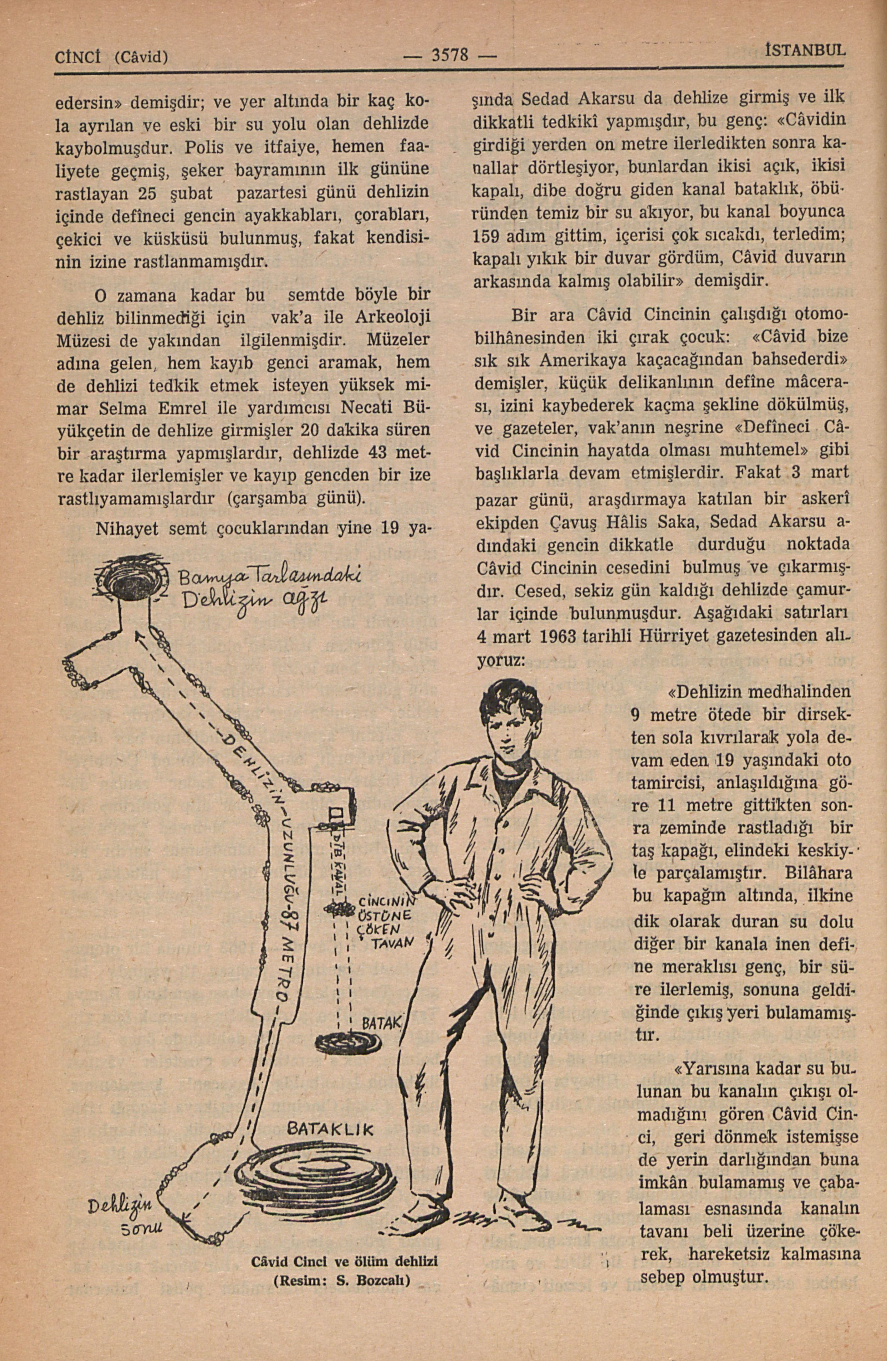 “Dehlizin medhalinden 9 metre ötede bir dirsekten sola kıvrılarak yola devam eden 19 yaşındaki oto tamircisi, anlaşıldığına göre 11 metre gittikten sonra zeminde rastladığı bir taş kapağı, elindeki keskiyle parçalamıştır. Bilâhara bu kapağın altında, ilkine dik olarak duran su dolu diğer bir kanala inen define meraklısı genç, bir süre ilerlemiş, sonuna geldiğinde çıkış yeri bulamamıştır.