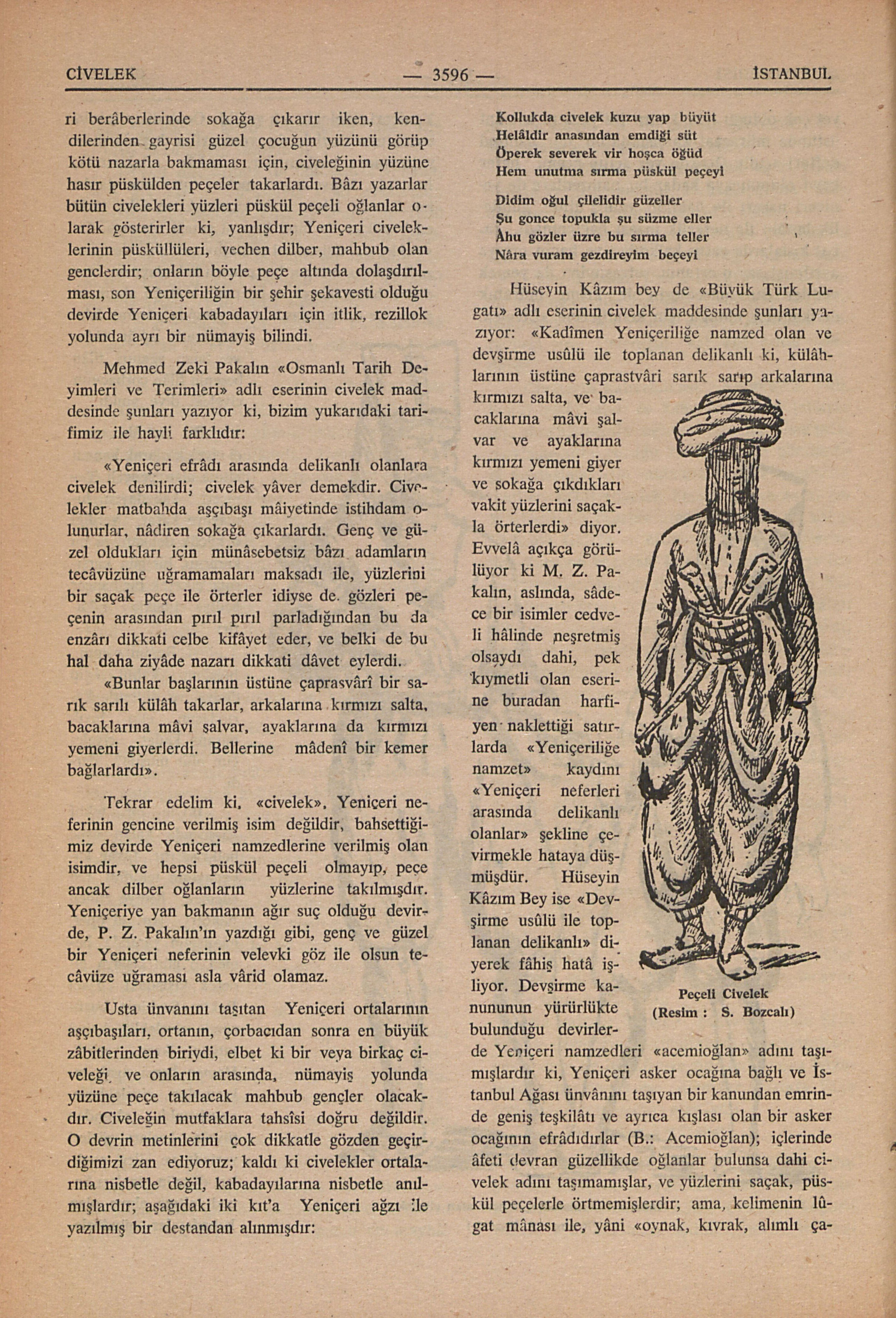 “Yeniçeri efrâdı arasında delikanlı olanlara civelek denilirdi; civelek yâver demekdir. Civelekler matbahda aşçıbaşı mâiyetinde istihdam olunurlar, nâdiren sokağa çıkarlardı. Genç ve güzel oldukları için münâsebetsiz bâzı adamların tecâvüzüne uğramamaları maksadı ile, yüzlerini bir saçak peçe ile örterler idiyse de gözleri peçenen arasından pırıl pırıl parladığından bu da enzârı dikkati celbe kifâyet eder, ve belki de bu hal daha ziyâde nazarı dikkati dâvet eylerdi.