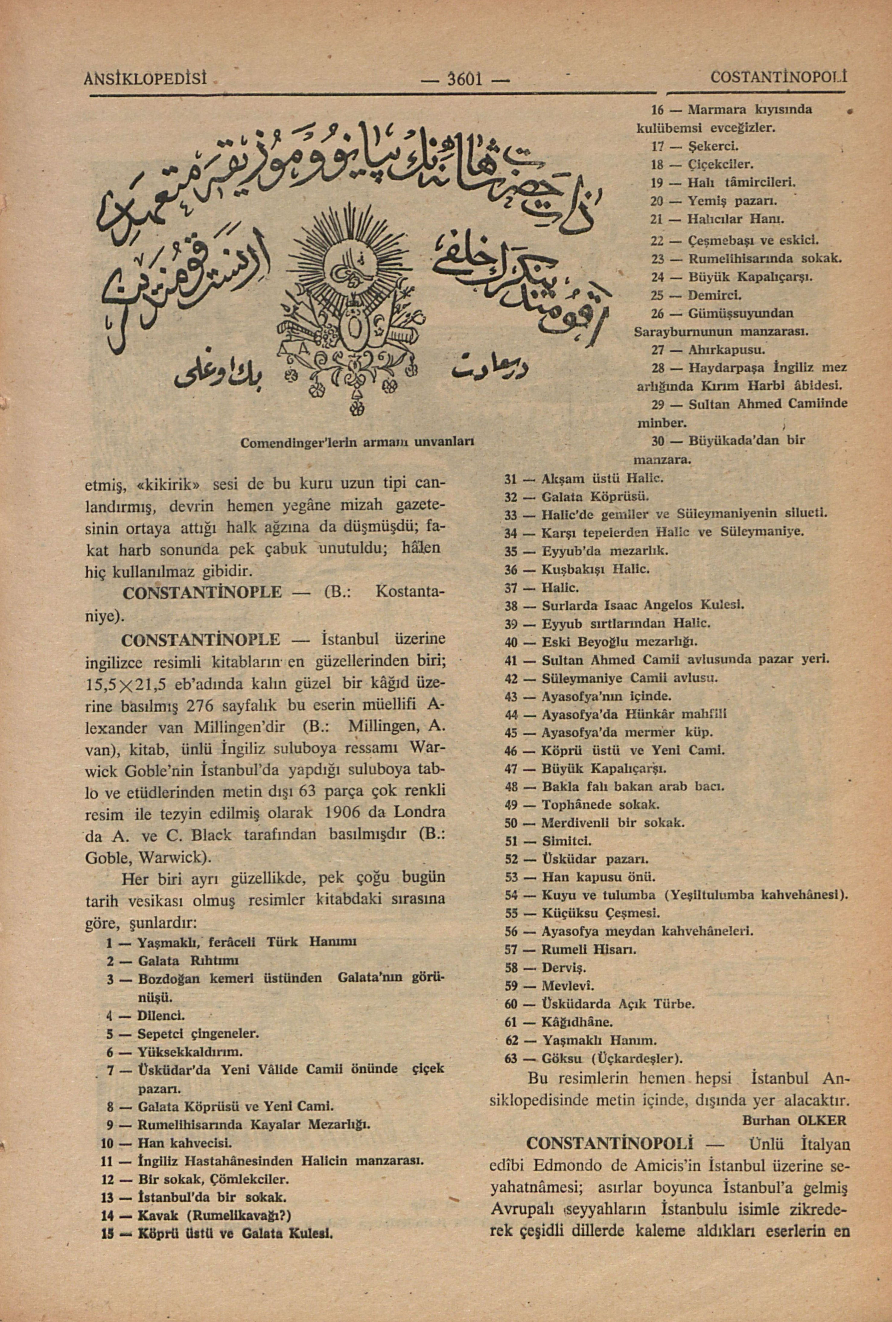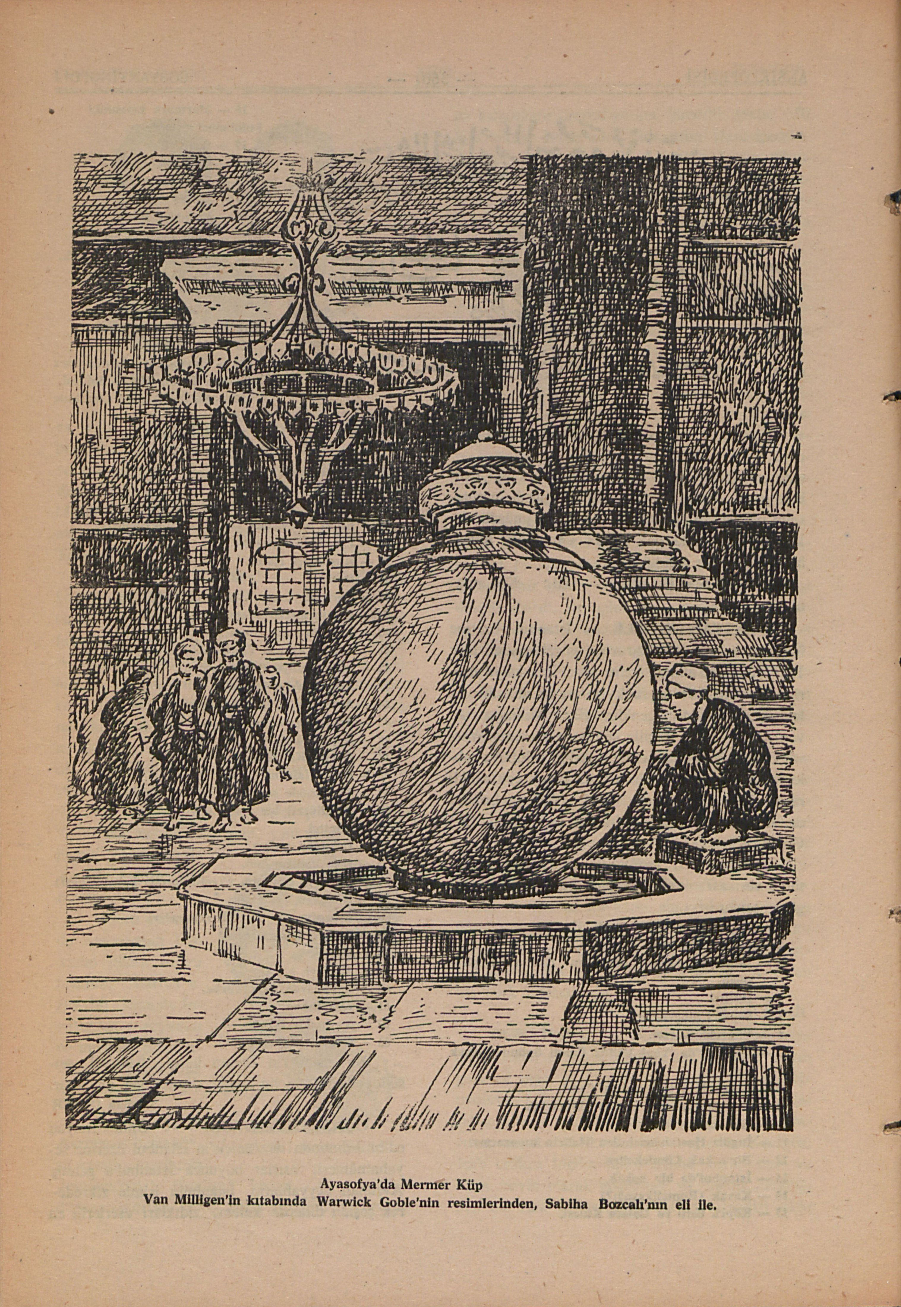 İstanbul üzerine ingilizce resimli kitabların en güzellerinden biri; 15,5X21,5 eb’adında kalın güzel bir kâğıd üzerine basılmış 276 sayfalık bu eserin müellifi Alexander van Millingen’dir (B.: Milingen, A. Van), kitab, ünlü İngiliz suluboya ressamı Warwick Goble’nin İstanbul’da yapdığı suluboya tablo ve etüdlerinden metin dışı 63 parça çok renkli resim ile tezyin edilmiş olarak 1906 da Londra da A. ve C. Black tarafından basılmışdır (B.: Goble, Warwick). Her biri ayrı güzellikde, pek çoğu bugün tarih vesikası olmuş resimler kitabdaki sırasına göre, şunlardır: 1– Yaşmaklı, ferâceli Türk Hanımı 2– Galata Rıhtımı 3– Bozdoğan kemeri üstünden Galata’nın görünüşü. 4– Dilenci. 5– Sepetçi çingeneler. 6– Yüksekkaldırım. 7– Üsküdar’da Yeni Vâlide Camii önünde çiçek pazarı. 8– Galata Köprüsü ve Yeni Cami. 9– Rumelihisarında Kayalar Mezarlığı. 10– Han kahvecisi. 11– İngiliz Hastahânesinden Halicin manzarası. 12– Bir sokak, Çömlekciler. 13– İstanbul’da bir sokak. 14– Kavak (Rumelikavağı?) 15– Köprü üstü ve Galata Kulesi. 16– Marmara kıyısında kulübemsi evceğizler. 17– Şekerci. 18– Çiçekciler. 19– Halı tâmircileri. 20– Yemiş pazarı. 21– Halıcılar Hanı. 22– Çeşmebaşı ve eskici. 23– Rumelihisarında sokak. 24– Büyük Kapalıçarşı. 25– Demirci. 26– Gümüşsuyundan Sarayburnunun manzarası. 27– Ahırkapusu. 28– Haydarpaşa İngiliz mezarlığında Kırım Harbi âbisedi. 29– Sultan Ahmed Camiinde minber. 30– Büyükada’dan bir manzara. 31– Akşam üstü Halic. 32– Galata Köprüsü. 33– Halic’de gemiler ve Süleymaniyenin silueti. 34– Karşı tepelerden Halic ve Süleymaniye. 35– Eyyub’da mezarlık. 36– Kuşbakışı Halic. 37– Halic. 38– Surlarda Isaac Angelos Kulesi. 39– Eyyub sırtlarından Halic. 40– Eski Beyoğlu mezarlığı. 41– Sultan Ahmed Camii avlusunda Pazar yeri. 43– Süleymaniye Camii avlusu. 43– Ayasofya’nın içinde. 44– Ayasofya’da Hünkâr mahfilli. 45– Ayasofya’da mermer küp. 46– Köprü üstü ve Yeni Cami. 47– Büyük Kapalıçarşı. 48– Bakla falı bakan arab bacı. 49– Tophânede sokak. 50– Merdivenli bir sokak. 51– Simitci. 52– Üsküdar pazarı. 53– Han kapusu önü. 54– Kuyu ve tulumba (Yeşiltulumba kahvehânesi) 55– Küçüksu Çeşmesi. 56– Ayasofya meydan kahvehâneleri. 57– Rumeli Hisarı. 58– Derviş. 59– Mevlevî. 60– Üsküdarda Açık Türbe. 61– Kâğıdhâne. 62– Yaşmaklı Hanım. 63– Göksu (Üskardeşler). Bu resimlerin hemen hepsi İstanbul Ansiklopesinde metin içinde, dışında yer alacaktır. Burhan OLKER Ayasofya’da Mermer Küp Van Milligen’in kitabında Warwick Goble’nin resimlerinden, Sabiha Bozcalı’nın eli ile.