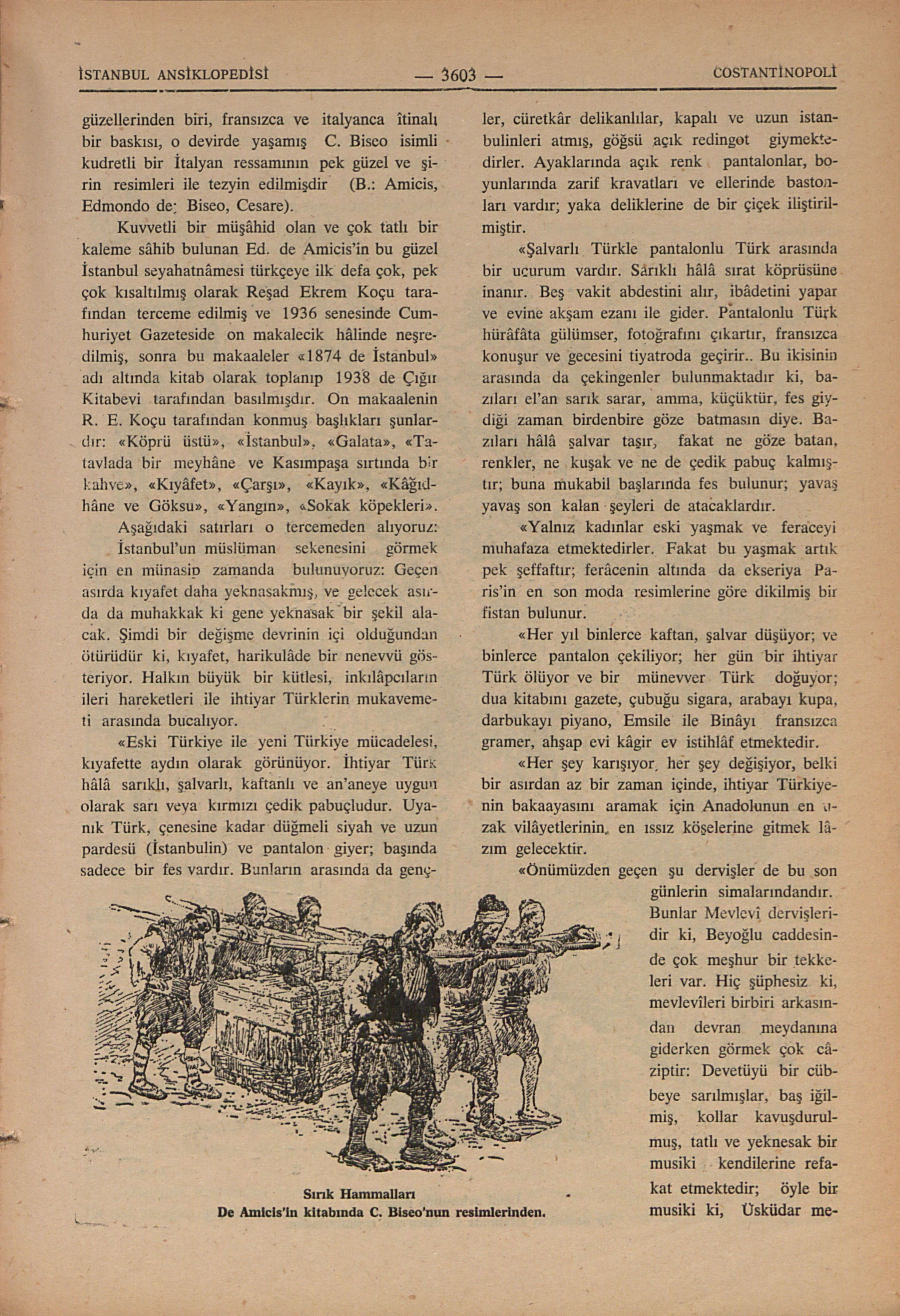 Ünlü İtalyan edîbi Edmondo de Amicis’in İstanbul üzerine seyahtanâmesi; asırlar boyunca İstanbul’a gelmiş Avrupalı seyyahların İstanbulu isimle zikrederek çeşidli dillerde kaleme aldıkları eserlerin güzellerinden biri, fransızca ve italyanca itinalı bir baskısı, o devirde yaşamış C. Bisco isimli kudretli bir İtalyan ressamının pek güzel ve şirin resimleri ile tezyin edilmişdir (B.: Amicis, Edmondo de; Biseo, Cesare).