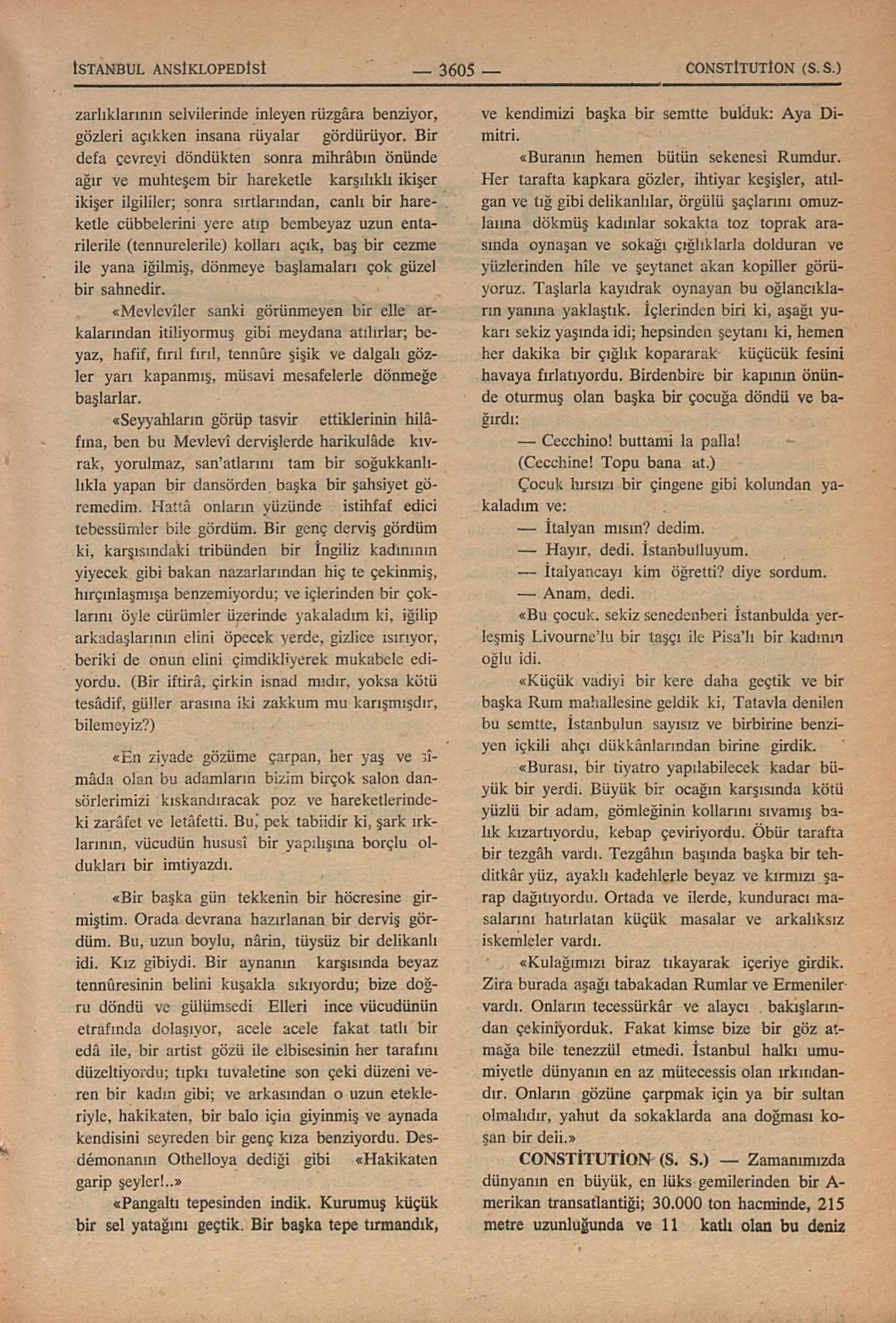 “Önümüzden geçen şu dervişler de bu son günlerin simalarındandır. Bunlar Mevlevî dervişleridir ki, Beyoğlu caddesinde çok meşhur bir tekkeleri var. Hiç şüphesiz ki, mevlevîleri birbiri arkasında devran meydanına giderken görmek çok câziptir; Devetüyü bir cübbeye sarılmışlar, baş iğilmiş, kollar kavuşdurulmuş, tatlı ve yeknesak bir musiki kendilerine refakat etmektedir; öyle bir musiki ki, Üsküdar mezarlıklarının selvilerinde inleyen rüzgâra benziyor, gözleri açıkken insana rüyalar gördürüyor. Bir defa çevreyi döndükten sonra mihrâbın önünde ağır ve muhteşem bir hareketle karşılıklı ikişer ikişer ilgililer; sonra sırtlarından, canlı bir hareketle cübbelerini yere atıp bembeyaz uzun entarilerile (tennurelerile) kolları açık, baş bir cezme ile yana iğilmiş, dönmeye başlamaları çok güzel bir sahnedir.