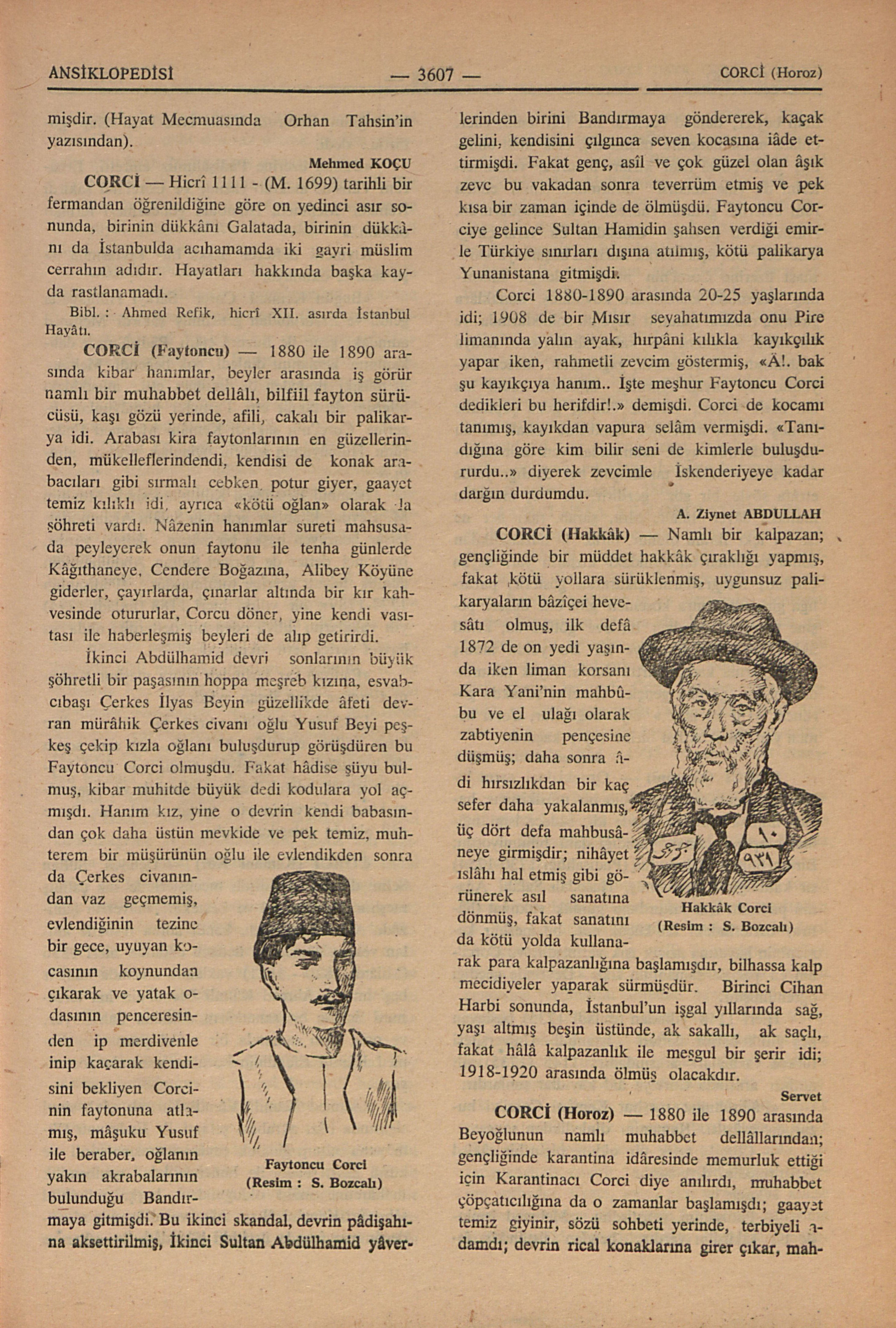 Namlı bir kalpazan; gençliğinde bir müddet hakkâk çıraklığı yapmış, fakat kötü yollara sürüklenmiş, uygunsuz palikaryaların bâzîçei hevesâtı olmuş, ilk defâ 1872 de on yedi yaşında iken liman korsanı Kara Yani’nin mahbûbu ve el ulağı olarak zabtiyenin pençesine düşmüş; daha sonra âdi hırsızlıkdan bir kaç sefer daha yakalanmış, üç dört defa mahbusâneye girmişdir; nihâyet ıslâhı hal etmiş gibi görünerek asıl sanatına dönmüş, fakat sanatını da kötü yolda kullanarak para kalpazanlığına başlamışdır, bilhassa kalp mecidiyeler yaparak sürmüşdür. Birinci Cihan Harbi sonunda, İstanbul’un işgal yıllarında sağ, yaşı altmış beşin üstünde, ak sakallı, ak saçlı, fakat hâlâ kalpazanlık ile meşgul bir şerir idi; 1918-1920 arasında ölmüş olacakdır. Servet Hakkâk Corci (Resim : S. Bozcalı)