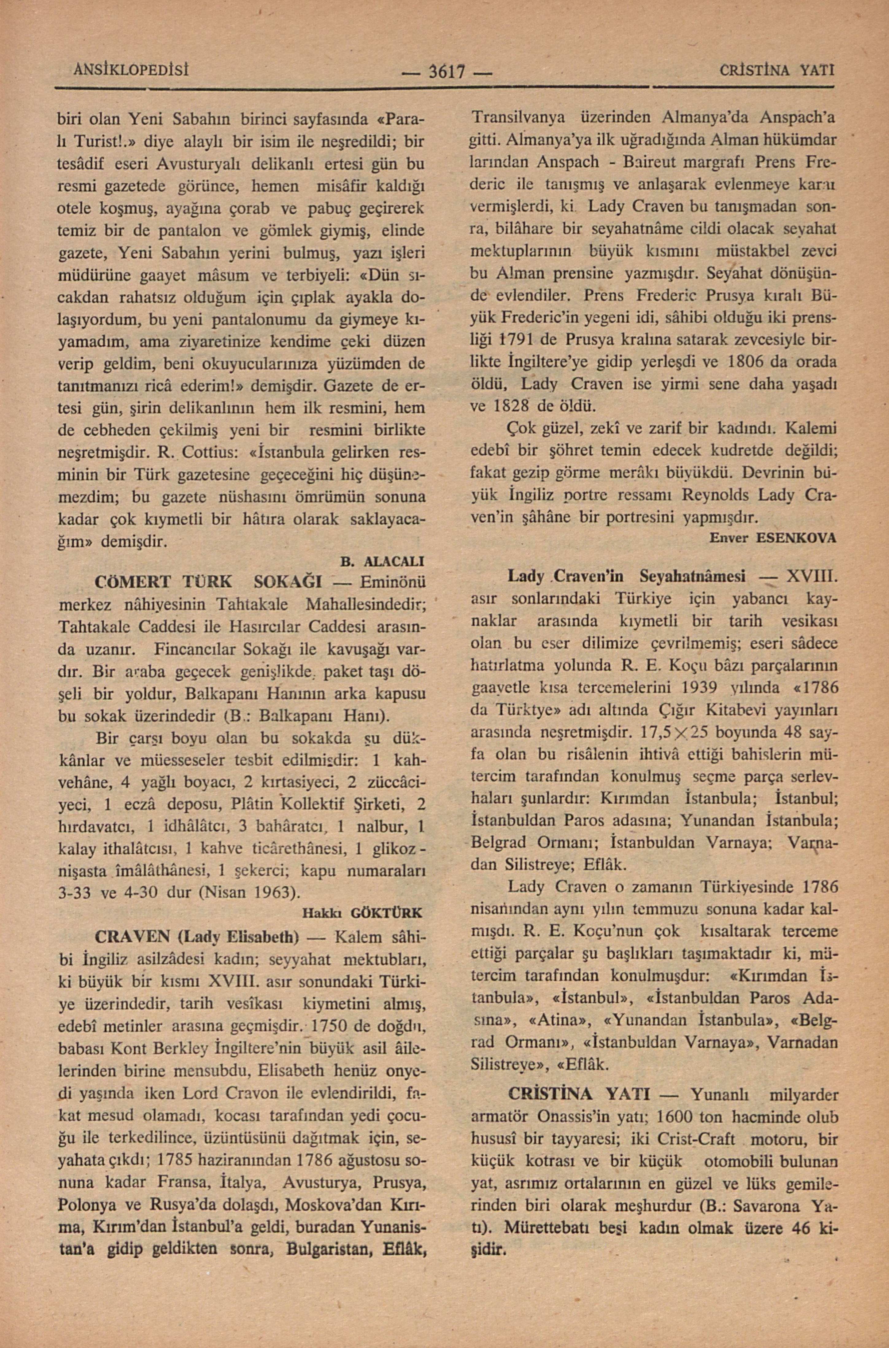 Kalem sâhibi İngiliz asilzâdesi kadın; seyyahat mektubları, ki büyük bir kısmı XVIII. asır sonundaki Türkiye üzerindedir, tarih vesîkası kıymetini almış, edebî metinler arasına geçmişdir. 1750 de doğdu, babası Kont Berkley İngiltere’nin büyük asil âilelerinden birine mensubdu, Elisabeth henüz onyedi yaşında iken Lord Cravon ile evlendirildi, fakat mesud olmadı, kocası tarafından yedi çocuğu ile terkedilince, üzüntüsünü dağıtmak için, seyahata çıkdı; 1785 haziranından 1786 ağustosu sonuna kadar Fransa, İtalya, Avusturya, Prusya, Polonya ve Rusya’da dolaşdı, Moskova’dan Kırıma, Kırım’dan İstanbul’a geldi, buradan Yunanistan’a gidip geldikten sonra, Bulgaristan, Eflâk, Transilvanya üzerinden Almanya’da Anspach’a gitti. Almanya’ya ilk uğradığında Alman hükümdarlarından Anspach - Baireut margrafı Prens Frederic ile tanışmış ve anlaşarak evlenmeye karar vermişlerdir, ki Landy Craven bu tanışmadan sonra, bilâhare bir seyahatnâme cildi olacak seyahat mektuplarının büyük kısmını müstakbel zevci bu Alman prensine yazmışdır. Seyahat dönüşünde evlendiler. Prens Frederic Prusya kıralı Büyük Frederic’in yegeni idi, sâhibi olduğu iki prensliği 1791 de Prusya kralına satarak zevcesiyle birlikte İngiltere’ye gidip yerleşdi ve 1806 da orada öldü, Lady Craven ise yirmi sene daha yaşadı ve 1828 de ö...