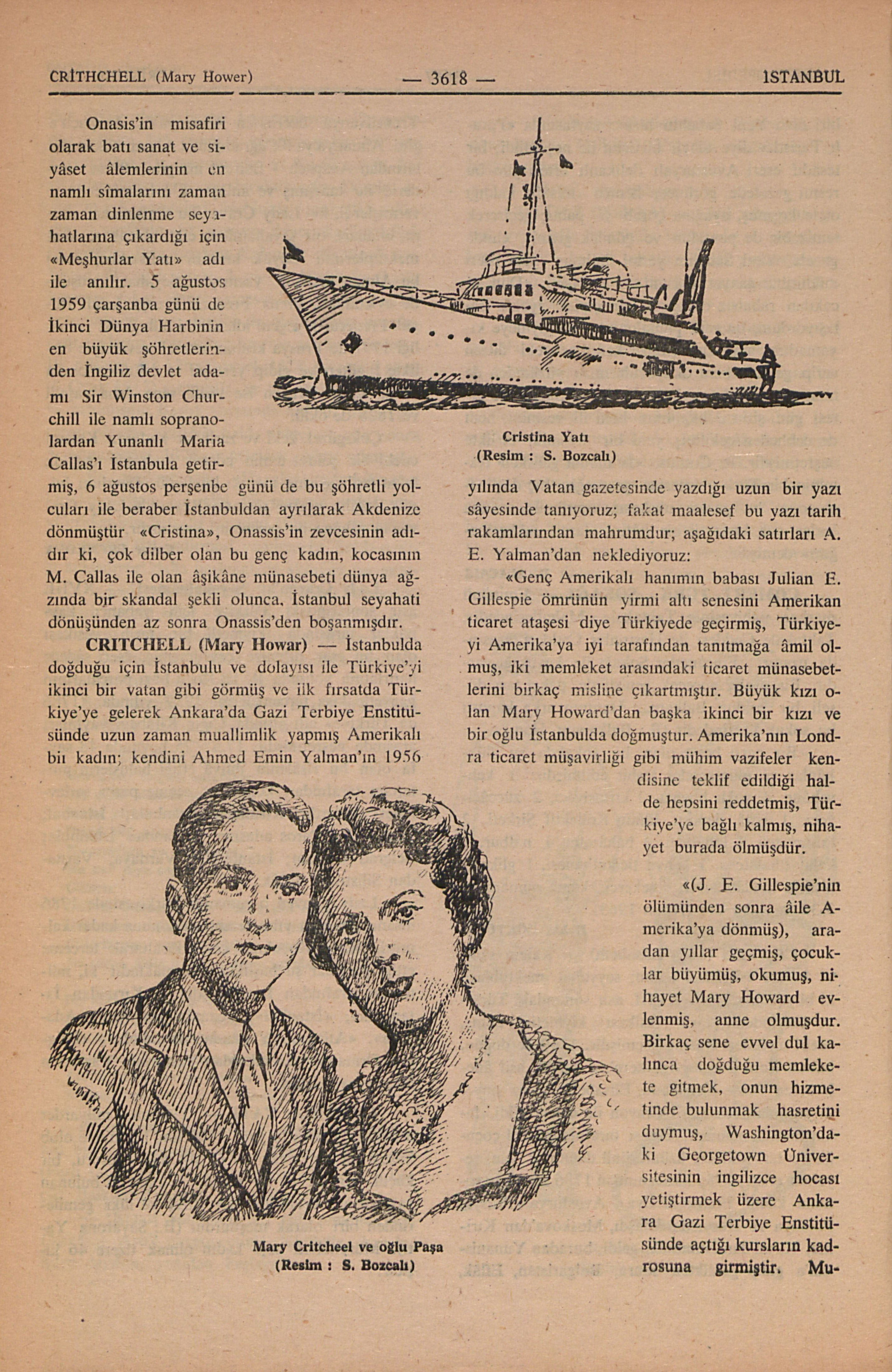 Onasis’in misafiri olarak batı sanat ve siyâset âlemlerinin en namlı sîmalarını zaman zaman dinlenme seyahatlarına çıkardığı için “Meşhurlar Yatı” adı ile anılır. 5 ağustos 1959 çarşanba günü de İkinci Dünya Harbinin en büyük şöhretlerinden İngiliz devlet adamı Sir Winston Churchill ile namlı sopranolardan Yunanlı Maria Callas’ı İstanbula getirmiş, 6 ağustos perşenbe günü de bu şöhretli yolcuları ile beraber İstanbuldan ayrılarak Akdenize dönmüştür “Cristina”, Onassis’in zevcesinin adıdır ki, çok dilber olan bu genç kadın, kocasının M. Callas ile olan âşikâne münasebeti dünya ağzında bir skandal şekli olunca, İstanbul seyahati dönüşünden az sonra Onassis’den boşanmışdır.