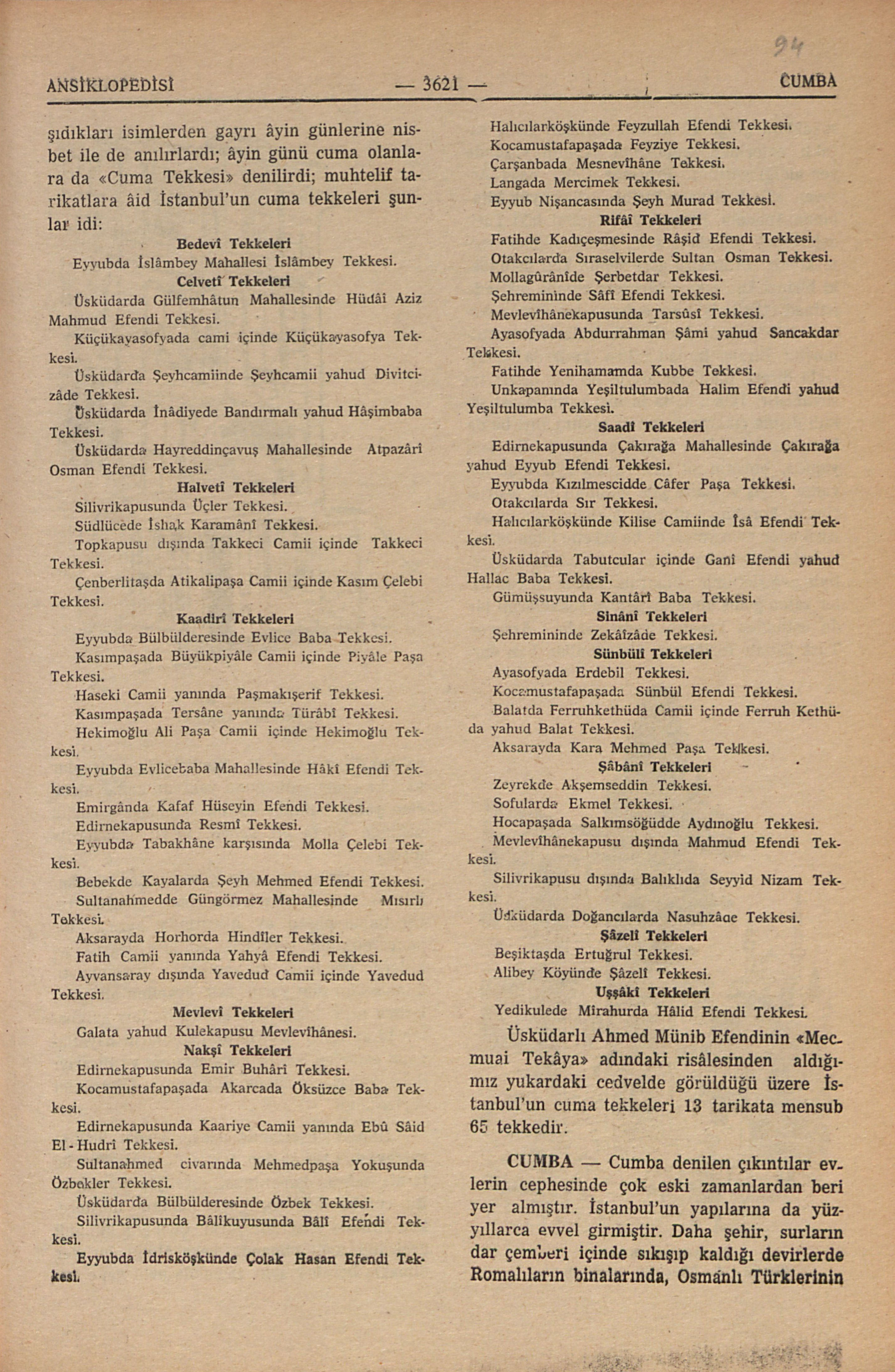 Üsküdarlı Ahmed Münip Efendinin “Mecmuai Tekâya” adındaki risâlesinden aldığımız yukardaki cedvelde görüldüğü üzere İstanbul’un cuma tekkeleri 13 tarikata mensup 65 tekkedir.
