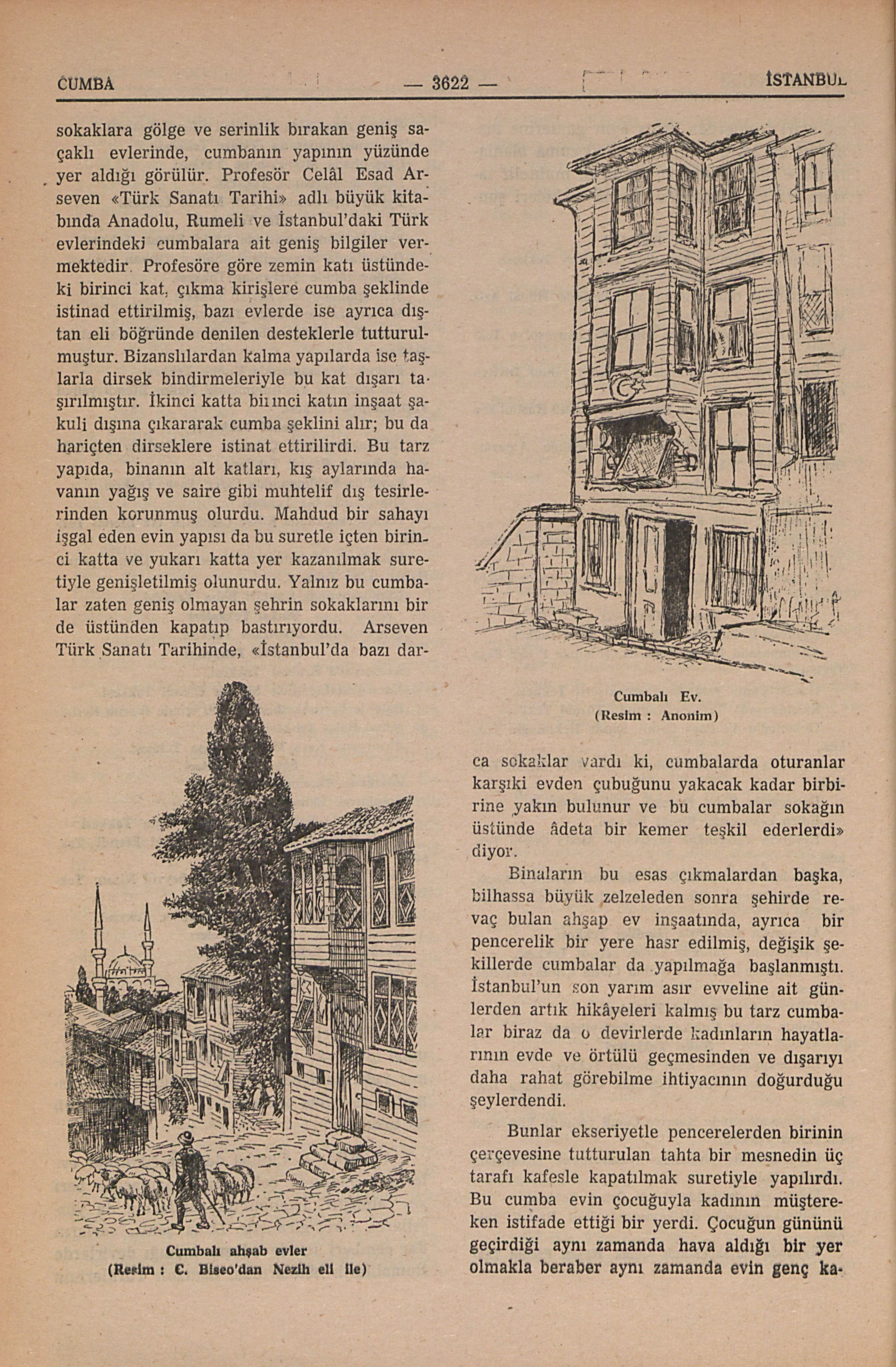 Cumba denilen çıkıntılar evlerin cephesinden çok eski zamanlardan beri yer almıştır. İstanbul’un yapılarına da yüzyıllarca evvel girmiştir. Daha şehir, surların dar çemberi içinde sıkışıp kaldığı devirlerde Romalıların binalarında, Osmanlı Türklerinin sokaklara gölge ve serinlik bırakan geniş saçaklı evlerinde, cumbanın yapının yüzünde yer aldığı görülür. Profesör Celâl Esad Arseven “Türk Sanatı Tarihi” adlı büyük kitabında Anadolu, Rumeli ve İstanbul’daki Türk evlerindeki cumbalara ait geniş bilgiler vermektedir. Profesöre göre zemin katı üstündeki birinci kat, çıkma kirişlere cumba şeklinde istinad ettirilmiş, bazı evlerde ise ayrıca dıştan eli böğründe denilen desteklerle tutturulmuştur. Bizanslılardan kalma yapılarda ise taşlarla dirsek bindirmeleriyle bu kat dışarı taşırılmıştır. İkinci katta birinci katın inşaat şakuli dışına çıkararak cumba şeklini alır; bu da hariçten dirseklere istinat ettirilirdi. Bu tarz yapıda, binanın alt katları, kış aylarında havanın yağış ve saire gibi muhtelif dış tesirlerinden korunmuş olurdu. Mahdud bir sahayı işgal eden evin yapısı da bu suretle içten birinci katta ve yukarı katta yer kazanılmak suretiyle genişletilmiş olunurdu. Yalnız bu cumbalar zaten geniş olmayan şehrin sokaklarını bir de üstünden kapatıp bastırıyordu. Arseven Türk Sanatı ...