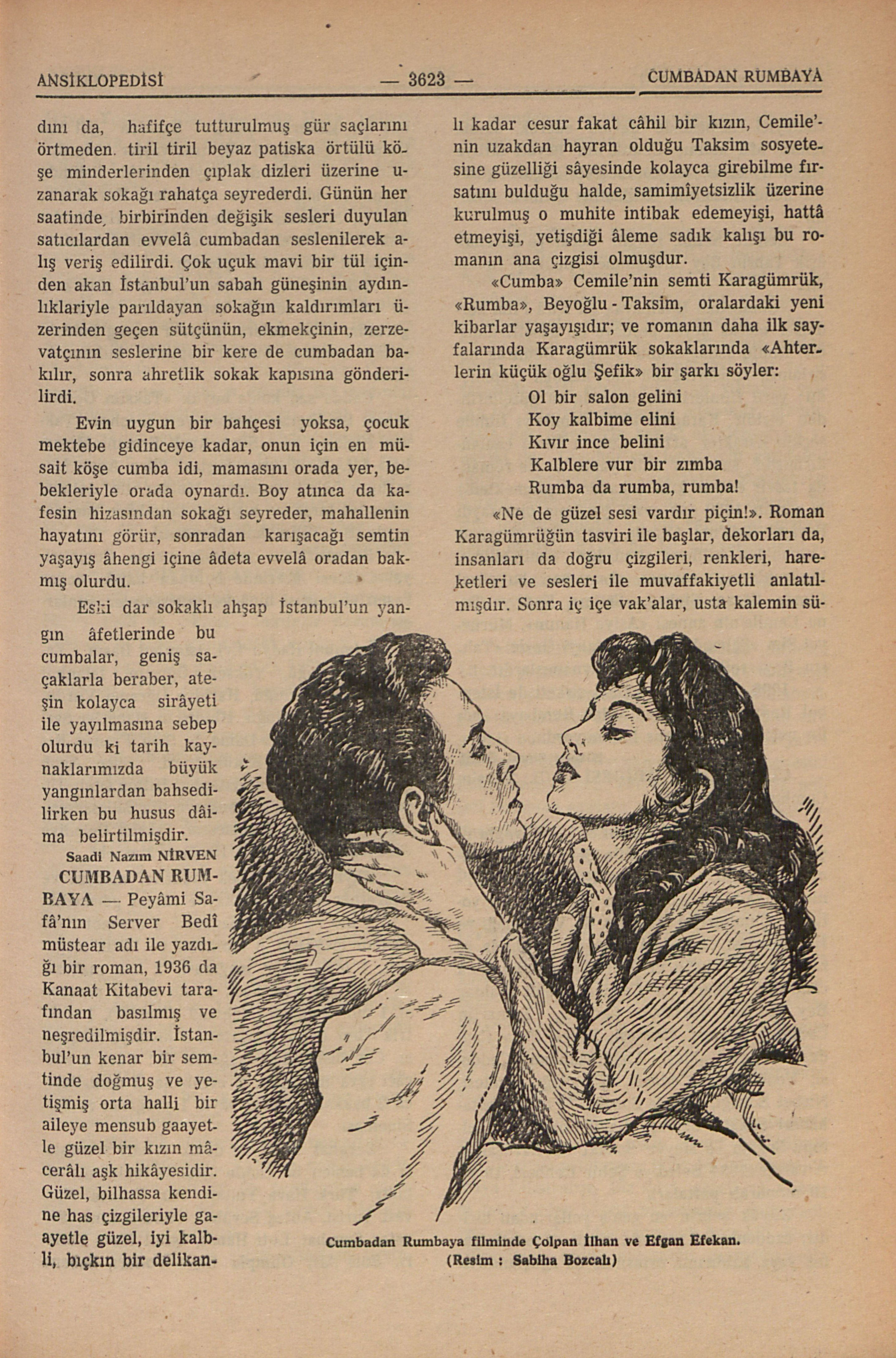 Bunlar ekseriyetle pencerelerden birinin çerçevesine tutturulan tahta bir mesnedin üç tarafı kafesle kapatılmak suretiyle yapılırdı. Bu cumba evin çocuğuyla kadının müştereken istifade ettiği bir yerdi. Çocuğun gününü geçirdiği aynı zamanda hava aldığı bir yer olmakla beraber aynı zamanda evin genç kadını da, hafifçe tutturulmuş gür saçlarını örtmeden tiril tiril beyaz patiska örtülü köşe minderlerinden çıplak dizleri üzerine uzanarak sokağı rahatça seyrederdi. Günün her saatinde, birbirinden değişik sesleri duyulan satıcılardan evvelâ cumbadan seslenilerek alış veriş edilirdi. Çok uçuk mavi bir tül içinden akan İstanbul’un sabah güneşinin aydınlıklariyle parıldayan sokağın kaldırımları üzerinden geçen sütçünün, ekmekçinin, zerzevatçının seslerine bir kere de cumbadan bakılır, sonra ahretlik sokak kapısına gönderilirdi.