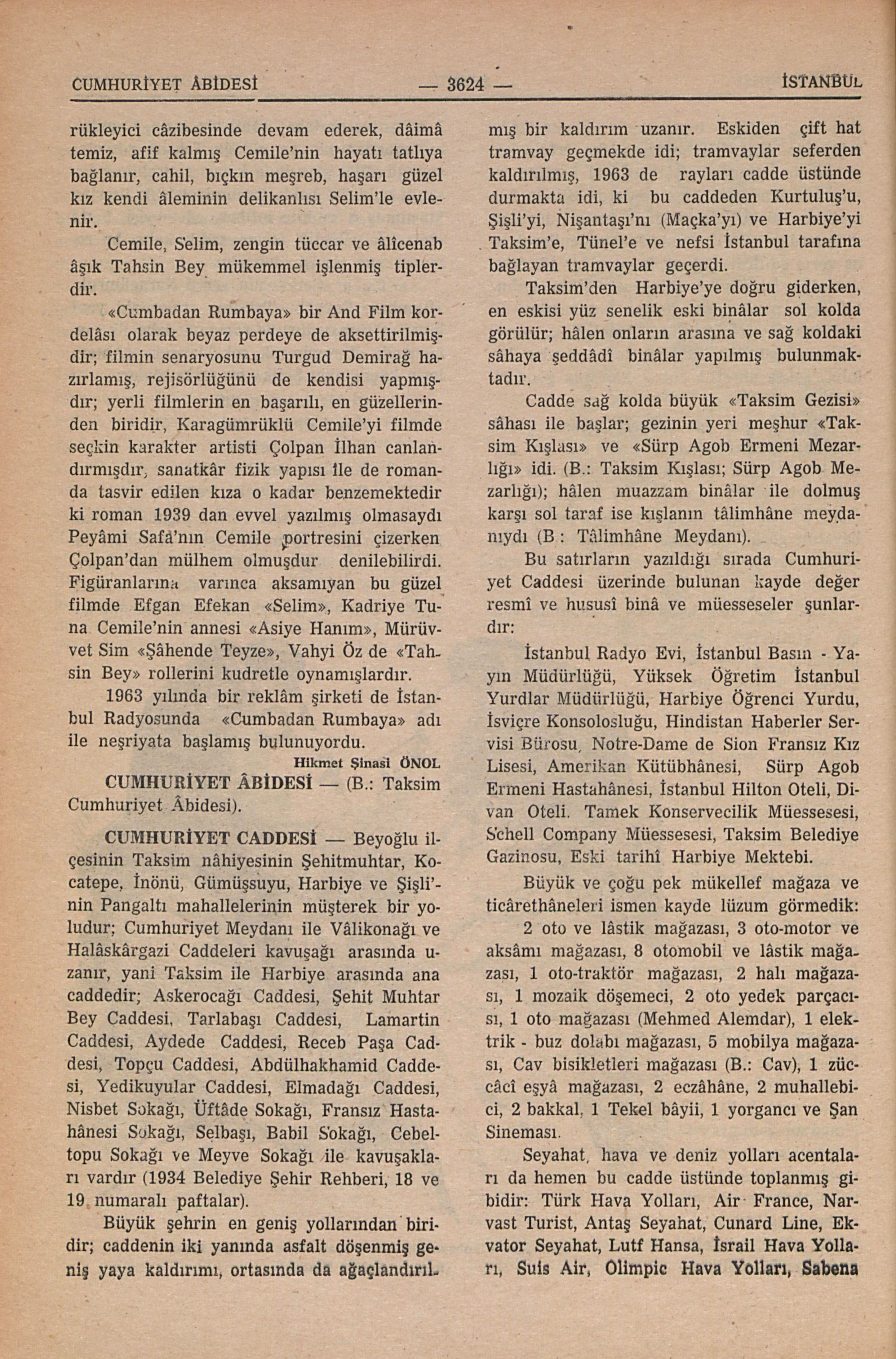 Taksim’den Harbiye’ye doğru giderken, en eskisi yüz senelik eski binâlar sol kolda görülür; hâlen onların arasına ve sağ koldaki sâhaya şeddâdî binalar yapılmış bulunmaktadır.