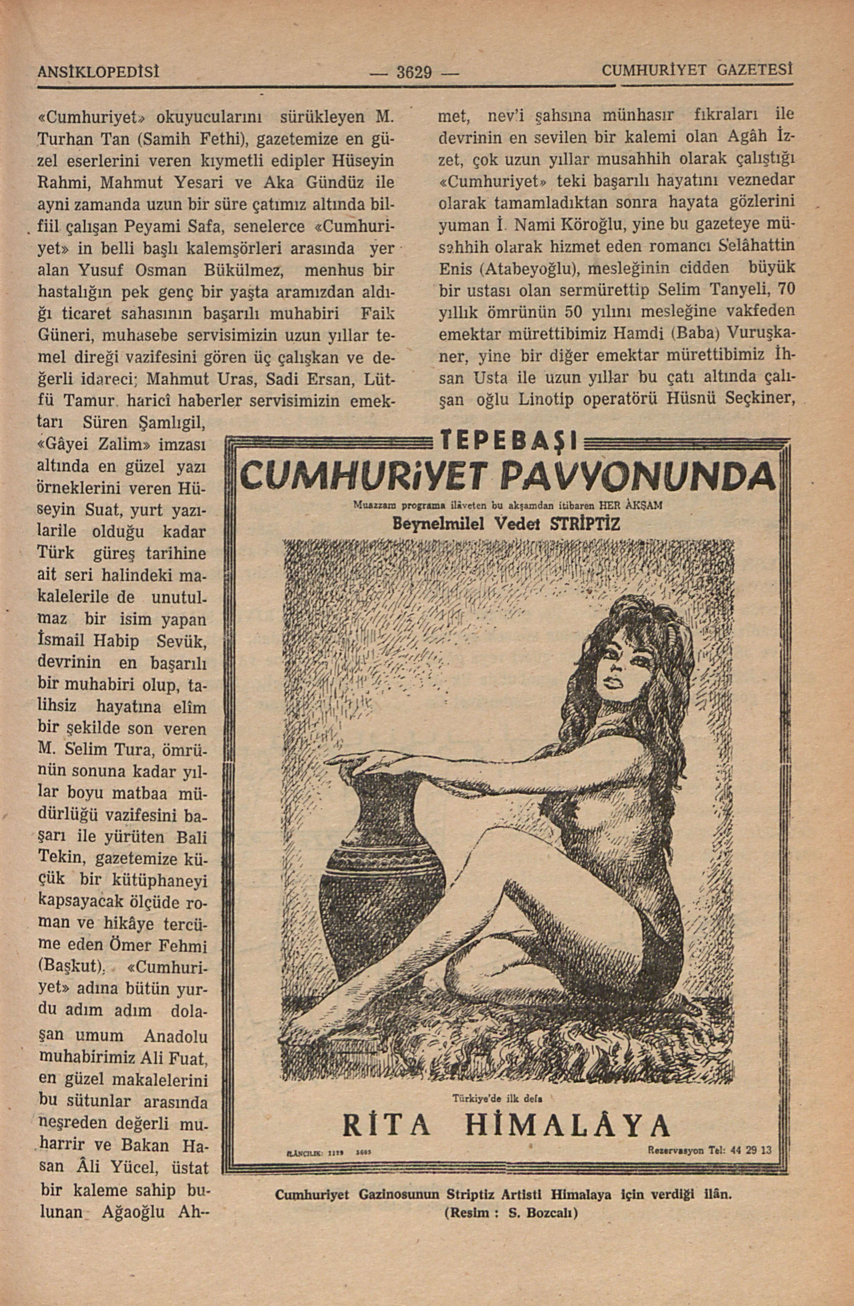 Cumhuriyet Gazinosunun Striptiz Artisti Himalaya için verdiği ilân.