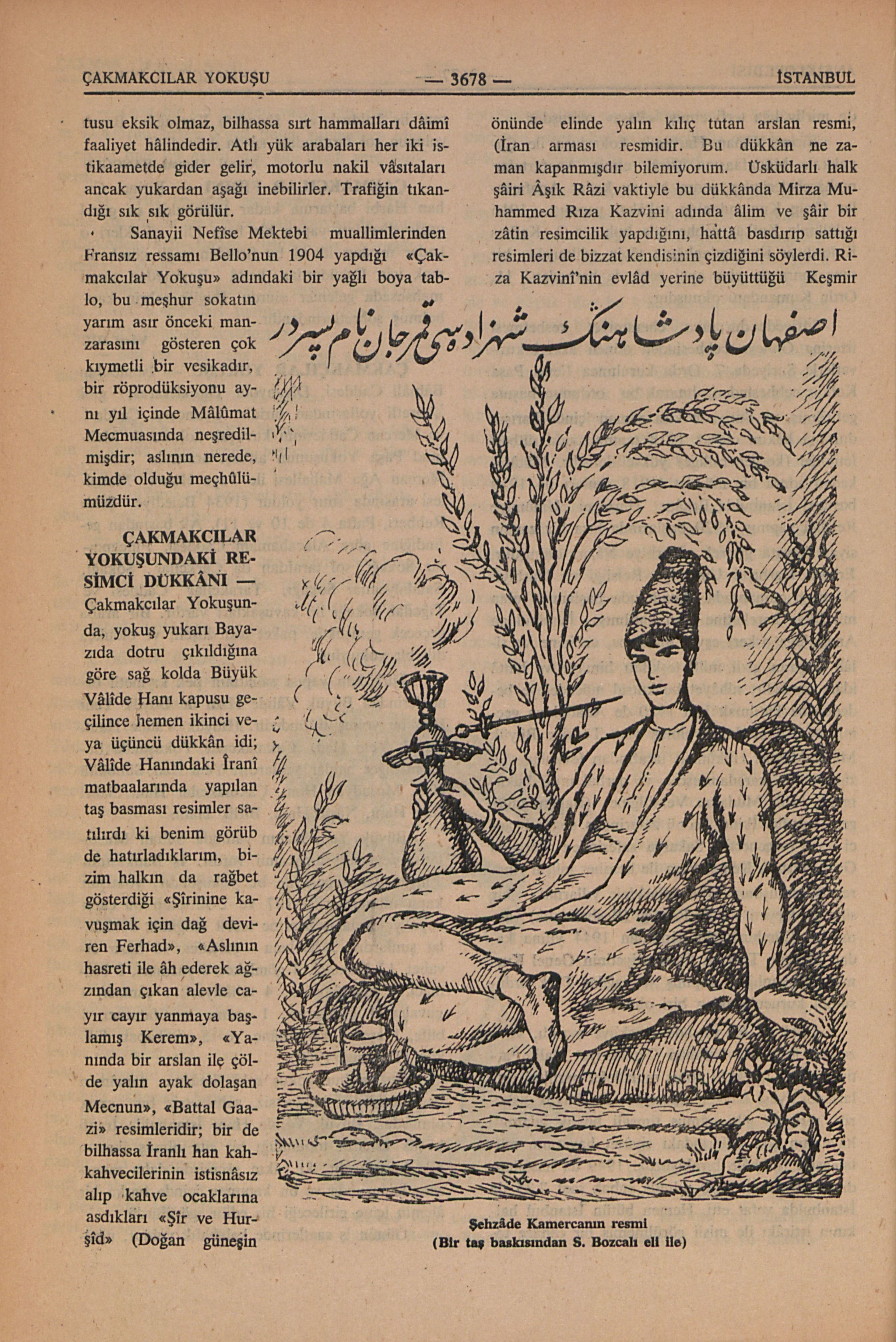 Çakmakcılar Yokuşunda, yokuş yukarı Bayazıda doğru çıkıldığına göre sağ kolda Büyük Vâlîde anı kapusu geçilince hemen ikinci veya üçüncü dükkân idi; Vâlîde Hanındaki Îranî matbaalarında yapılan taş basması resimler satılırdı ki benim görüb de hatırladıklarım, bizim halkın da rağbet gösterdiği “Şîrinine kavuşmak için dağ deviren Ferhad”, “Aslının hasreti ile âh ederek ağzından çıkan alevle cayır cayır yanmaya başlamış Kerem”, “Yanında bir arslan ile çölde yalın ayak dolaşan Mecnun”, “Battal Gaazi” resimleridir; bir de bilhassa İranlı han kahkahvecilerinin istisnâsız alıp kahve ocaklarına asdıkları “Şîr ve Hurşîd” (Doğan güneşin önünde elinde yalın kılıç tutan arslan resmi, (İran arması resmidir. Bu dükkân ne zaman kapanmışdır bilemiyorum. Üsküdarlı halk şâiri Âşık Râzi vaktiyle bu dükkânda Mirza Muhammed Rıza Kazvini adında âlim ve şâir bir zâtin resimcilik yapdığını, hattâ basdırıp sattığı resimleri de bizzat kendisinin çizdiğini söylerdi. Riza Kazvinî’nin evlâd yerine büyüttüğü Keşmir Ali adında mahbub bir çırağı varmış, nargile içen bir nevcivanı gösterir meşhur bir İran minyatürünü kopye ederek, ve gencin yalnız yüzünü değiştirip o mechul sîmâ yerine kendi Keşmiş Alisinin yüzünü resmedip bastırmış, ve o zamana göre büyük paradır, tânesi bir lira çeyreğine “Isfahan Pâdişahının Şehzâdesi Kamercan nâm püserdir” diye satarmış. O devirde İstanbulda Şehzâde Kamercanın resimini alıp duvarına asmadık tulumbacı kahvehânesi kalmamışdır. Bu fakir dahi her sene ramazanlarda çalgılı kahve yapardım. Riza Karvininin Çakmakcılardaki dükkânının devrettiği Aka Ali adındaki resimciden, bin minnet ve recâ ile dükkân köşesinde kalmış bir Kamercan resmi bulmuşdum; onu yaldıılı bir çerçiveye geçirip çalgıcılara ayırdığım yerin duvarına her seferinde muhakka asardım, pek beğenilirdi. Keşmir Ali için Âşık Râzinin bir manzûmesi vardır ki şudur: San’atı o şûhin olmuş basmacı Cümle çarşılının odur baş tacı Çakmakcılar içre tasvir dükkânı Hâcegânı İran hep bendegânı Hüsnüne fermanı yazmış kâkülü Şöhreti ol şûhin Kamercan gülü Fârisî tekellüm eyler ol dilbaz Serinde papağı keşmirî şehbaz Ol civanım nâmı hem Keşmir Ali Acem mahbûbudur, gözler sürmeli Ustası ahond ol civana tutsak Kav misâli yanmış mahbûbu çakmak Yüz sürer günde bin gez ayağına Fitîli aşkı kor yürek yağına Âşık kadrin bilir mahbûbu reşid Olmuşlar tasvîri “Şir ile Hurşid” Çakmakcılardaki resimci dükkânının son sâhibi Aka Ali zan ederim ki İstanbulda ilk posta pulu koleksiyoncularından biridir; Vâlîde Hanında bir odada otururdu; onun da mahbub yine Îrâni bir hizmetkâr çırağı vardı. Adamın kıyâfeti gözümün önünden gitmez. Başında siyah İran papağı, sırtında yakaları yağlı nefti bir redingot, yalın ayak, ayağında takunya, han ile dükkân arasında uzun boyu ile öyle vakuurâne bir geçişi vardı ki görübde kim olduğunu bilmeyen muhakkak durub bakar, başında ayak bileğine kadar herif sanki vezir idi, esnaflığı yalın ayağı ile takunyasında idi. Dükkânda da, müşteri gelmediği zaman çırağı ile karşılıklı oturur, yığın yığın posta pulları ile saatlerce meşgul olurdu. Çakmakcılar Yokuşundan ne zaman geçsem bu hâtıralar gözümün önünde canların ve gözlerim yaşarır. Vâsıf HİÇ Şehzâde Kamercanın resmi (Bir taş baskısından S. Bozcalı eli ile)