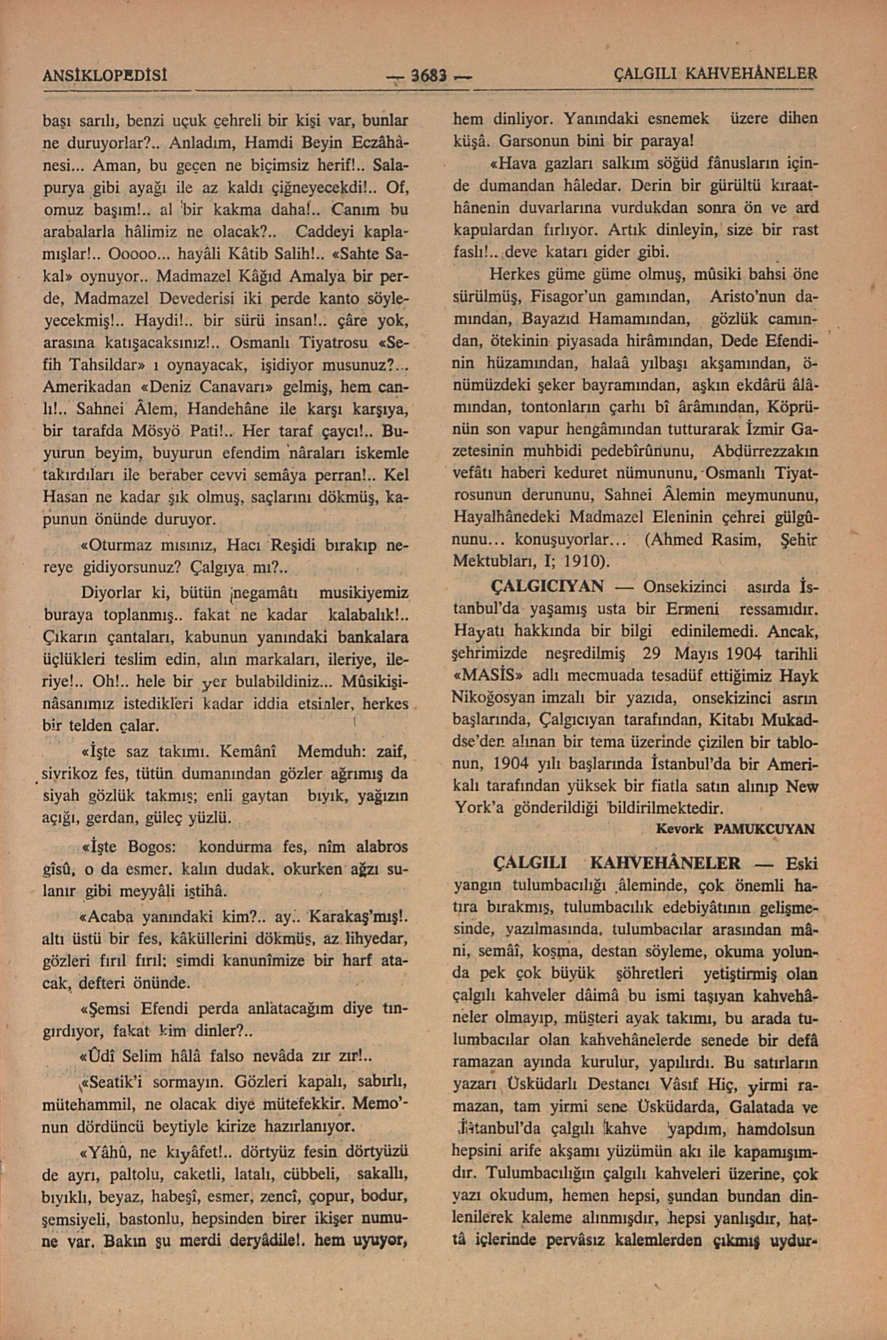 gibi söylene söylene bayatlayıp çürümüş mani ve koşmalarla benlik iddiasında bulunanlar, taklid yollu düzdükleri mânasız şeylerle kendilerini dev aynasında görerek bir gürültü, hır çıkarmağa yeltenirlerdi. Gerçi yapmak istedikleri yolsuzluklar kendilerine pahalıya mal olur, fakat nice emeklerle ve fedakârlıklar kurulan çalgılı kahvehânede, henüz masrafının dörtte birini bile çıkarmadan zabıtaca kapatılır, müessisi cezaya çarptırılırdı.