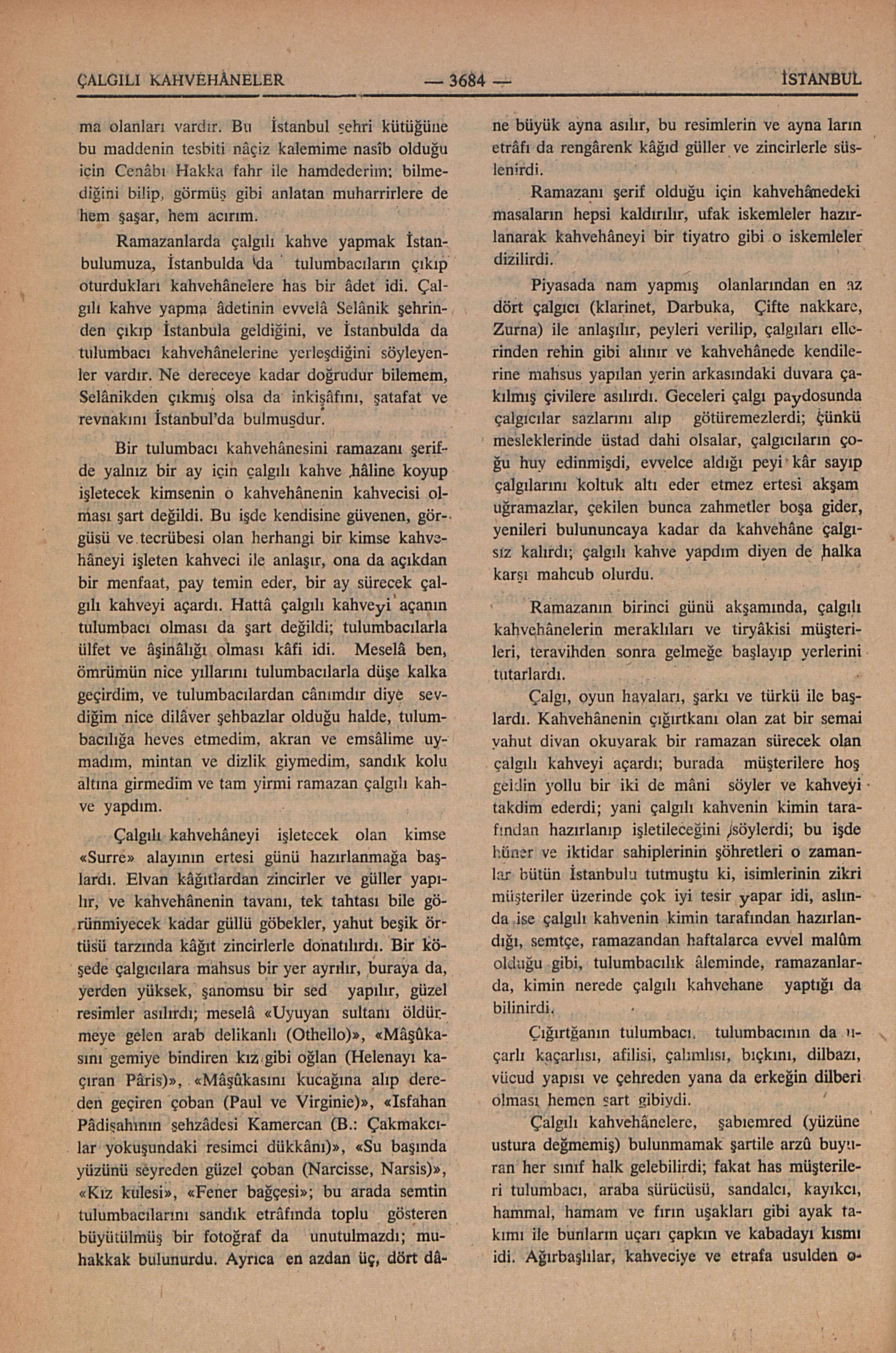 Ramazanlarda çalgılı kahve yapmak İstanbulumuzda, İstanbulda da tulumbacıların çıkıp otordukları kahvehânelere has bir âdet idi. Çalgılı kahve yapma âdetinin evvelâ Selânik şehrinden çıkıp İstanbula geldiğini, ve İstanbulda da tulumbacı kahvehânelerine yerleşdiğini söyleyenler vardır. Ne dereceye ...