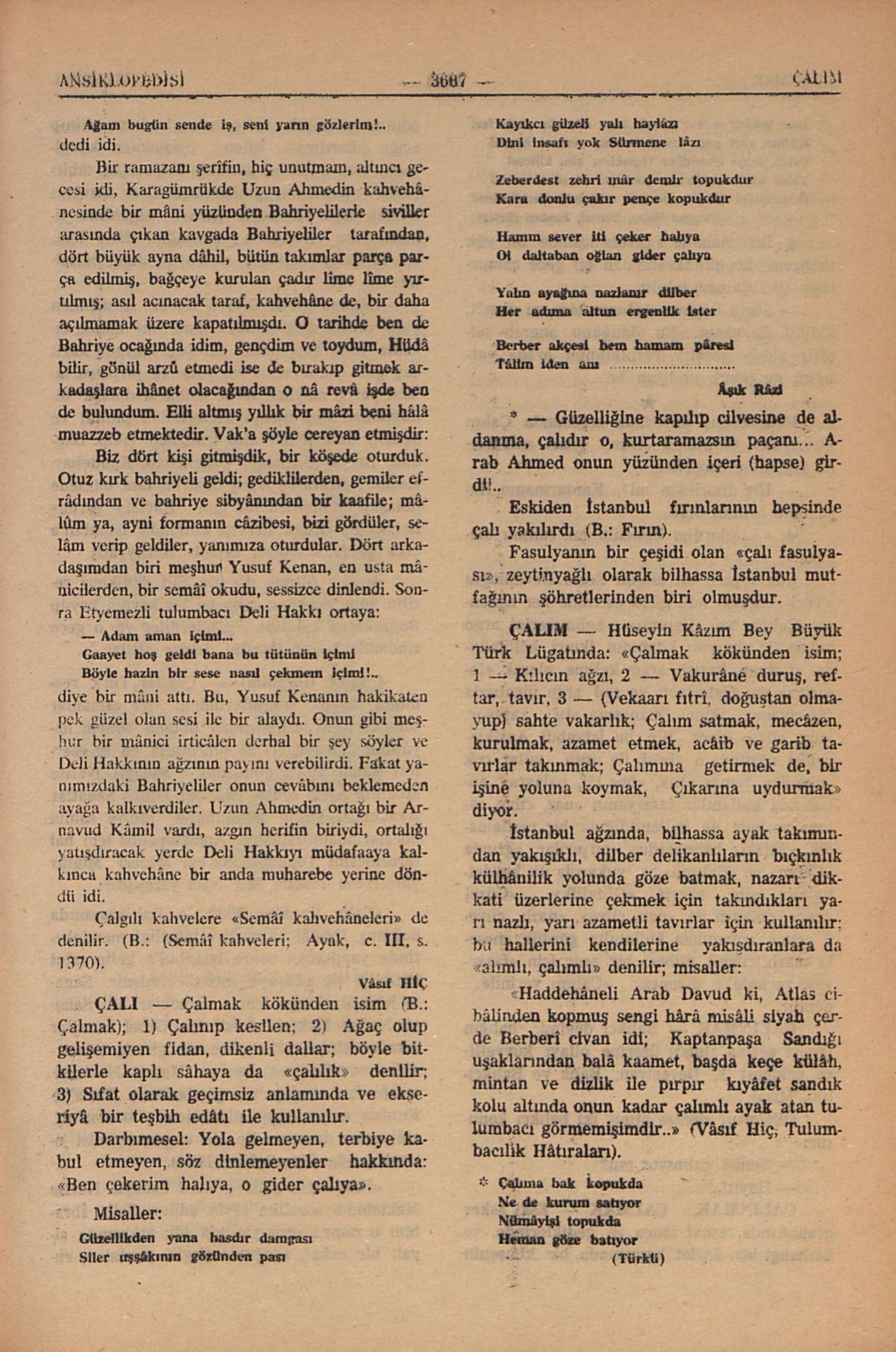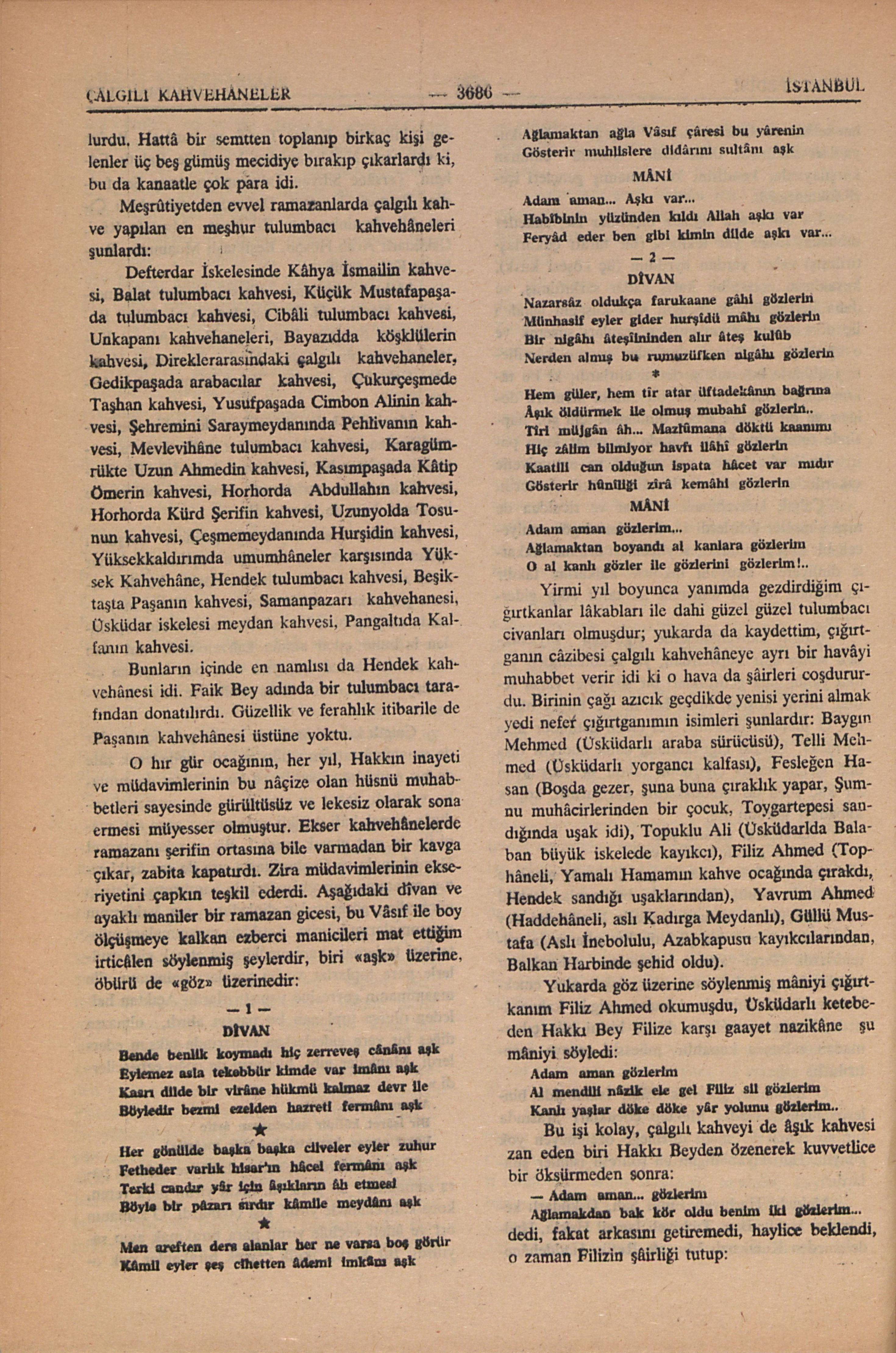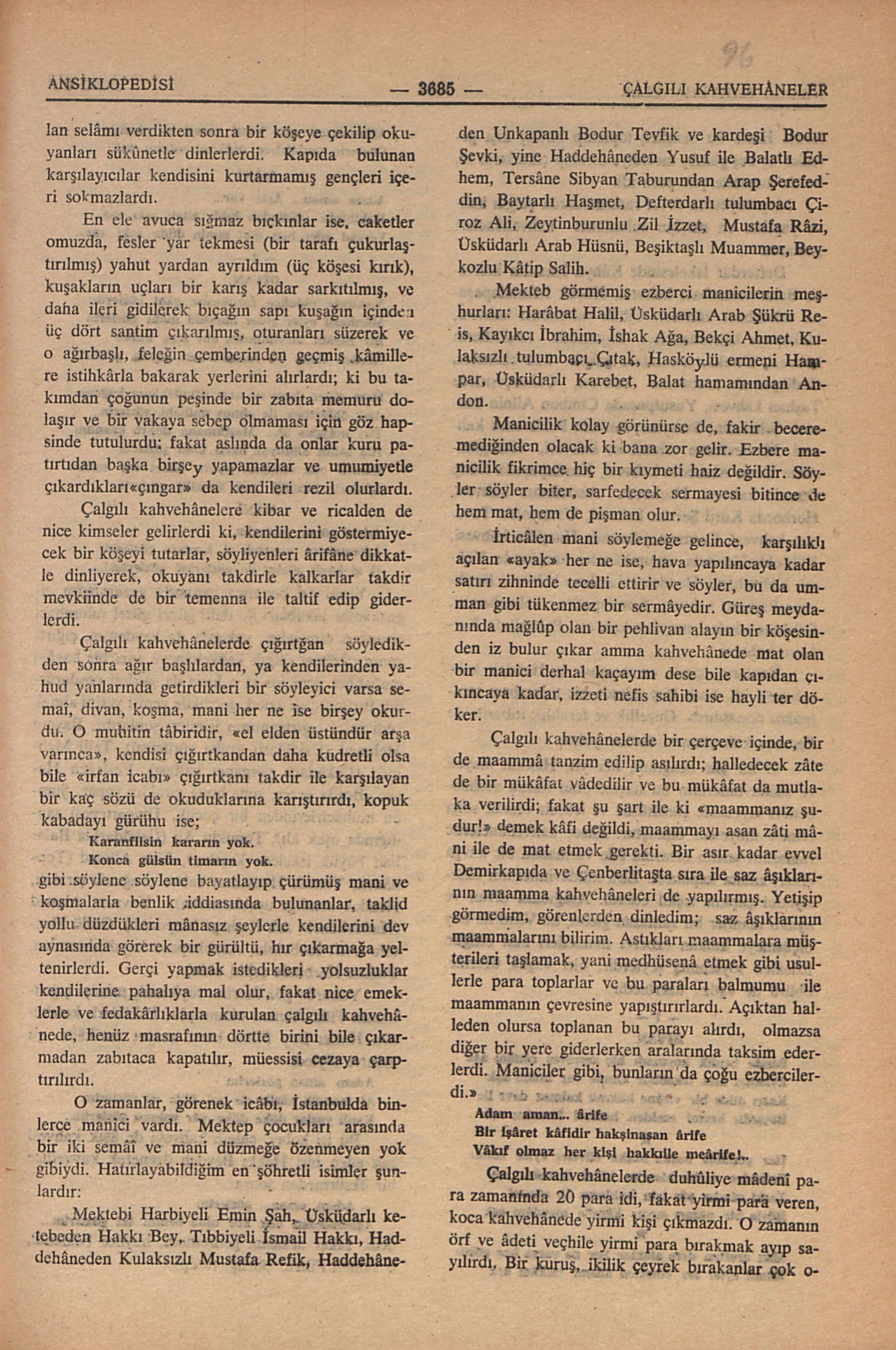 diye bir mâni attı. Bu, Yusuf Kenanın hakikaten pek güzel olan sesi ile bir alaydı. Onun gibi meşhur bir mânici irticâlen derhal bir şeyler söyler ve Deli Hakkının ağzının payını verebilirdi. Fakat yanımızdaki Bahriyeliler onun cevâbını beklemeden ayağa kalkıverdiler. Uzun Ahmedin ortağı bir Arnavud Kâmil vardı, azgın herifin biriydi, ortalığı yatışdıracak yerde Deli Hakkıyı müdafaaya kalkınca kahvehâne bir anda muharebe yerine döndü idi.
