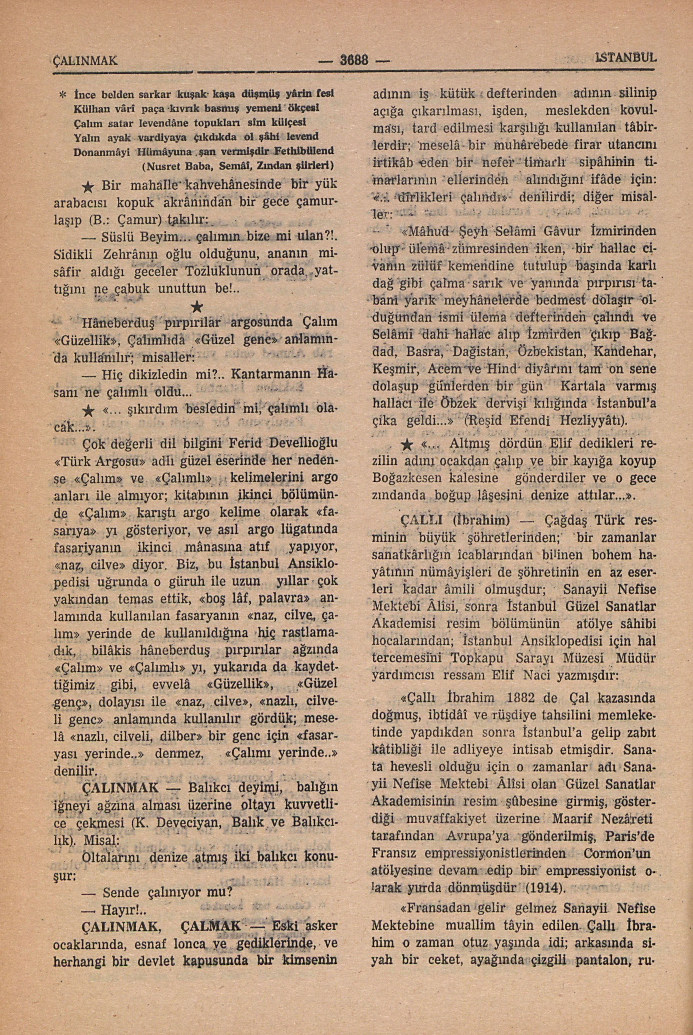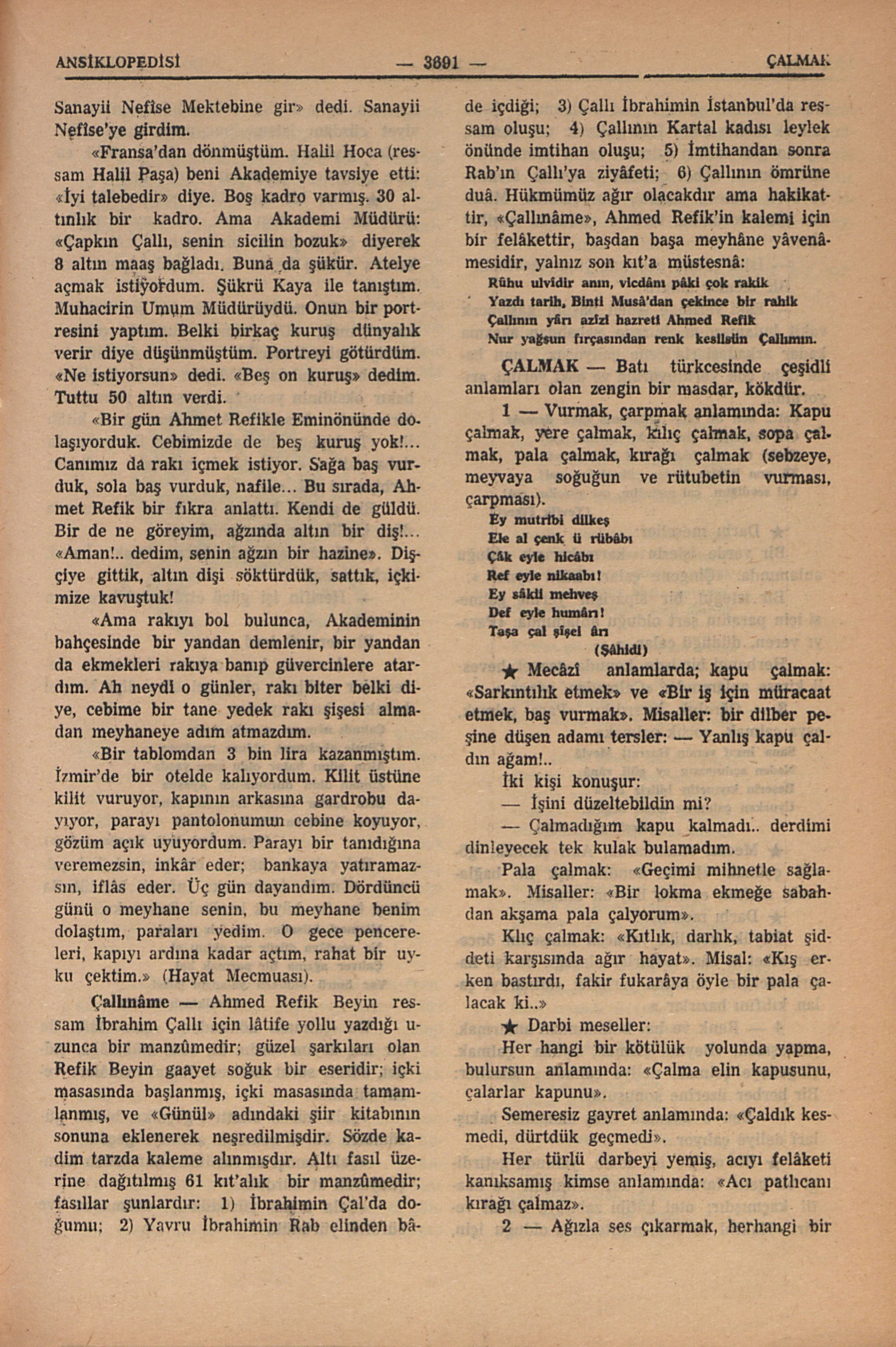 Çallınâme — Ahmed Refik Beyin ressam İbrahim Çallı için lâtife yollu yazdığı uzunca bir manzûmedir; güzel şarkıları olan Refik Beyin gaayet soğuk bir eseridir; içki masasında başlanmış, içki masasında tamamlanmış, ve “Günül” adındaki şiir kitabının sonuna eklenerek neşredilmişdir. Sözde kadim tarzda kaleme alınmışdır. Alta fasıl üzerine dağıtılmış 61 kıt’alık bir manzûmedir; fasıllar şunlardır: 1) İbrahim Çal’da doğumu; 2) Yavru İbrahimin elinden bâde içdiği; 2) Çallı İbrahimin İstanbul’da ressam oluşu; 4) Çallının Kartal kadısı leylek önünde imtihan oluşu; 5) İmtihandan sonra Rab’ın Çallı’ya ziyâfeti; 6) Çalının ömrüne duâ. Hükmümüz ağır olacakdır ama hakikattir, “Çallınâme”, Ahmedt Refik’in kalemi için bir felâkettir, başda başa meyhâne yâvenâmesidir, yalnız son kıt’a müstesnâ: