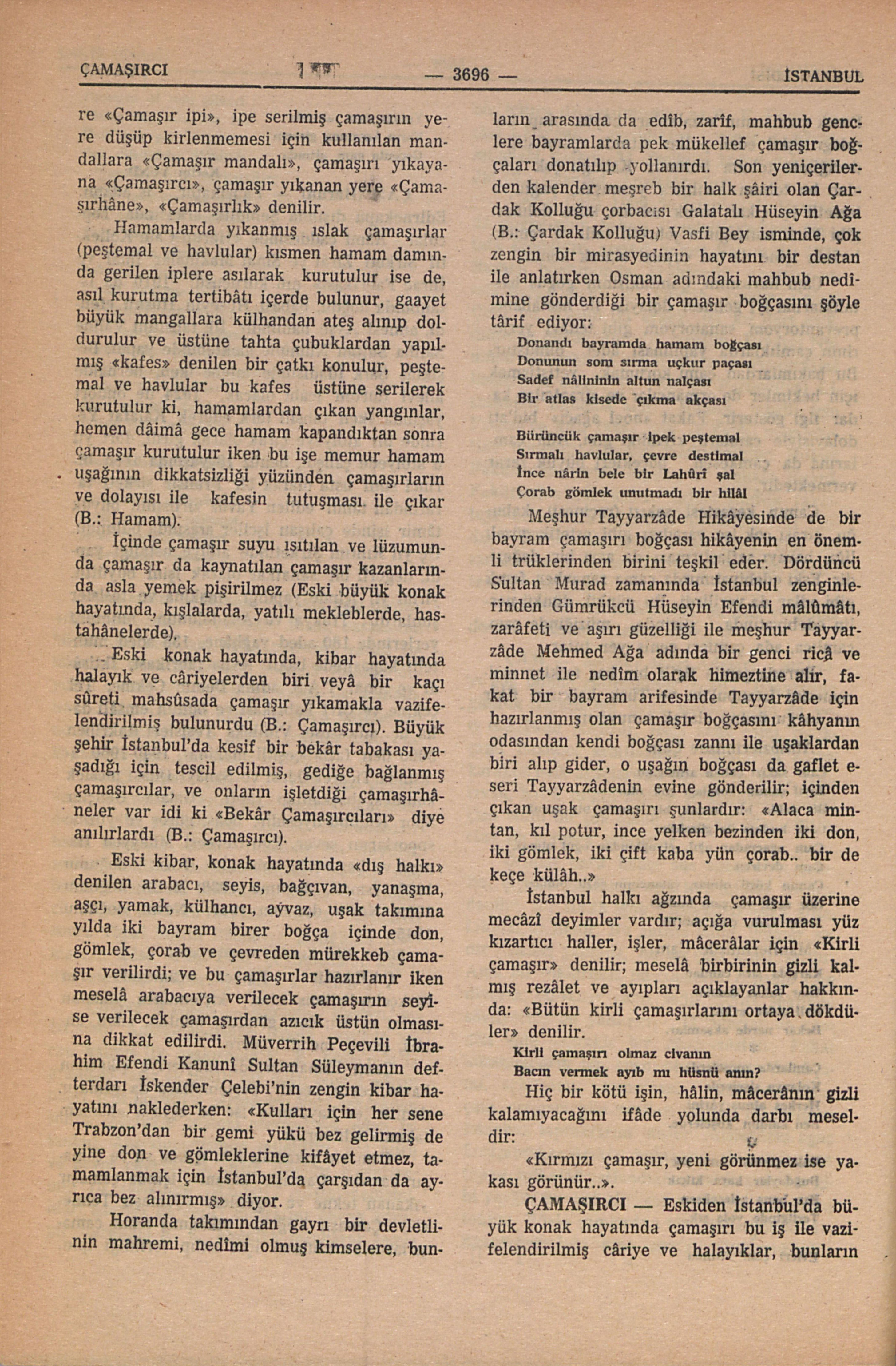 Eski konak hayatında, kibar hayatında halayık ve câriyelerden biri veyâ bir kaçı sûreti mahsûsada çamaşır yıkamakla vazifelendirilmiş bulunurdu (B.: Çamaşırcı). Büyük şehir İstanbul’da kesif bir bekâr tabakası yaşadığı için tescil edilmiş, gediğe bağlanmış çamaşırcılar, ve onların işletdiği çamaşırhâneler var idi ki “Bekâr Çamaşırcıları” diye anılırlardı (B.: Çamaşırcı).