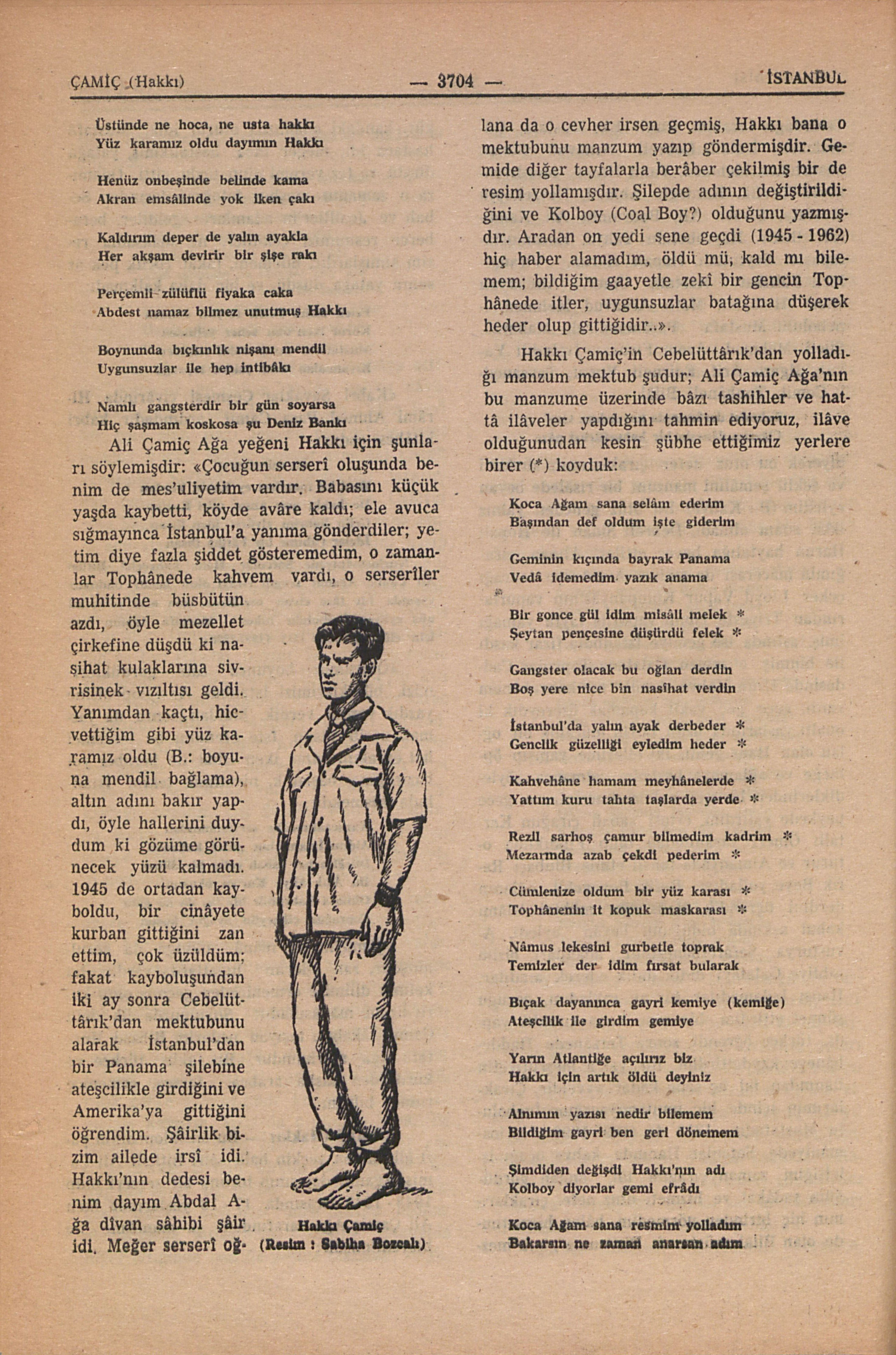 Ali Çamiç Ağa yeğeni Hakkı için şunları söylemişdir: “Çocuğun serserî oluşunda benim de mes’uliyetim vardır. Babasını küçük yaşda kaybetti, köyde avâre kaldı; ele avuca sığmayınca İstanbul’a yanıma gönderdiler; yetim diye fazla şiddet gösteremedim, o zamanlar Tophânede kahvem vardı, o serserîler muhitinde büsbütün azdı, öyle mezellet çirkefine düşdü ki nasihat kulaklarına sivrisinek vızıltısı geldi. Yanımdan kaçtı, hicvettiğim gibi yüz karamız oldu (B.: boyuna mendil bağlama), altın adını bakır yapdı, öyle hallerini duydum ki gözüme görünecek yüzü kalmadı. 1945 de ortadan kayboldu, bir cinâyete kurban gittiğini zan ettim, çok üzüldüm; fakat kayboluşundan iki ay sonra Cebelüttârık’dan mektubunu alarak İstanbul’dan bir Panama şilebine ateşcilikle girdiğini ve Amerika’ya gittiğini öğrendim. Şâirlik bizim ailede irşî idi. Hakkı’nın dedesi benim dayım Abdal Ağa dîvan sâhibi şâir idi. Meğer serserî oğlana da o cevher irsen geçmiş. Hakkı bana mektubunu manzum yazıp göndermişdir. Gemide diğer tayfalarla berâber çekilmiş bir de resim yollamışdır. Şilepde adının değiştirildiğini ve Kolboy (Coal Boy?) olduğunu yazmışdır. Aradan on yedi sene geçdi (1945 - 1962) hiç haber alamadım, öldü mü, kaldı mı bilemem; bildiğim gaayetle zekî bir gencin Tophânede itler, uygunsuzlar batağına düşerek heder olup gittiğidir..”.