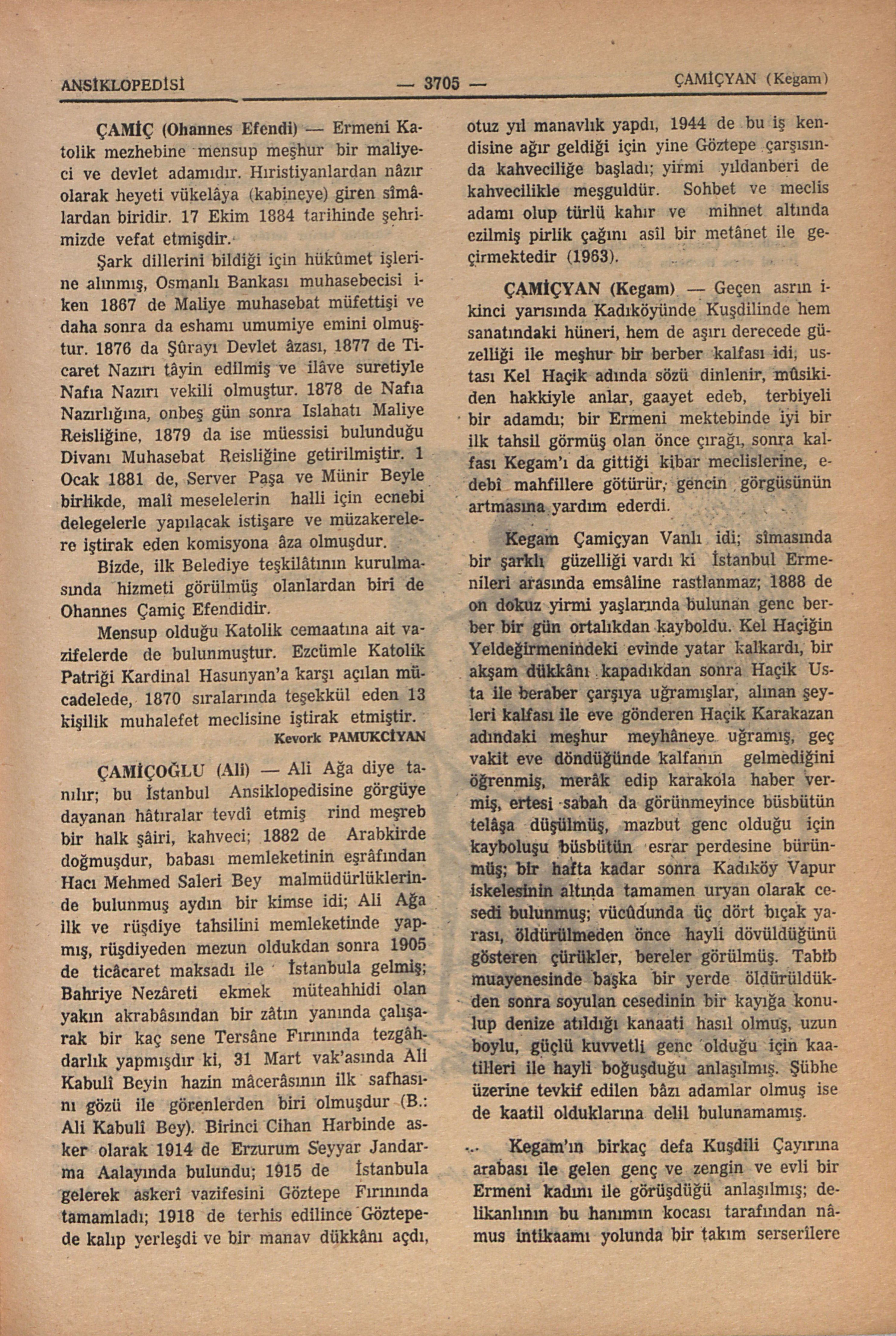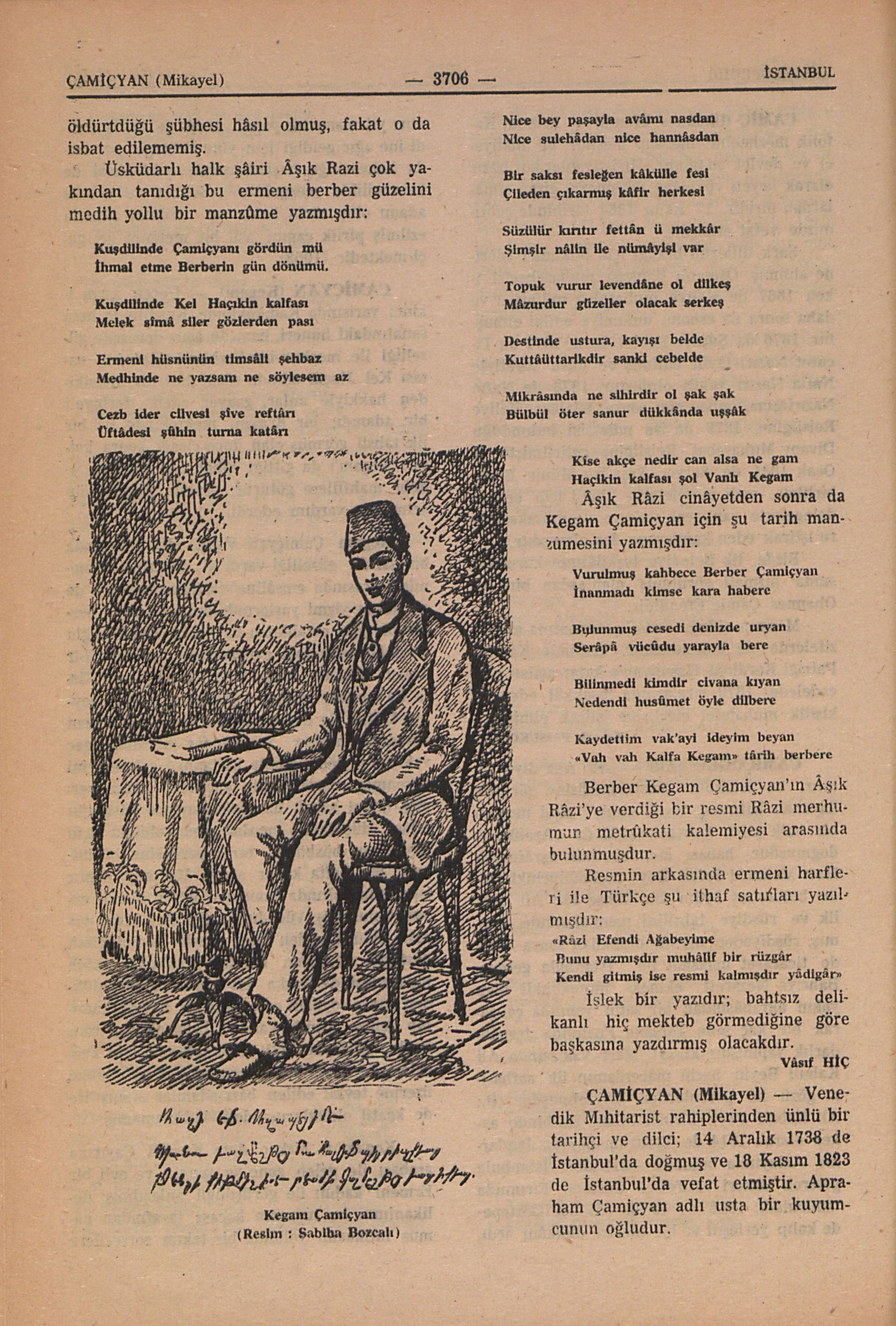 Kegam Çamiçyan Vanlı idi; simasında bir şarklı güzelliği vardı ki İstanbul Ermenileri arasında emsâline rastlanmaz; 1888 de on dokuz yirmi yaşlarında bulunan genc berber bir gün ortalıkdan kayboldu. Kel Haçiğin Yeldeğirmenindeki evinde yatar kalkardı, bir akşam dükânı kapadıktan sonra Haçik Usta ile beraber çarşıya uğramışlar, alınan şeyleri kalfası ile eve gönderen Haçik Karakazan adındaki meşhur meyhâneye uğramış, geç vakit eve döndüğünde kalfanın gelmediğini öğrenmiş, merâk edip karakola haber vermiş, ertesi sabah da görünmeyince büsbütün telâşa düşülmüş, mazbut genc olduğu için kayboluşu büsbütün esrar perdesine bürünmüş; bir hafta kadar sonra Kadıköy Vapur iskelesinin altında tamamen uryan olarak cesedi bulunmuş; vücûdunda üç dört bıçak yarası, öldürülmeden önce hayli dövüldüğünü gösteren çürükler, bereler görülmüş. Tabib muayenesinde başka bir yerde ...