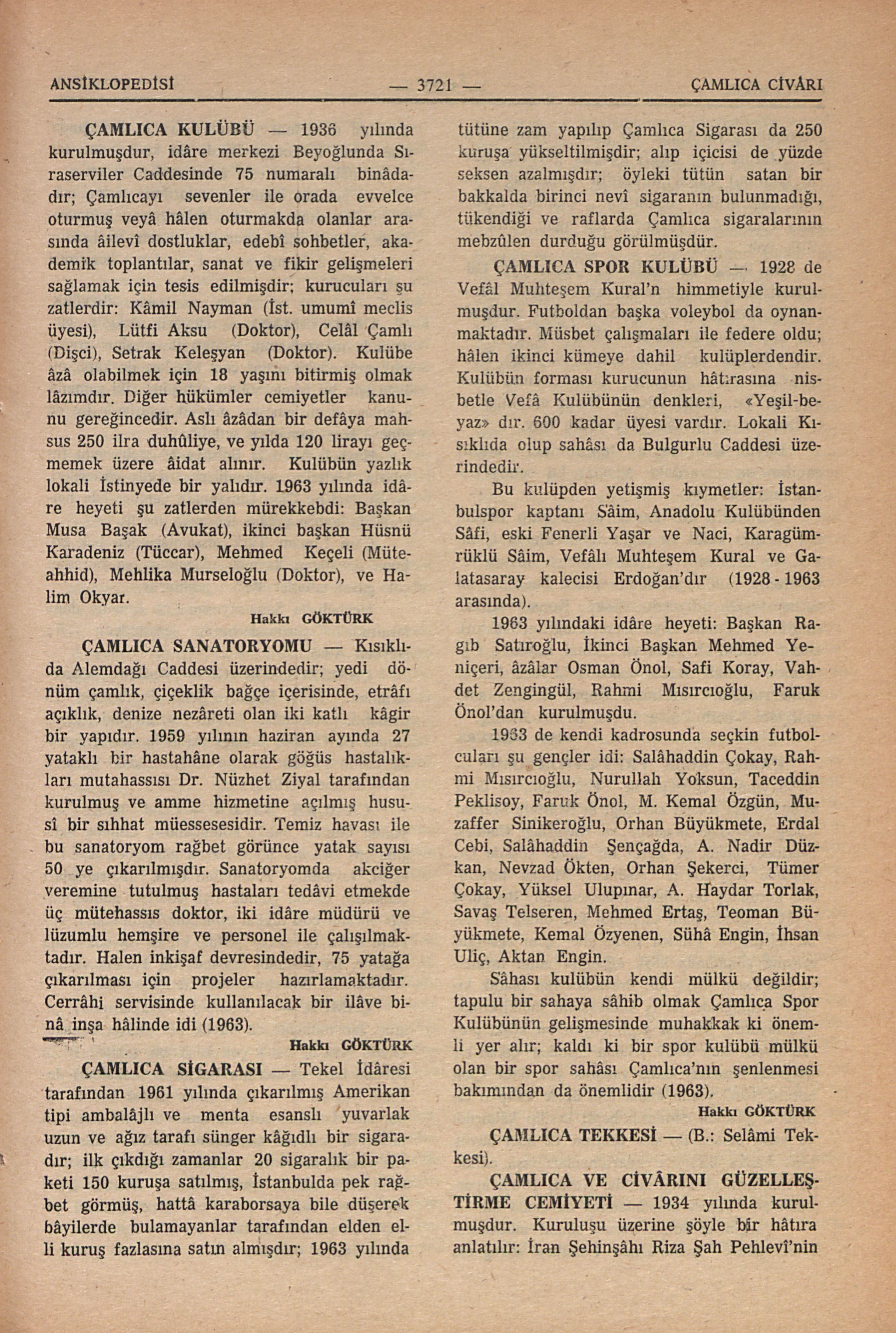 1936 yılında kurulmuşdur, idâre merkezi Beyoğlunda Sıraserviler Caddesinde 75 numaralı binâdadır; Çamlıcayı sevenler ile orada evvelce oturmuş veyâ hâlen oturmakda olanlar arasında âilevî dostluklar, edebî sohbetler, akademik toplantılar, sanat ve fikir gelişmeleri sağlamak için tesis edilmişdir; kurucuları şu zatlerdir: Kâmil Nayman (İst. Umumî meclis üyesi), Lütfi Aksu (Doktor), Celâl Çamlı (Dişci), Setrak Keleşyan (Doktor). Kulübe âzâ olabilmek için 18 yaşını bitirmiş olmak lâzımdır. Diğer hükümler cemiyetler kanunu gereğincedir. Aslı âzâdan bir defâya mahsus 250 lira duhûliye, ve yılda 120 lirayı geçmemek üzere âidat alınır. Kulübün yazlık lokali İstinyede bir yalıdır. 1963 yılında idâre heyeti şu zatlerden mürekkebdi: Başkan Musa Başak (Avukat), ikinci başkan Hüsnü Karadeniz (Tüccar), Mehmed Keçeli (Müteahhid), Mehlika Murseloğlu (Doktor), ve Helim Okyar.