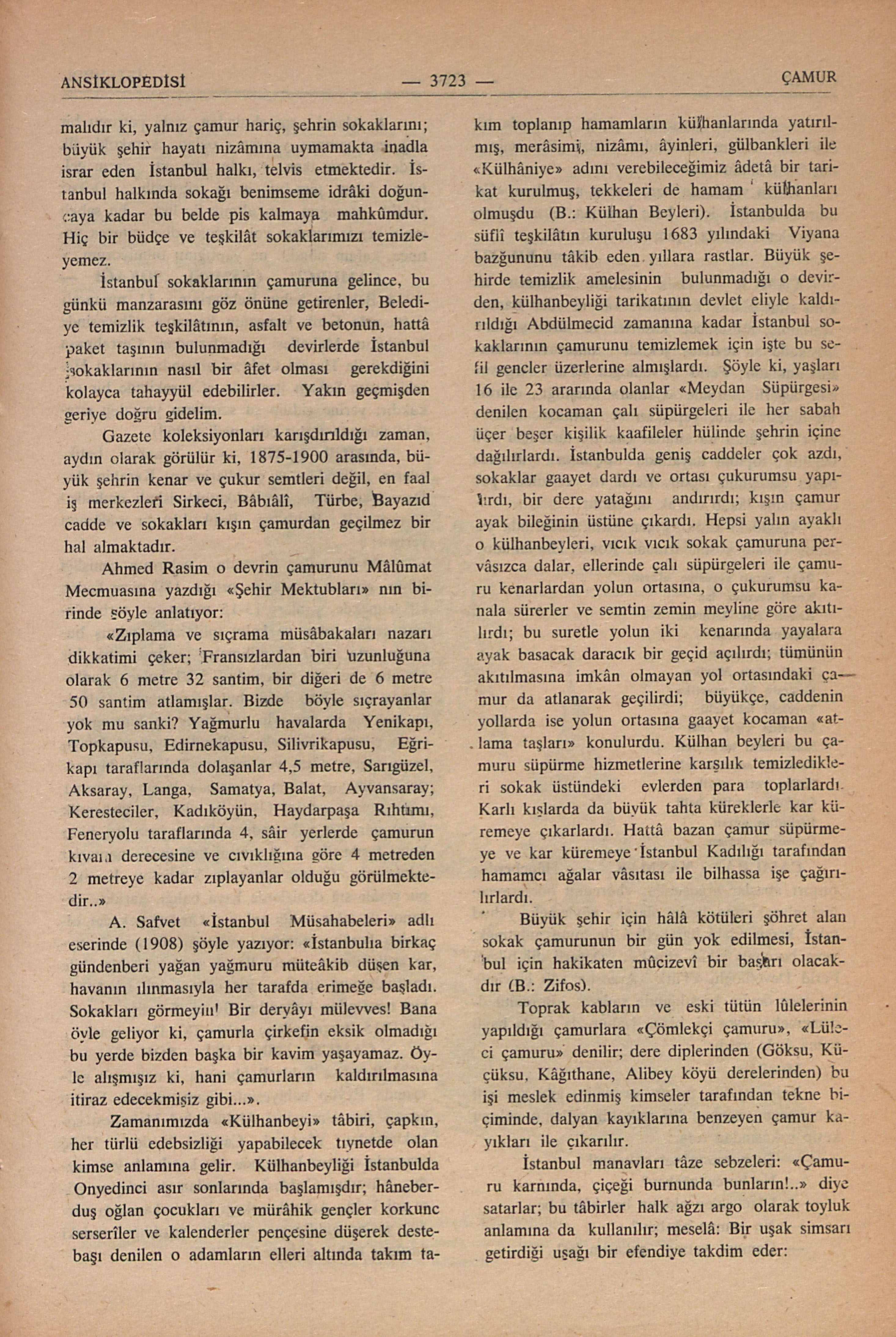 A. Safvet “İstanbul Müsahebeleri” adlı eserinde (1908) şöyle yazıyor: “İstanbula birkaç gündenberi yağan yağmuru müteâkib düşen kar, havanın ılınmasıyla her tarafda erimeğe başladı. Sokakları görmeyin! Bir deryâyı mülevves! Bana öyle geliyor ki, çamurla çirkefin eksik olmadığı bu yerde bizden başka bir kavim yaşayamaz. Öyle alışmışız ki, hani çamurların kaldırılmasına itiraz edecekmişiz gibi...”
