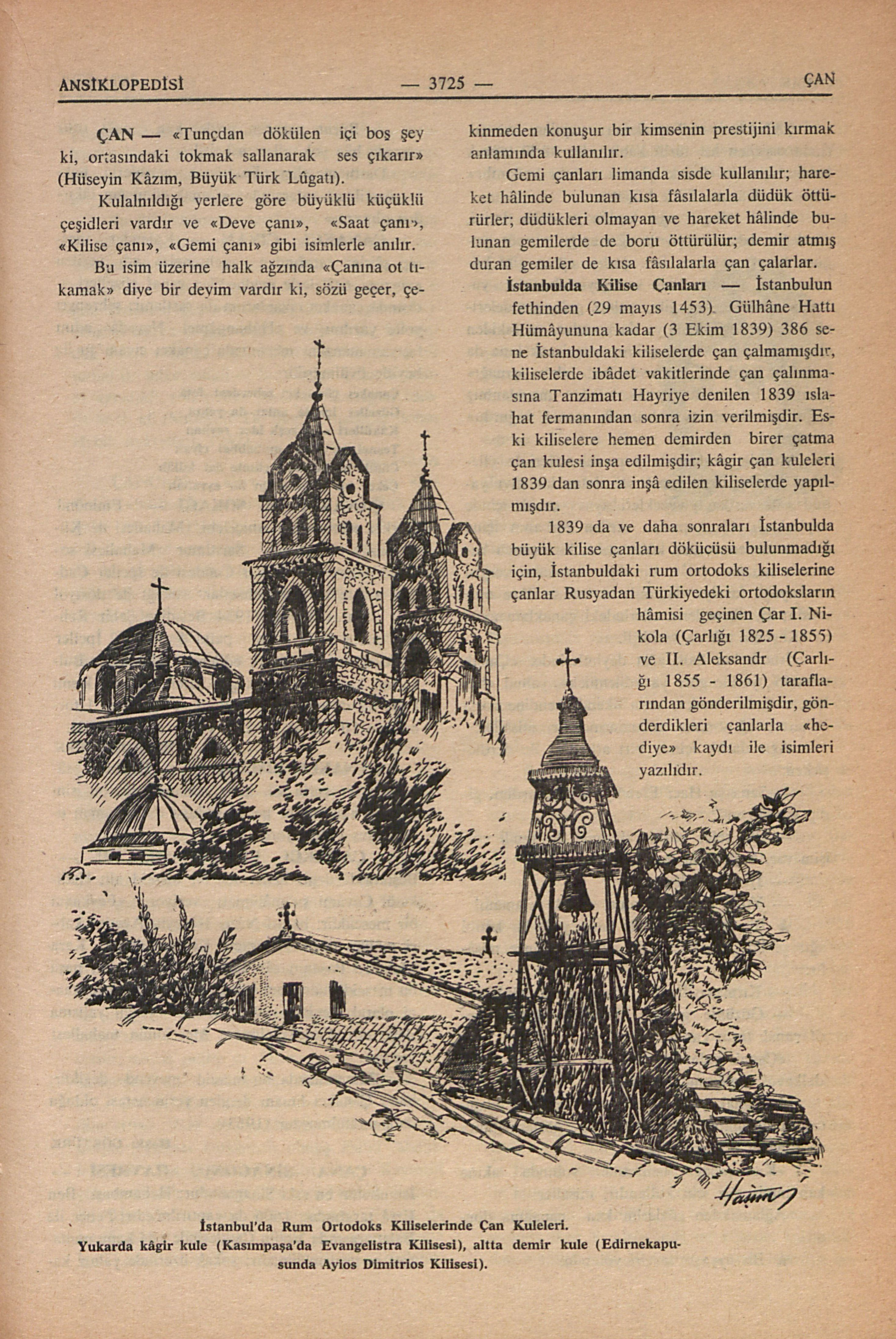 İstanbulda Kilise Çanları — İstanbulun fethinden (29 mayıs 1453) Gülhâne Hattı Hümâyununa kadar (3 Ekim 1839) 386 sene İstanbuldaki kiliselerde çan çalmamışdır; kiliselerde ibâdet vakitlerinde çan çalınmasına Tanzimatı Hayriye denilen 1839 ıslahat fermanından sonra izin verilmişdir. Eski kiliselere hemen demirden birer çatma çan kulesi inşa edilmişdir; kâgir çan kuleleri 1839 dan sonra inşâ kiliselerde yapılmışdır.