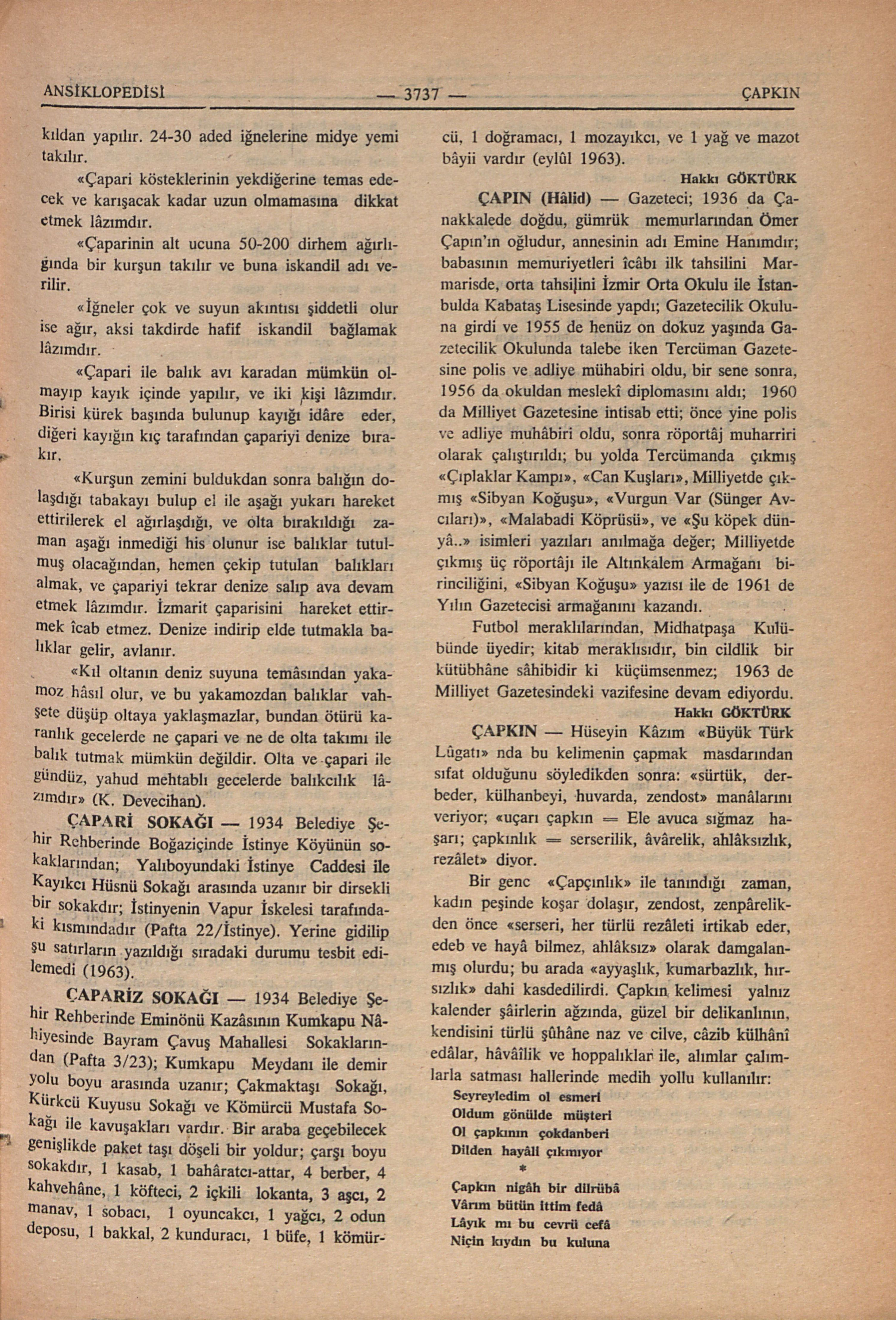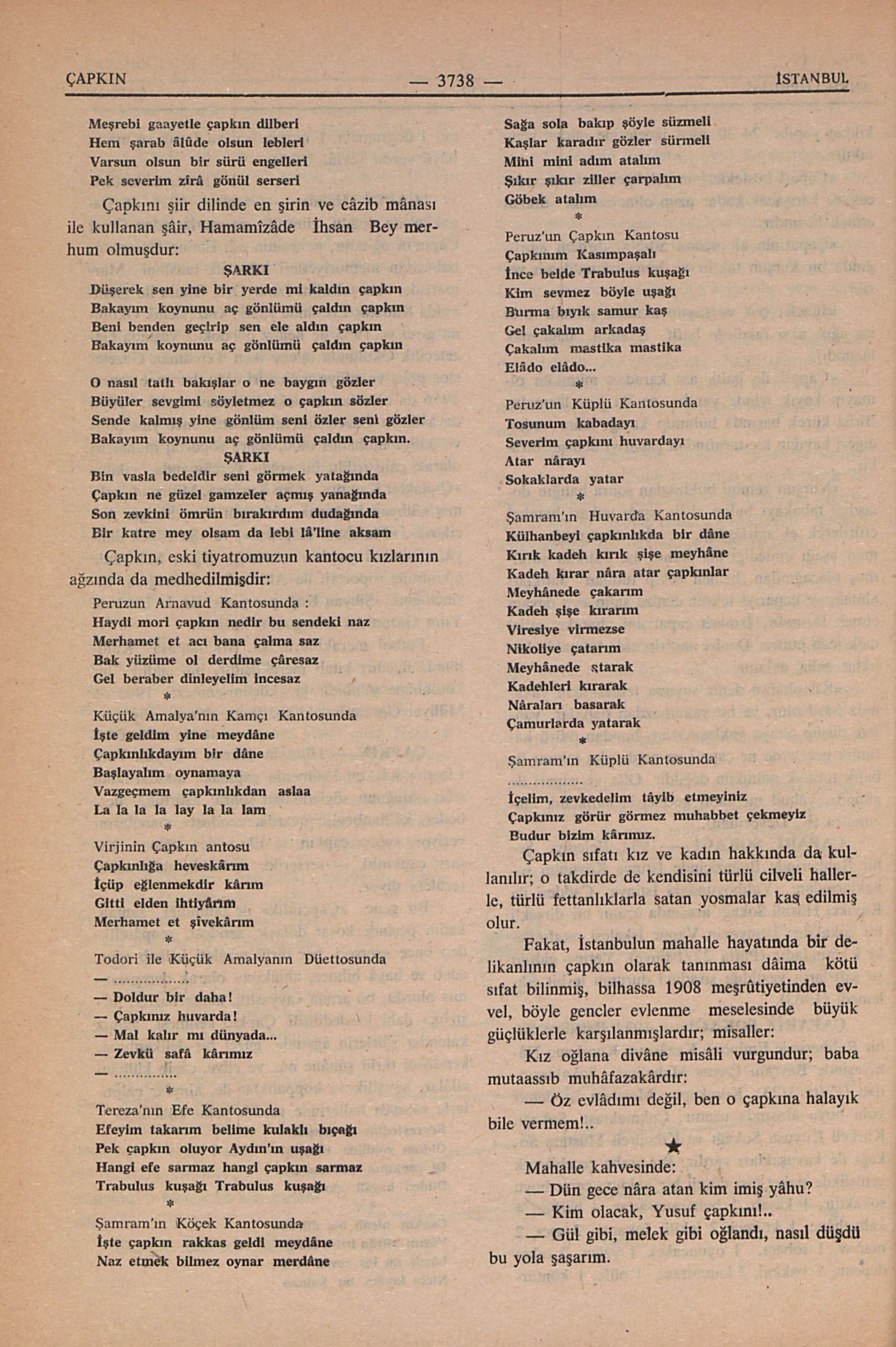 Hüseyin Kâzım “Büyük Türk Lûgatı” nda bu kelimenin çapmak masdarından sıfat olduğunu söyledikten sonra: “sürtük, derbeder, külhanbeyi, huvarda, zendost” manâlarını veriyor; “uçarı çapkın = Ele avuca sığmaz haşarı; çapkınlık = serserilik, âvârelik, ahlâlksızlık, rezâlet” diyor. Bir genc “Çapkınlık” ile tanındığı zaman, kadın şenide koşar dolaşır, zendost, zenpârelikden önce “serseri, her türlü rezâleti irtikab eder, edeb ve hayâ bilmez, ahlâksız” olarak damgalanmış olurdu; bu arada “ayyaşlık, kumarbazlık, hırsızlık” dahi kasdedilirdi. Çapkın kelimesi yalnız kalender şâirlerin ağzında, güzel bir delikanlının, kendisini türlü şûhâne naz ve cilve, câzib külhânî edâlar, hâvâîlik ve hoppalıklar ile, alımlar çalımlarla satması hallerinde medih yollu kullanılır: Seyreyledim ol esmeri Oldum gönülde müşteri Ol çapkının çokdanberi Dilden hayâli çıkmıyor * Çapkın nigâh bir dilrübâ Vârım bütün ittim fedâ Lâyık mı bu cevrü cefâ Niçin kıydın mu kuluna Meşrebi gaayetle çapkın dilberi Hem şarab âlûde olsun lebleri Varsun olsun bir sürü engelleri Pek severim zîrâ gönül serseri Çapkını şiir dilinde en şirin ve câzib mânası ile kullanan şâir, Hamamîzâde İhsan Bey merhum olmuşdur: ŞARKI Düşerken sen yine bir yerde mi kaldın çapkın Bakayım koynunun aç gönlümü çaldın çapkın Beni benden geçirip sen ele aldın çapkın Bakayım koynunu aç gönlümü çaldın çapkın O nasıl tatlı bakışlar o ne baygın gözler Büyüler sevgimi söyletmez o çapkın sözler Sende kalmış yine gönlüm seni özler seni gözler Bakayım koynunu aç gönlümü çaldın çapkın ŞARKI Bin vasla bedeldir seni görmek yatağında Çapkın ne güzel gamzeler açmış yanağında Son zevkini ömrün bırakırdım dudağında Bir katre mey olsam da lebi lâ’line aksam Çapkın, eski tiyatromuzun kantocu kızlarının ağzında da medheldilmişdir: Peruzun Arnavud Kantosunda : Haydi mori çapkın nedir bu sendeki naz Merhamet et acı bana çalma saz Bak yüzüme ol derdime çâresaz Gel beraber dinleyelim incesaz * Küçük Amalya’nın Kamçı Kantosunda İşte geldim yine meydâne Çapkınlıkdayım bir dâne Başlayalım oynamaya Vazgeçmem çapkınlıkdan aslaa La la la la lay la la lam * Virjinin Çapkın antosu Çapkınlığa heveskârım İçüp eğlenmekdir kârım Gitti elden ihtiyârım Merhamet et şîvekârım * Todori ile Küçük Amalyanın Düettosunda — ..................... — Doldur bir daha! — Çapkınız huvarda! — Mal kalır mı dünyada... — Zevkü safâ kârımız —....................... * Tereza’nın Efe Kantosunda Efeyim takarım belime kulaklı bıçağı Pek çapkın oluyor Aydın’ın uşağı Hangi efe sarmaz hangi çapkın sarmaz Trabulus kuşağı Trabulus kuşağı * Şamram’ın Köçek Kondusunda İşte çapkın rakkas geldi meydâne Naz etmek bilmez oynar merdâne Sağa sola bakıp şöyle süzmeli Kaşlar karadır gözler sürmeli Mini mini adım atalım Şıkır şıkır ziller çarpalım Göbek atalım * Peruz’un Çapkın Kantosu Çapkınım Kasımpaşalı İnce belde Trabulus kuşağı Kim sevmez böyle uşağı Burma bıyık samur kaş Gel çakalım arkadaş Çakalım mastika mastika Elâdo elâdo… * Peruz’un Küplü Kantosunda Tosunum kabadayı Severim çapkını huvardayı Atar nârayı Sokaklarda yatar * Şamram’ın Huvarda Kantosunda Külhanbeyi çapkınlıkda bir dâne Kırık kadeh kırık şişe meyhâne Kadeh kırar nâra atar çapkınlar Meyhânede çakarım Kadeh şişe kırarım Viresiye virmezse Nikoliye çatarım Meyhânede atarak Kadehleri kırarak Nîraları basarak Çamurlarda yatarak * Şahram’ın Küplü Kantosunda ....................... İçelim, zevkedelim tâyib etmeyiniz Çapkınız görür görmez muhabbet çekmeyiz Budur bizim kârımız. Çapkın sıfatı kız ve kadın hakkında da kullanılır; o takdirde de kendisini türlü cilveli hallerle, türlü fettanlıklarla satan yosmalar kas edilmiş olur. Fakat, İstanbulun mahalle hayatında bir delikanlının çapkın olarak tanınması dâima kötü sıfat bilinmiş, bilhassa 1908 meşrûtiyetinden evvel, böyle gencler evlenme meselesinde büyük güçlüklerle karşılanmışlardır; misaller: Kız oğlana divâne misâli vurgundur; baba mutaaasıb muhâfazakârdır: — Öz evlâdımı değil, ben o çapkına halayık bile vermem!.. ★ Mahalle kahvesinde: — Dün gece nâra atan kim imiş yâhu? — Kim olacak ,Yusuf çapkını!.. — Gül gibi, melek gibi oğlandı, nasıl düşdü bu yola şaşarım. — Şaşma!.. çocuğun sebebi felâketi babası olacak keratadır.. her akşam çilingir sofrasını kurar, iti haytayı toplar, oğluna da kadehkârlık yapdırır isen olacağı budur.. ★ Kadınlar hamamında dedikodu: — Eskicinin kızı paşa gelini oldu.. — Üstelik paşanın oğlu da bir içim su imiş.. — Çapkının biriymiş diyorlar... — Doğrudur.. öyle olmasaydı eskici kızı alırlar mıydı?. — Desenize kızı para için ateşe attılar. ★ Mahalle kahvesinde: — Saraç Hasan Ustanın başına geleni duydunuz mu? — Ne olmuş.. — Samurkaş Ali’yi yanına çırak aldı ya.. — Evet.. — Çapkın oğlan dün gece Hasan Ustanın çekmecesini kırmış, içinde ne varsa alıp kaçmış.. ★ 1885 Ayasofyada Sancakdar Mahallesinde bütün kadınlar derin bir teessür içindedir; herkesin ağzında ayni söz: “Yazık.. Mutafların oğlu çapkın olmuş!..” — Ne yapmış? — Galatada arpa suyu içerken görmüşler!..